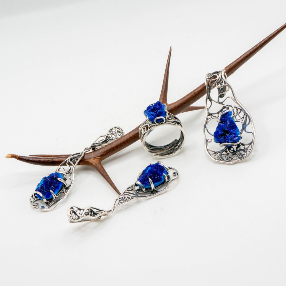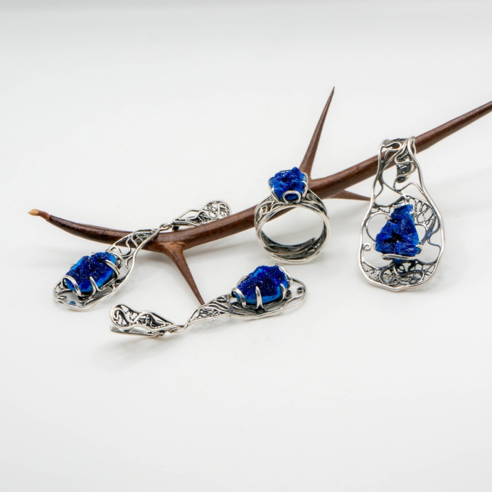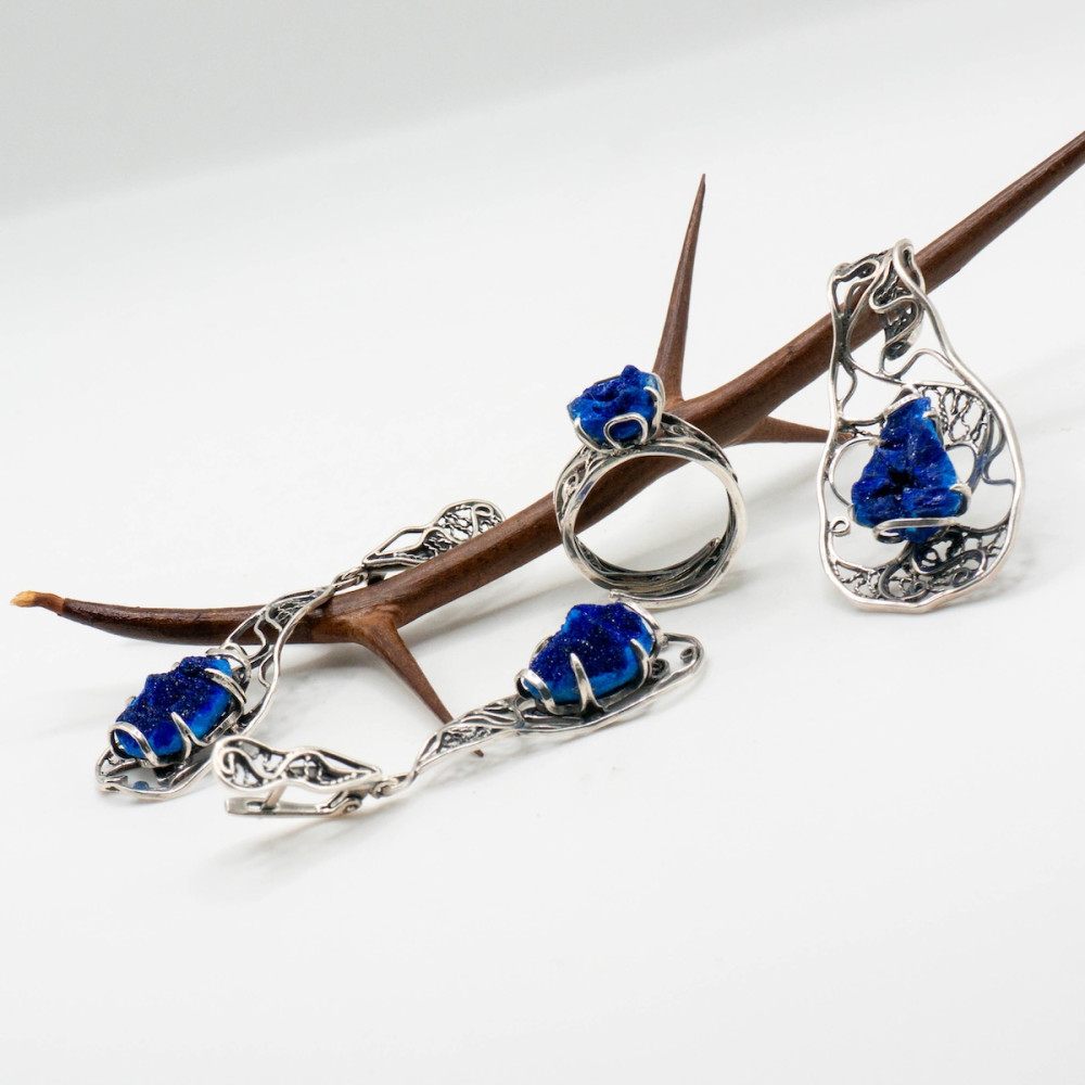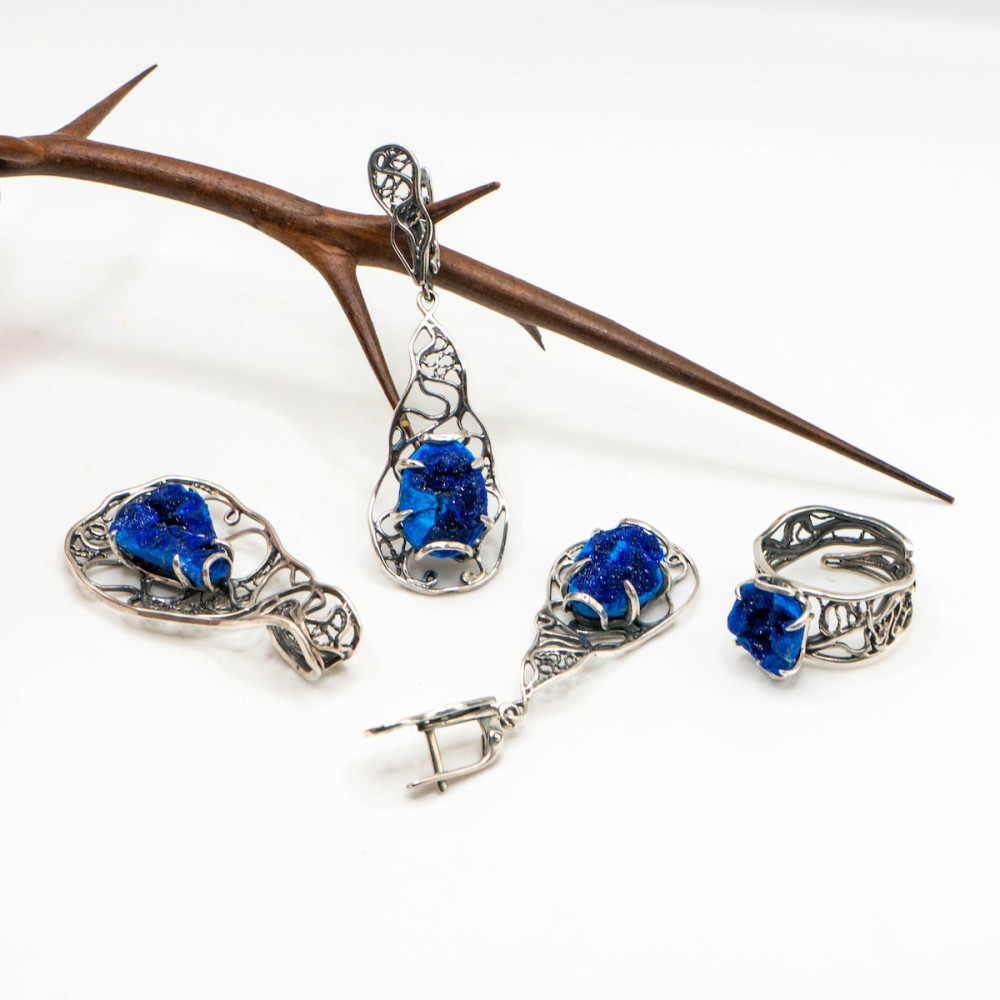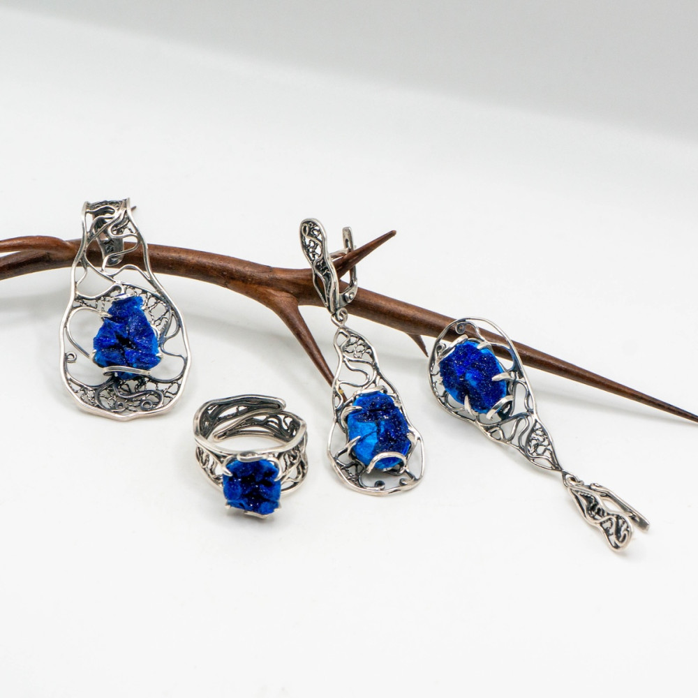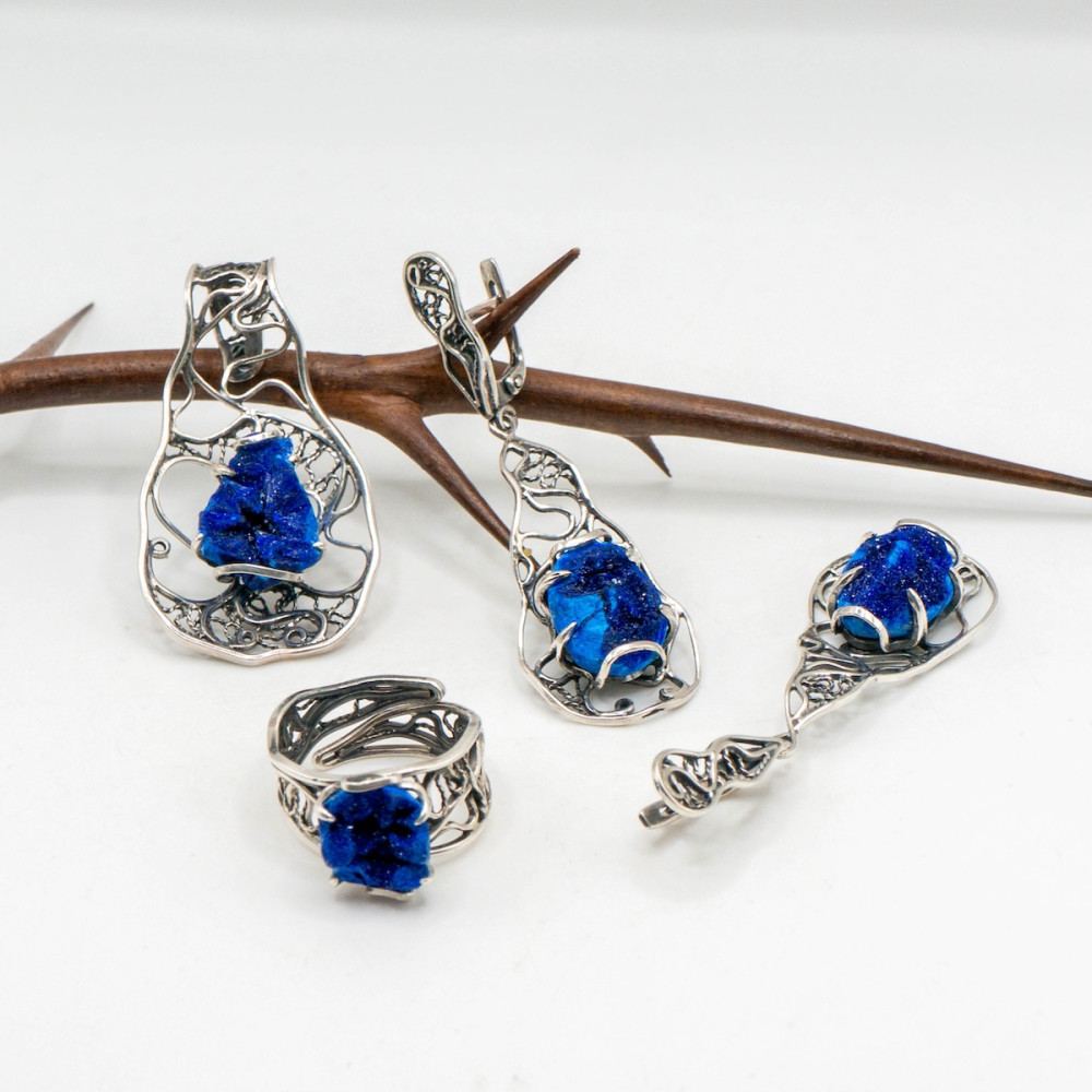 The openwork silver frame of the set with azurite is like a subtle dance of light and shadow, creating a play of light in which each curved pattern seems to be an invitation to look into the soul of a unique azurite. The stone delights the eye with its shades of blue, like a small heavenly miracle, captivating with its beauty.