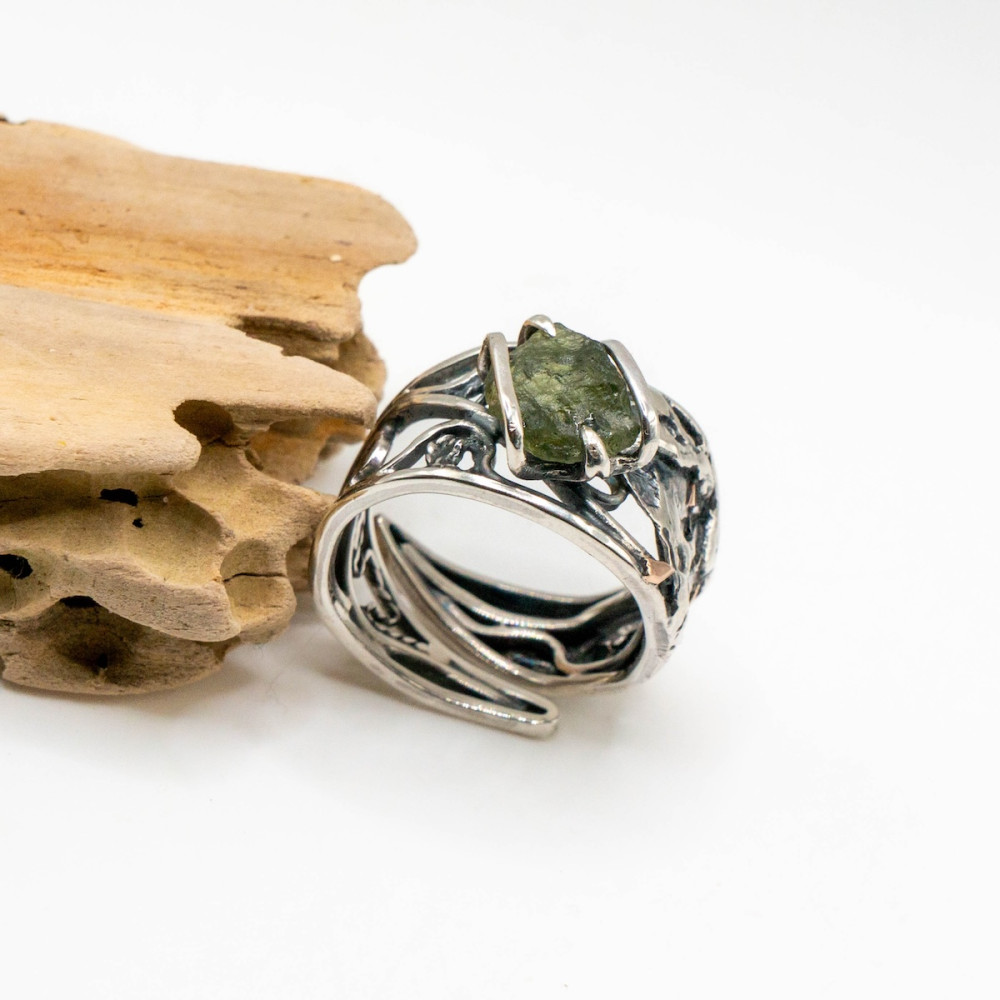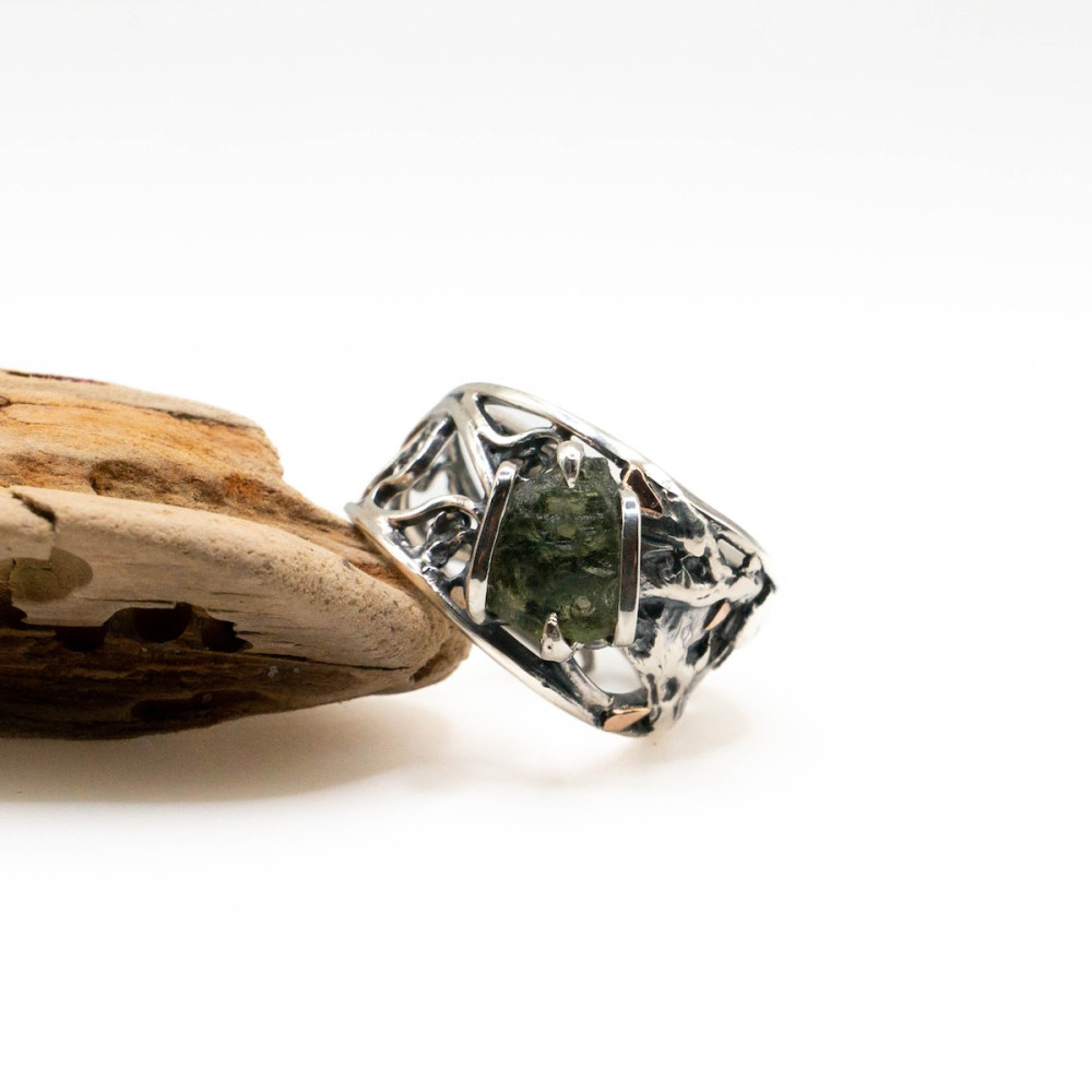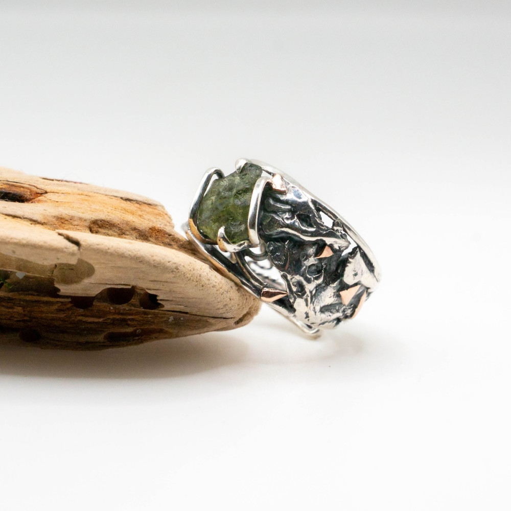 This handcrafted sterling silver ring with moldavite and delicate gold accents is an artisan creation where the stone’s natural energy unfolds with exceptional depth. The raw beauty of the moldavite is enhanced by the contrast of cool silver and the warm glow of gold, both shaped precisely to follow the stone’s organic form. Every line and curve of the metal echoes the mineral’s energy, forming a harmony between nature, silver, and noble gold. A piece for those who value individuality and jewelry with true character.