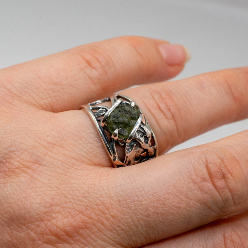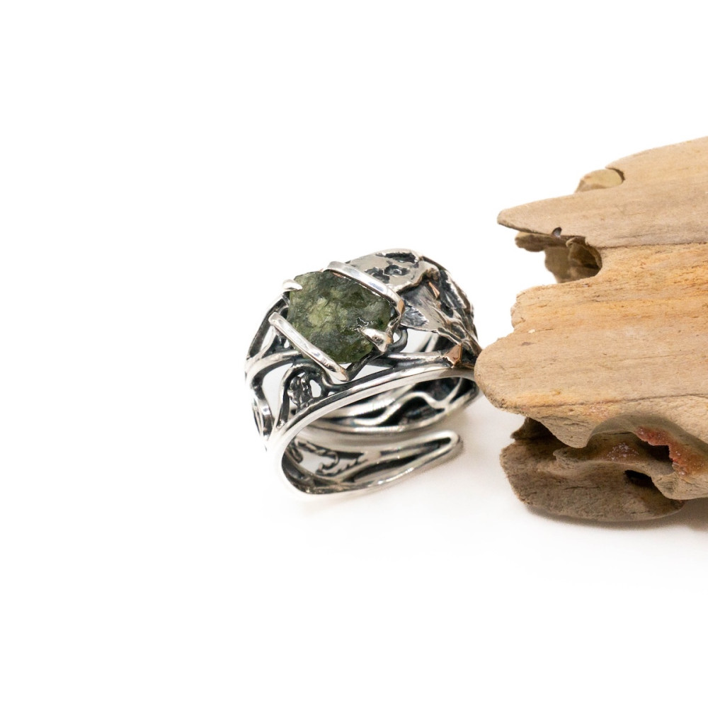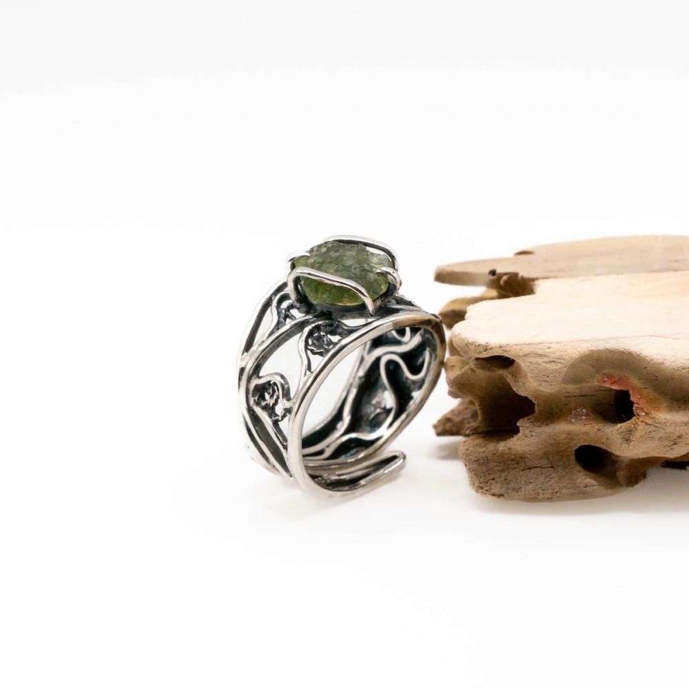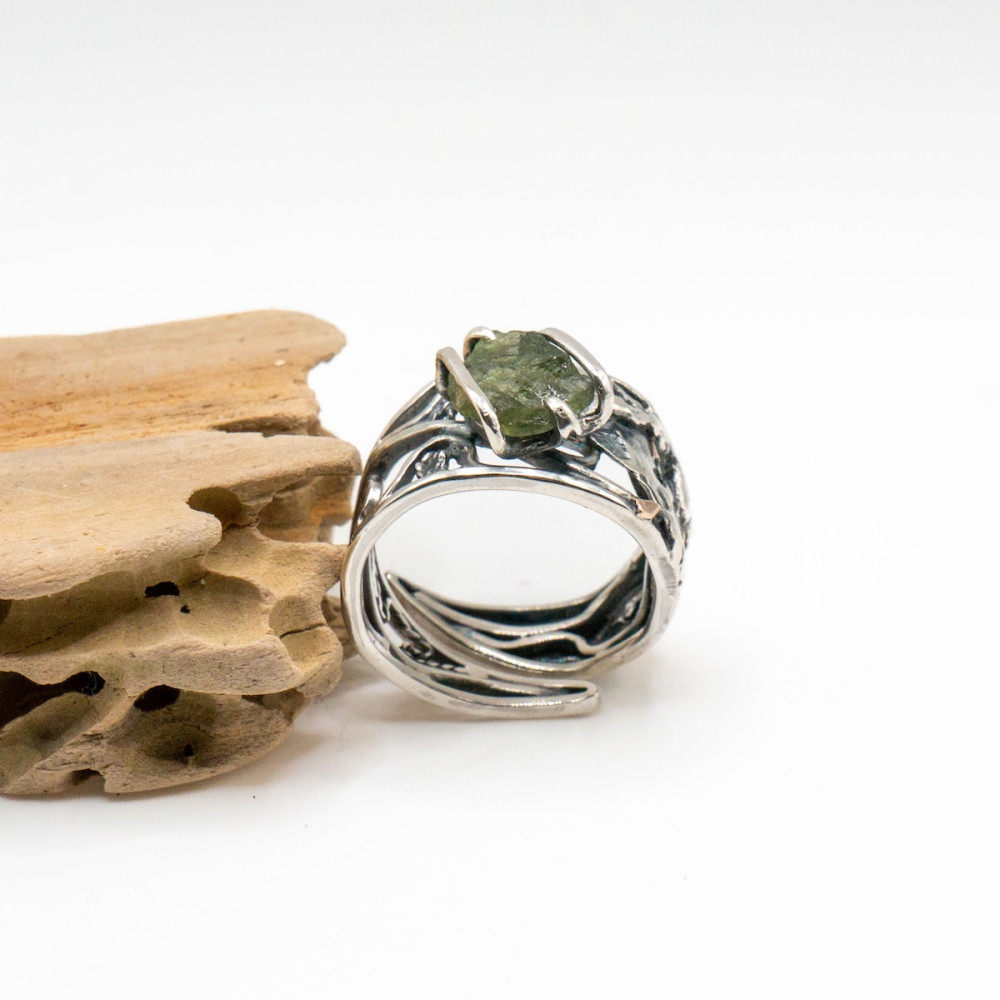 This handcrafted sterling silver ring with moldavite and delicate gold accents is an artisan creation where the stone’s natural energy unfolds with exceptional depth. The raw beauty of the moldavite is enhanced by the contrast of cool silver and the warm glow of gold, both shaped precisely to follow the stone’s organic form. Every line and curve of the metal echoes the mineral’s energy, forming a harmony between nature, silver, and noble gold. A piece for those who value individuality and jewelry with true character.