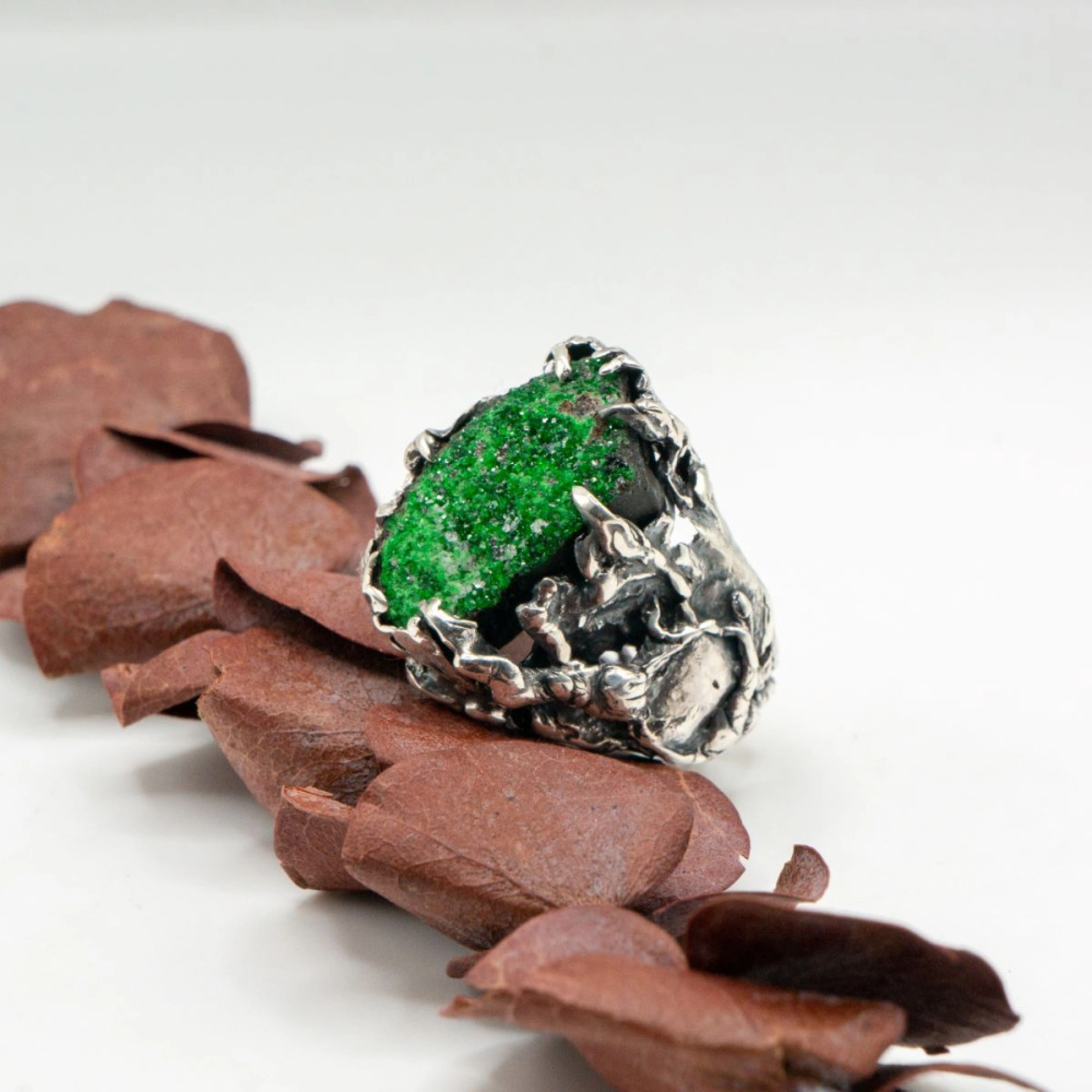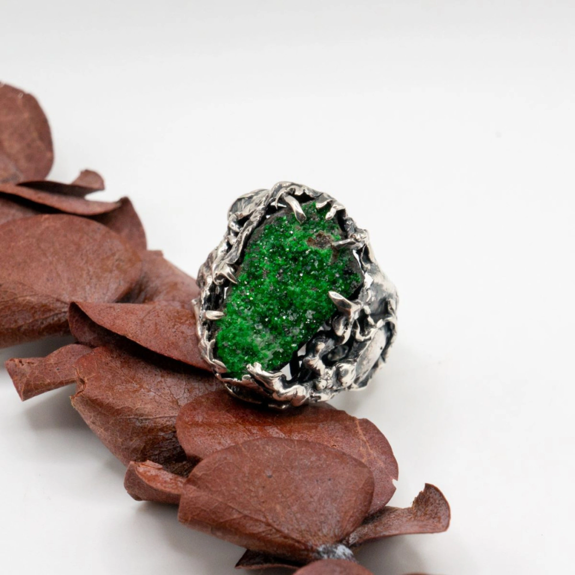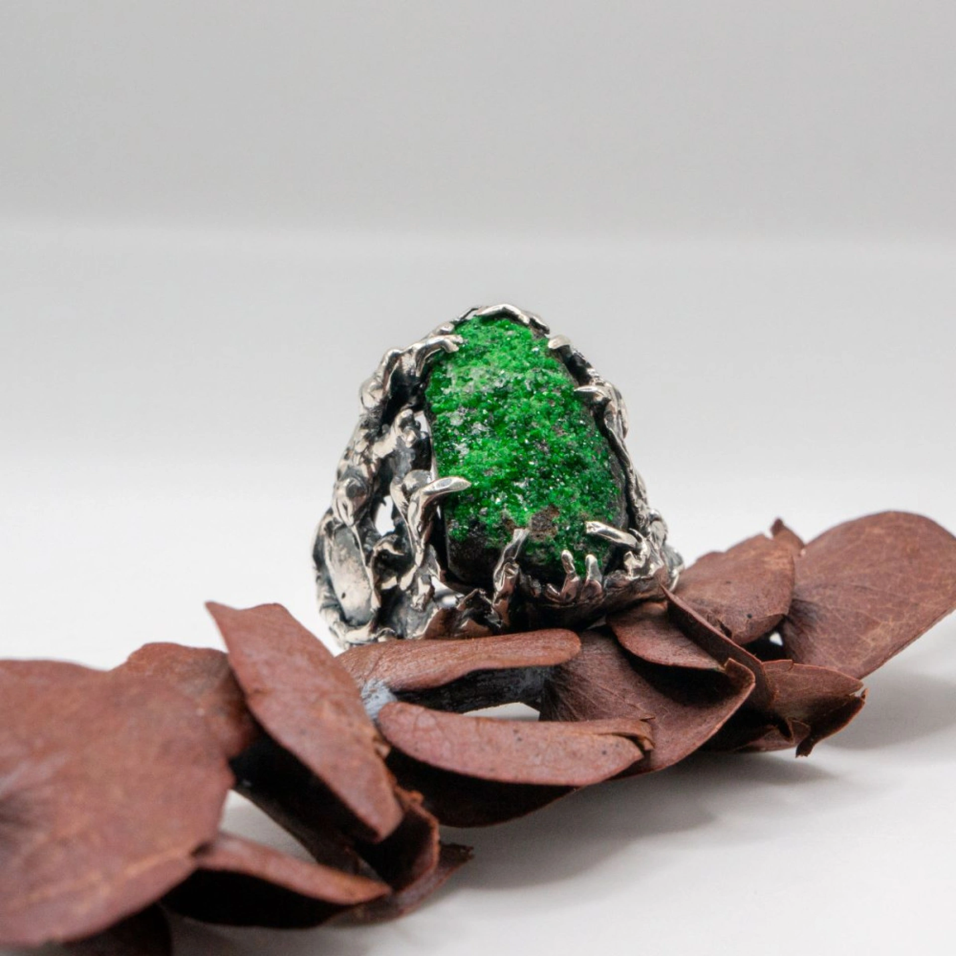I use metal, usually gold and silver, and gemstones and minerals in my work, including pearl, moonstone, sapphire, amethyst, emerald, topaz, smoky quartz, hepatite, black tourmaline and others.