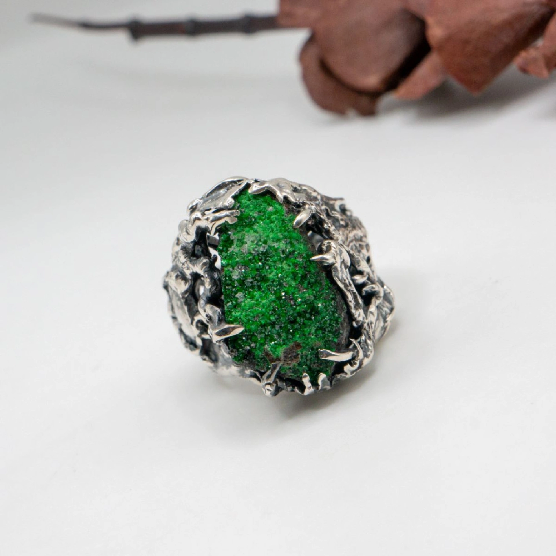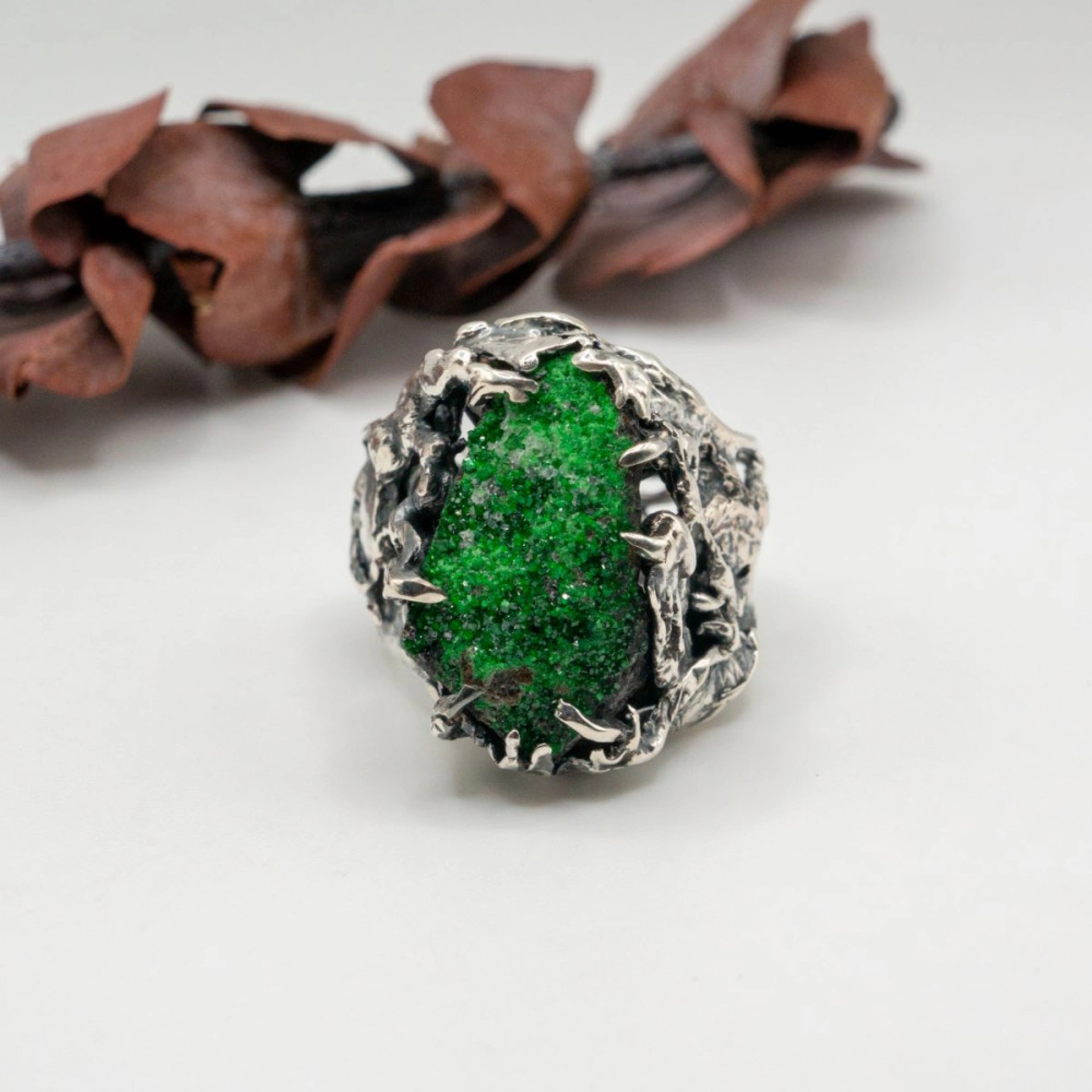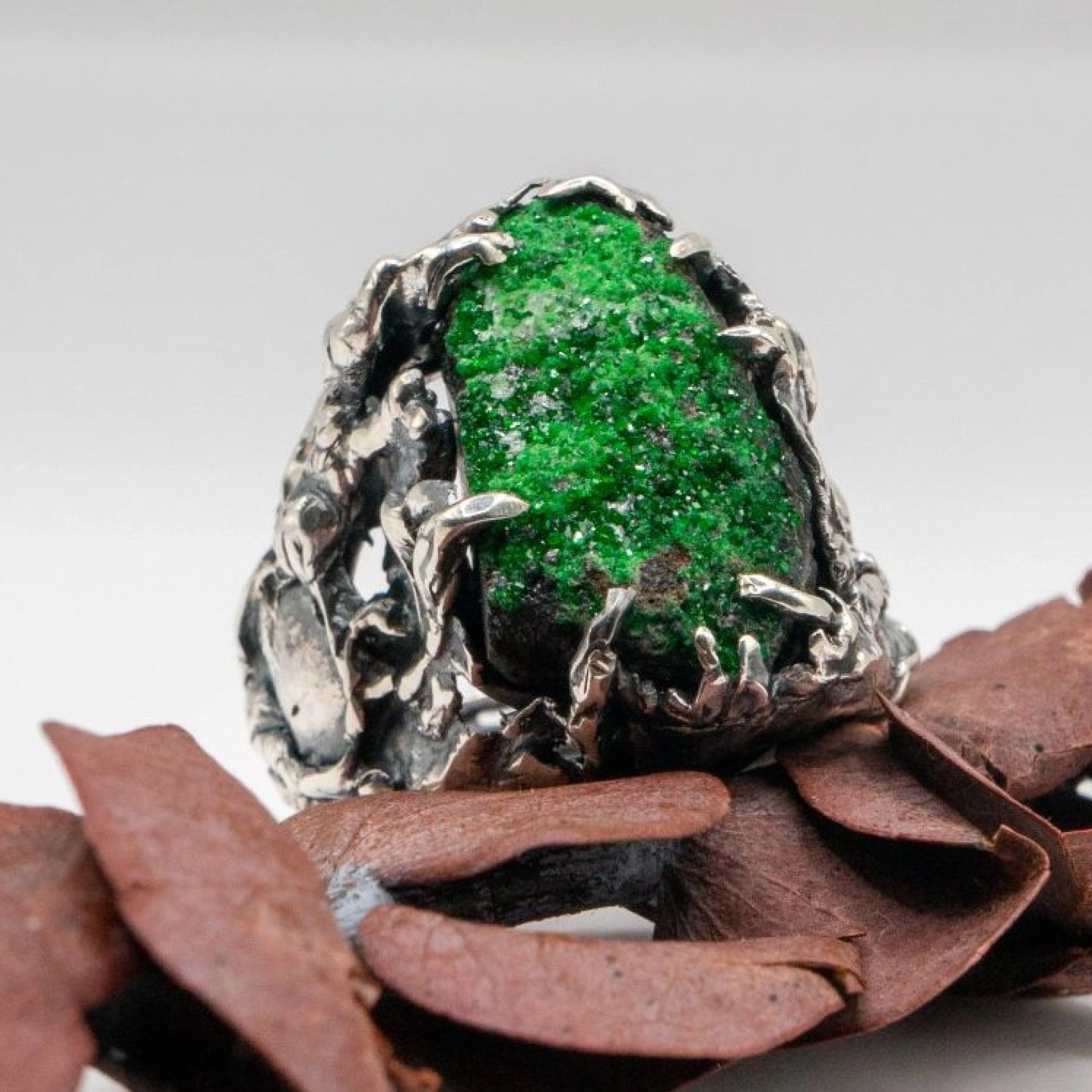 I use metal, usually gold and silver, and gemstones and minerals in my work, including pearl, moonstone, sapphire, amethyst, emerald, topaz, smoky quartz, hepatite, black tourmaline and others.