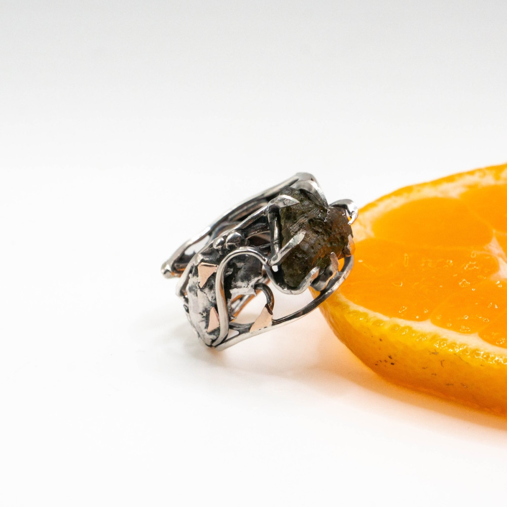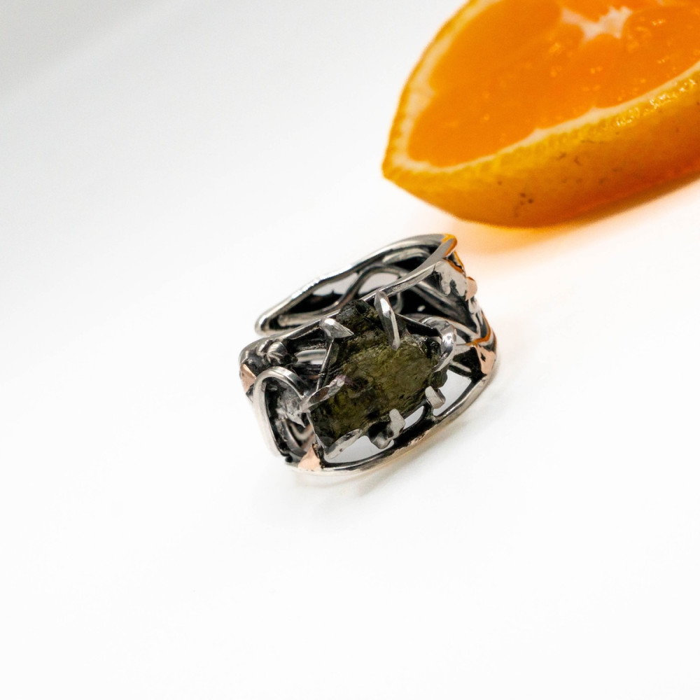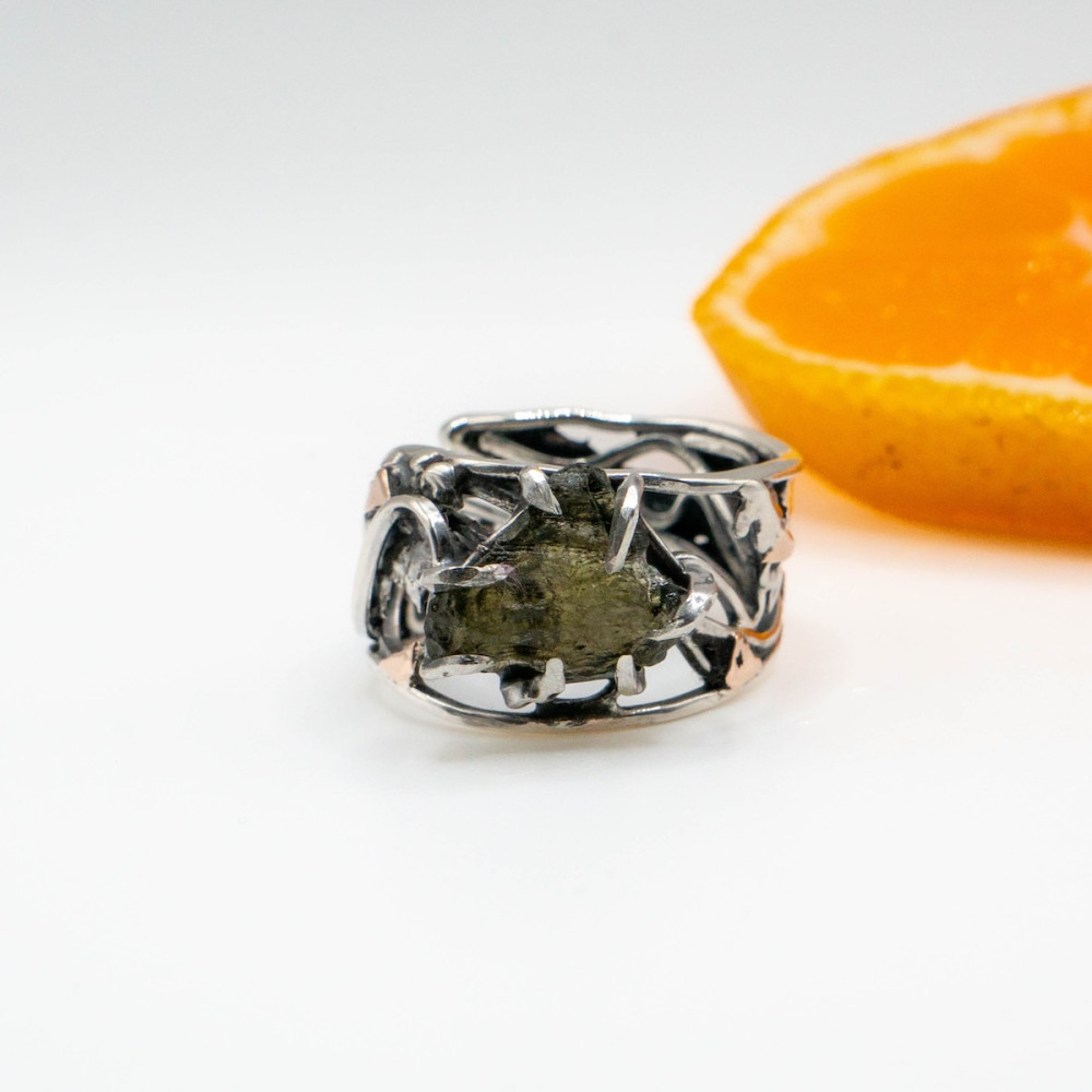 A sterling silver ring with gold accents and raw moldavite — a piece where natural energy meets artisan craftsmanship.