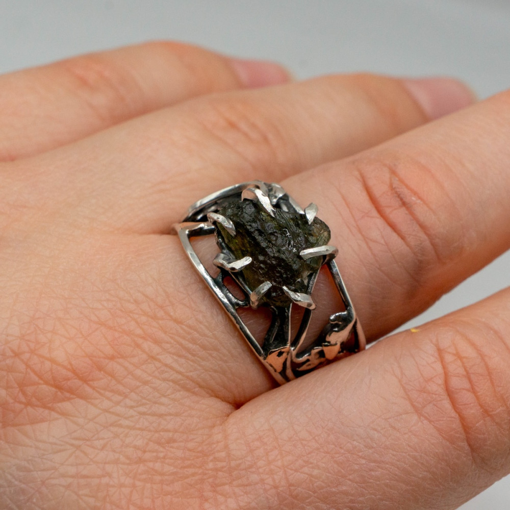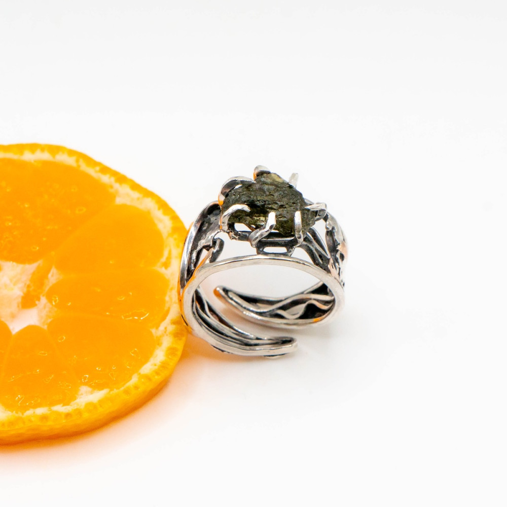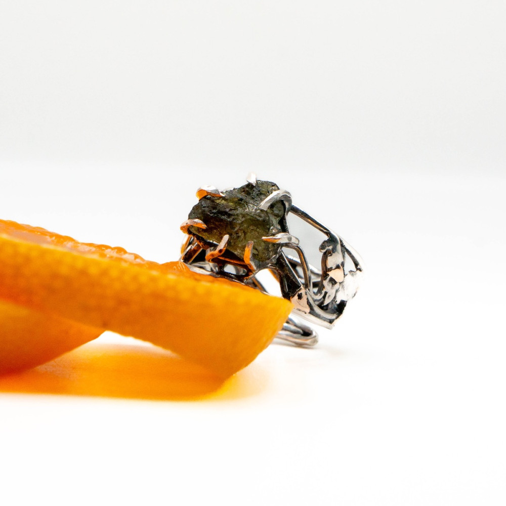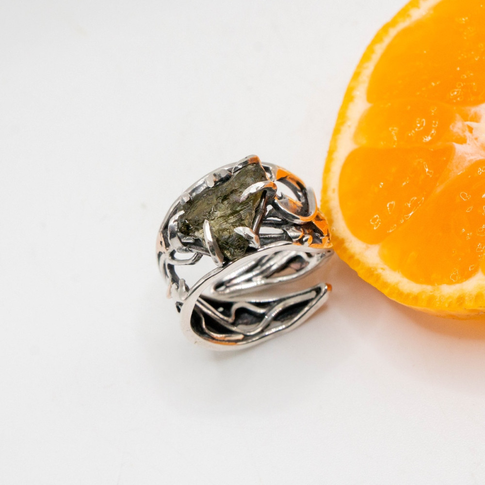 A sterling silver ring with gold accents and raw moldavite — a piece where natural energy meets artisan craftsmanship.
