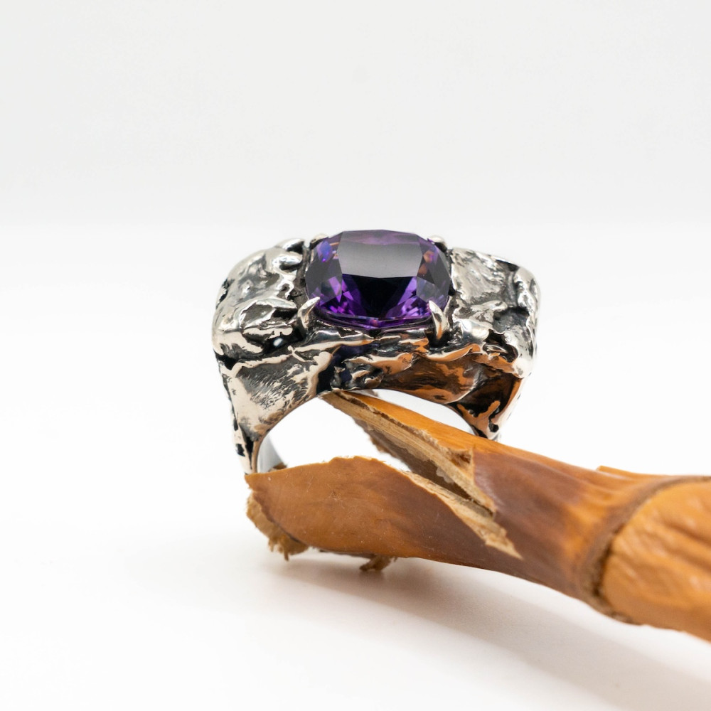 Унікальний витвір ювелірного мистецтва, створений вручну. У центрі – масивний природний аметист із блискучою огранкою, що розкриває всю глибину його фіолетових відтінків. Срібна оправа підкреслює велич каменю та додає прикрасі благородного характеру. Цей перстень стане символом розкоші, сили та індивідуальності.