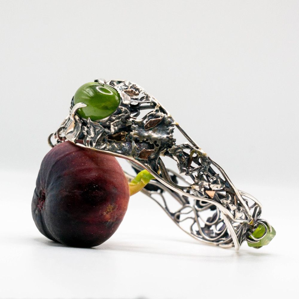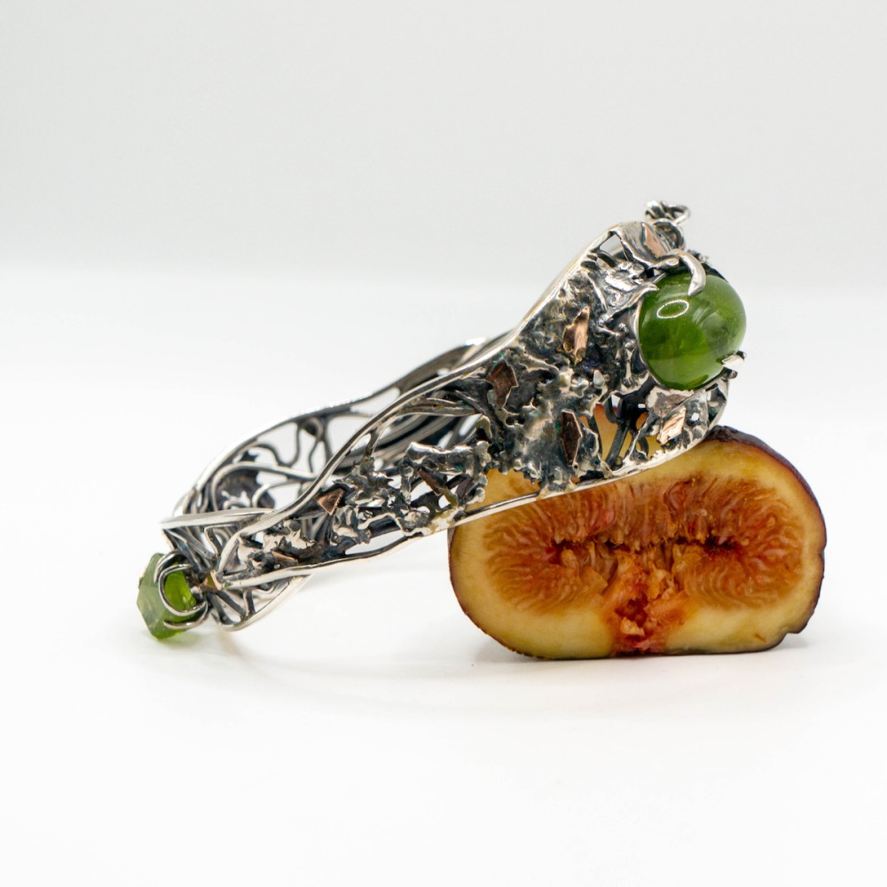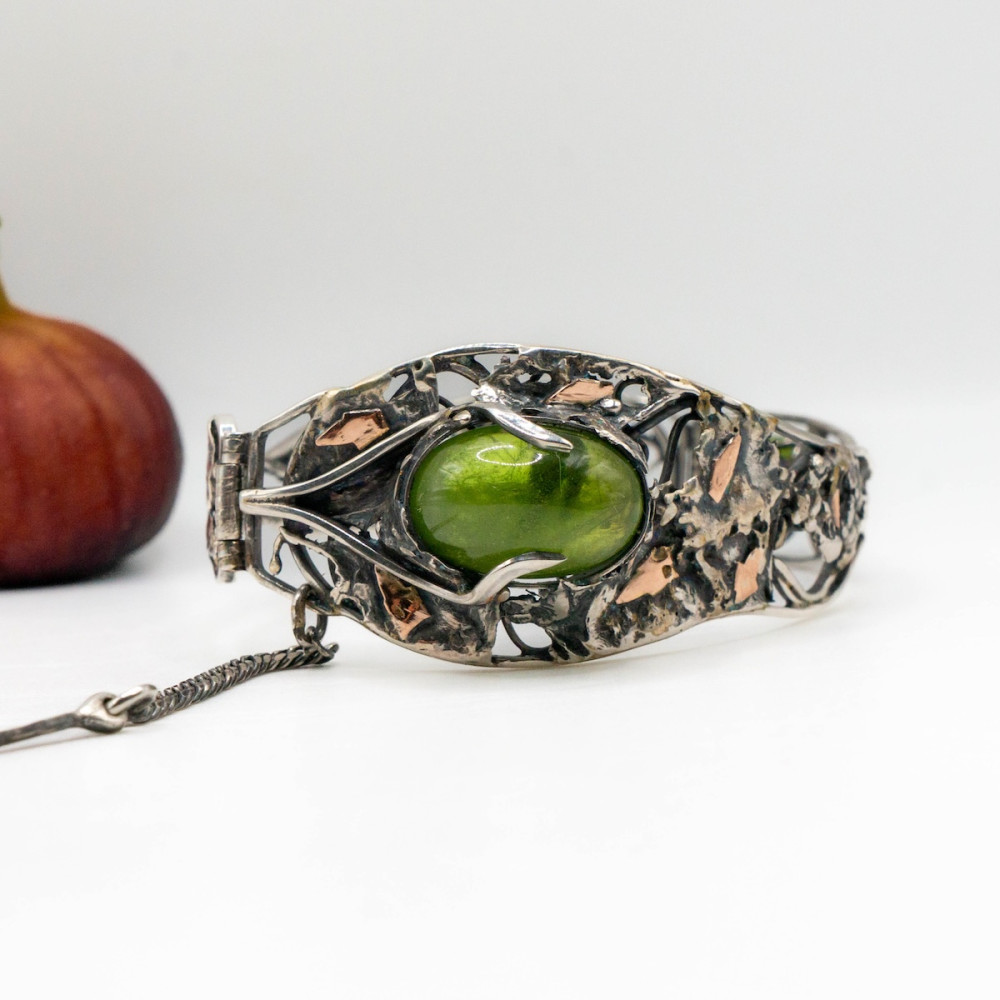 Ажурний браслет зі срібла з вишуканими золотими акцентами оздоблений натуральними хризолітами.