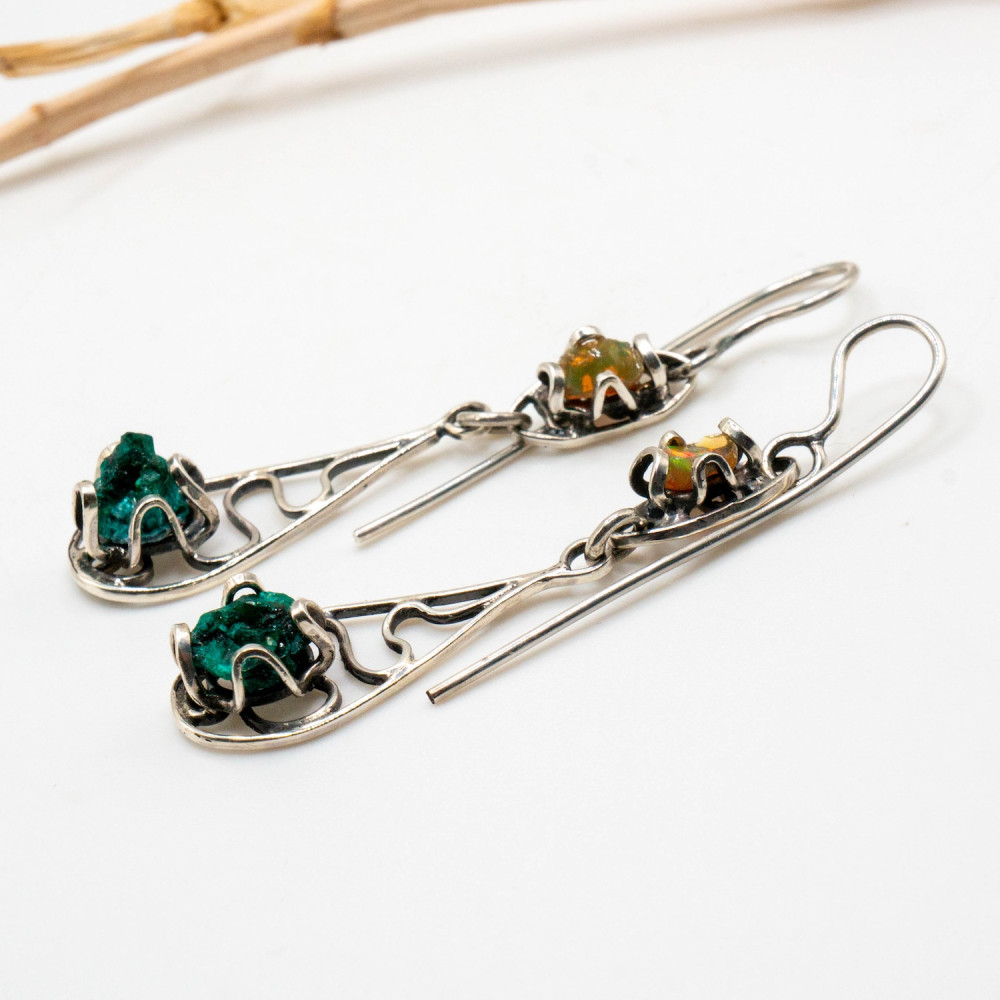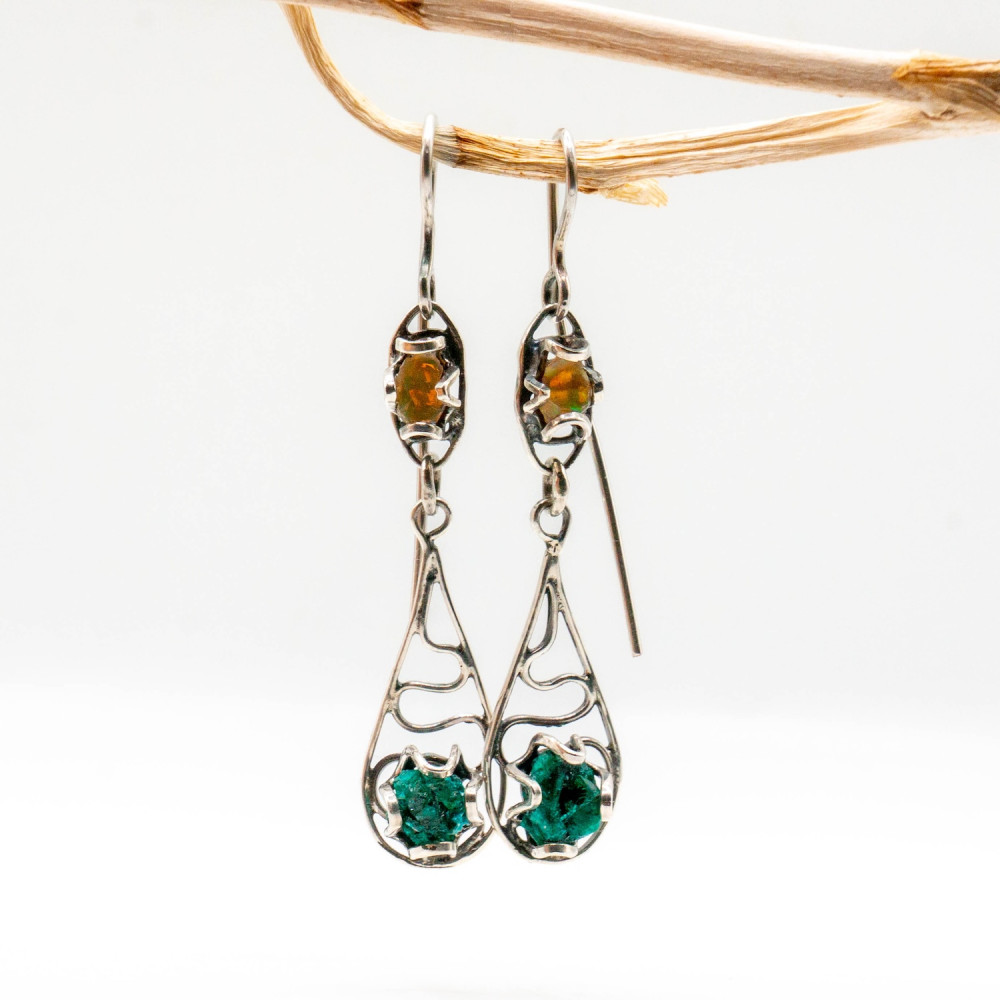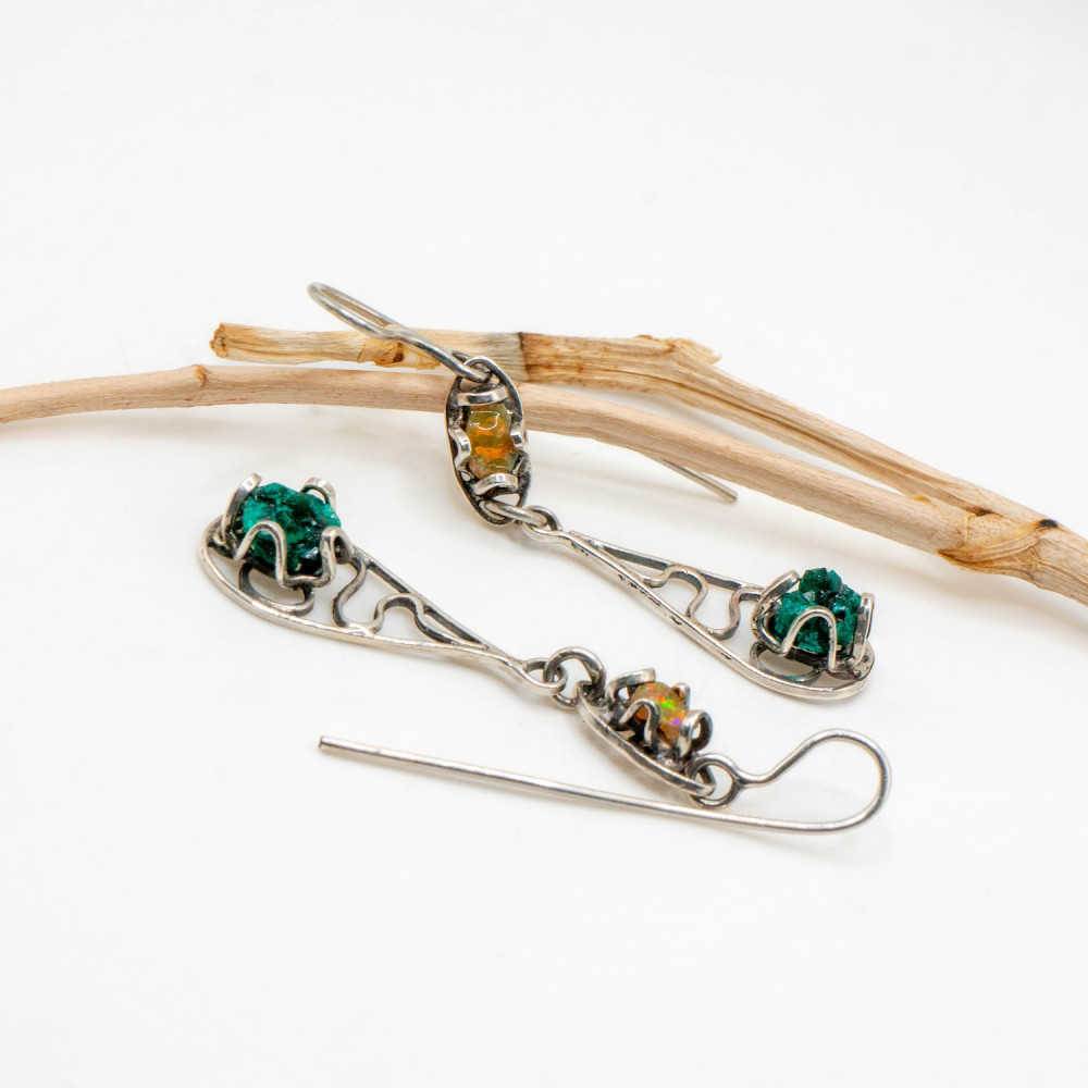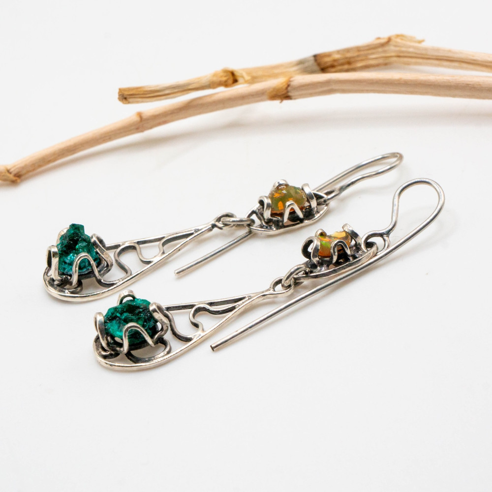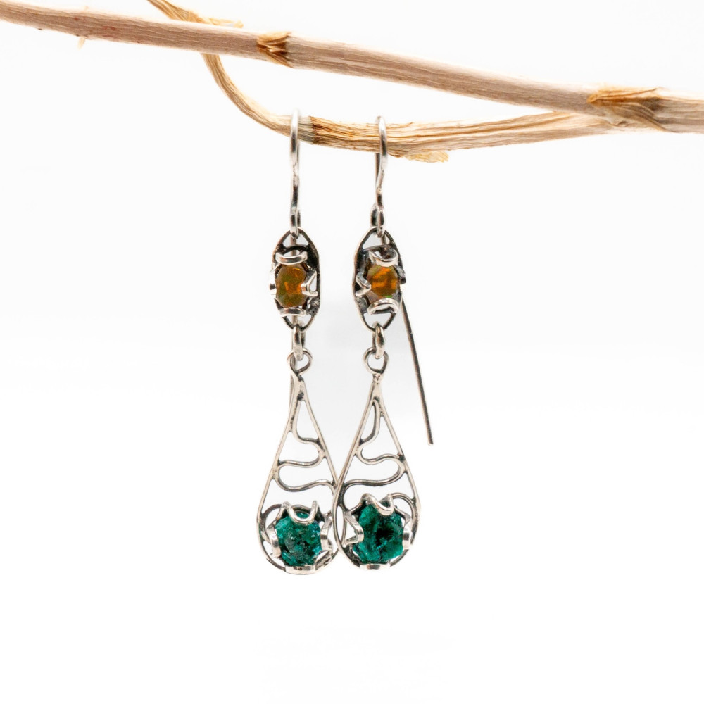 Ці сережки — як витончені срібні силуети, наповнені світлом і глибиною. Подовжена форма створює легкий, вертикальний рух, підкреслюючи лінію шиї. У нижній частині — необроблений діоптаз із насиченою смарагдовою кристалічною структурою, живий і фактурний. У верхньому елементі — невеликий опал теплого медово-помаранчевого відтінку, що додає композиції м’якого вогню.