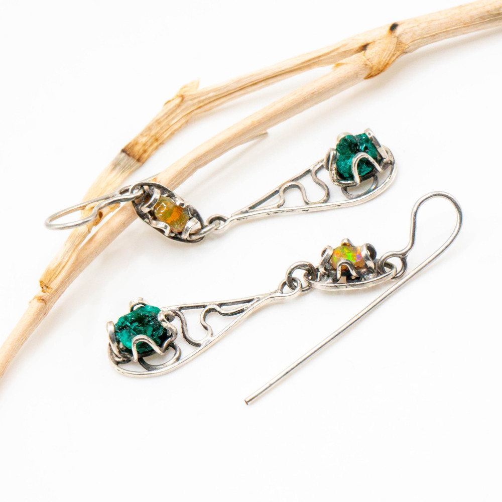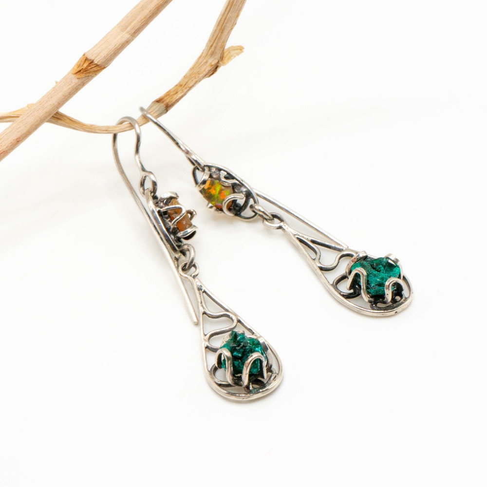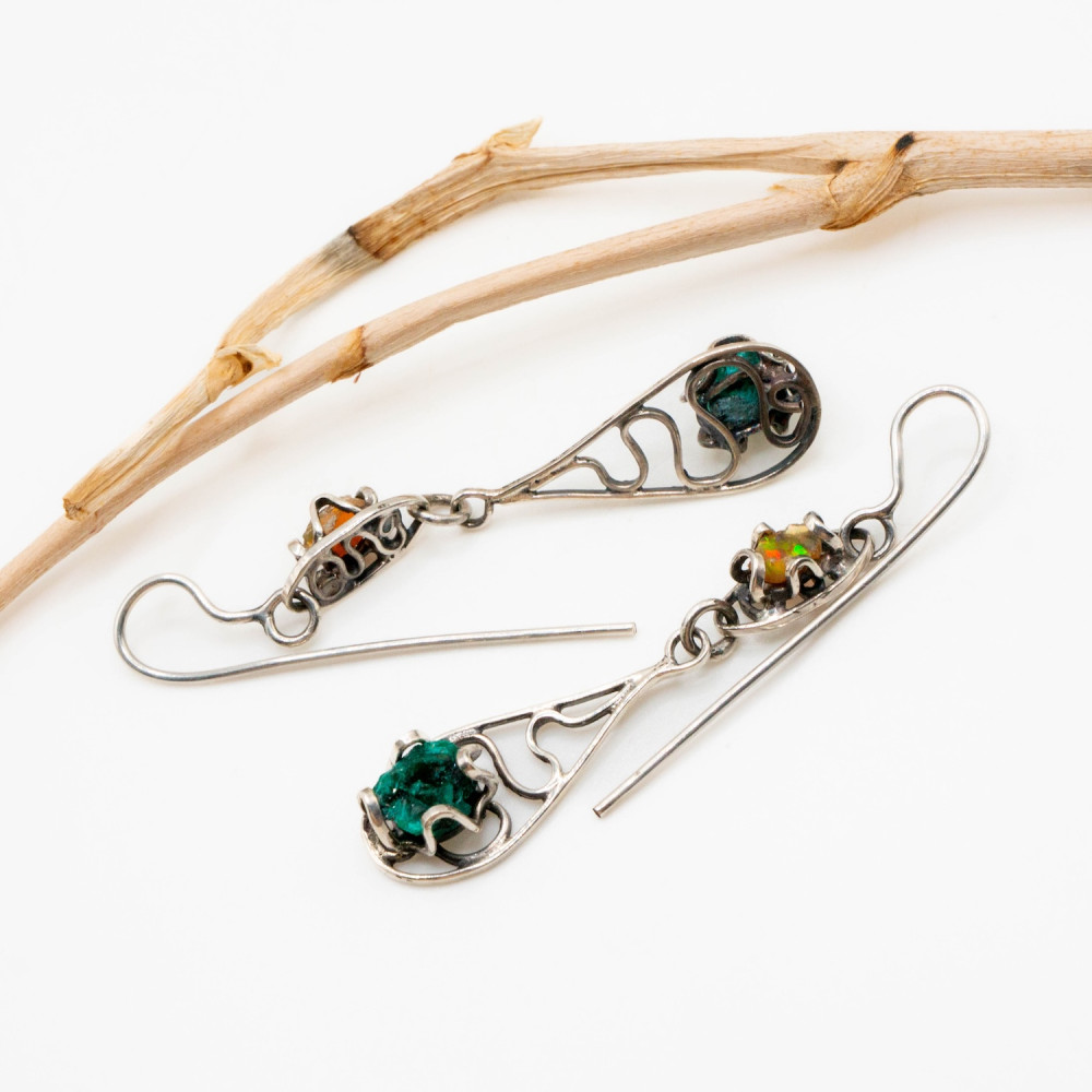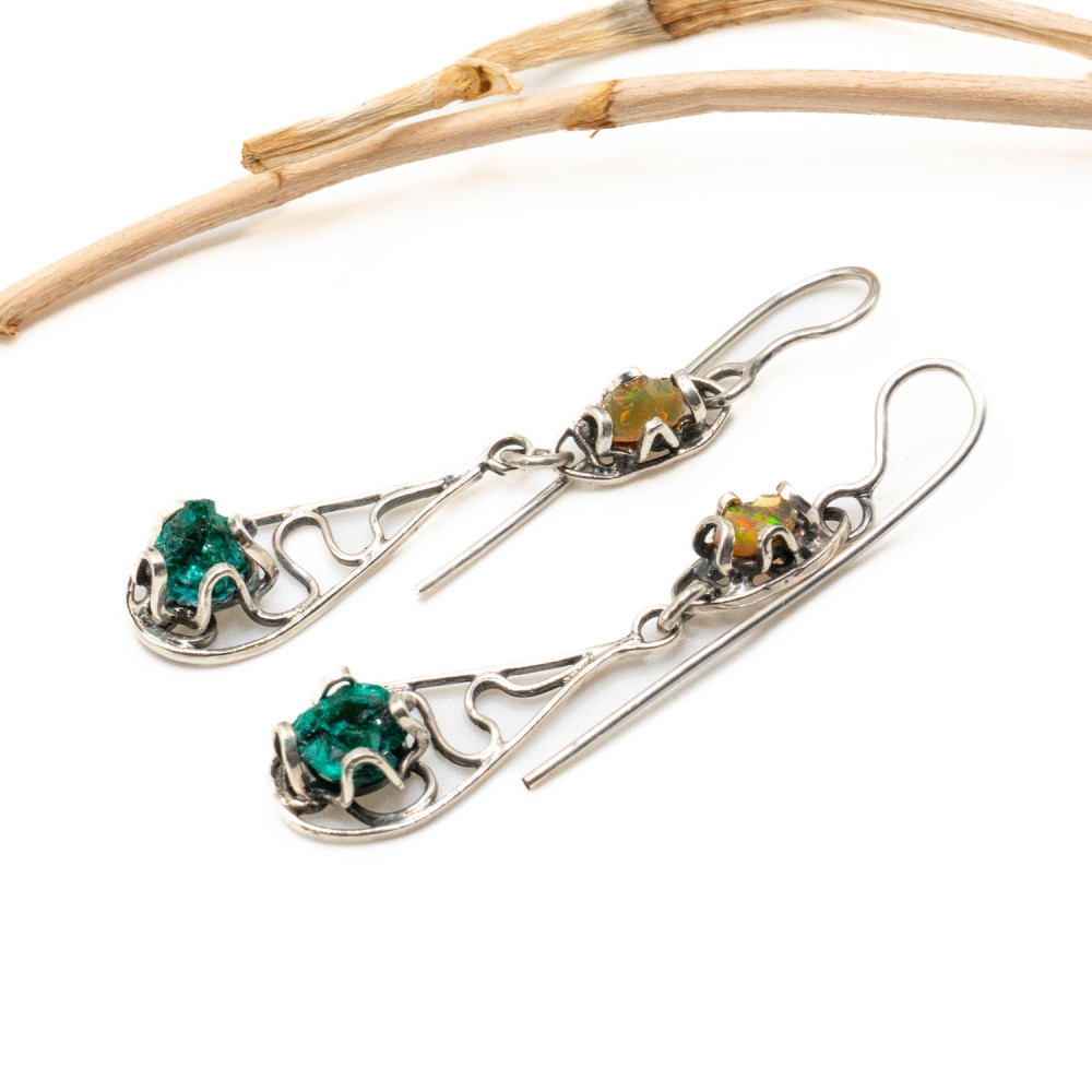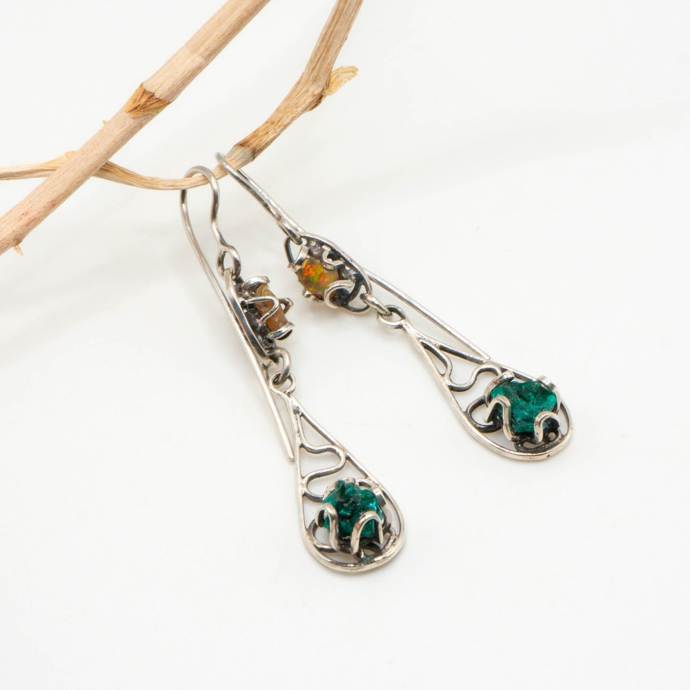 Ці сережки — як витончені срібні силуети, наповнені світлом і глибиною. Подовжена форма створює легкий, вертикальний рух, підкреслюючи лінію шиї. У нижній частині — необроблений діоптаз із насиченою смарагдовою кристалічною структурою, живий і фактурний. У верхньому елементі — невеликий опал теплого медово-помаранчевого відтінку, що додає композиції м’якого вогню.