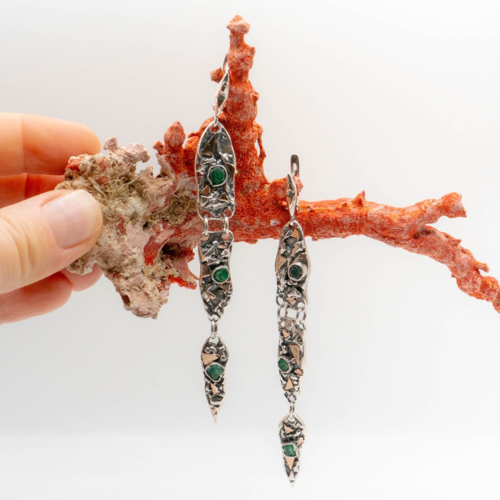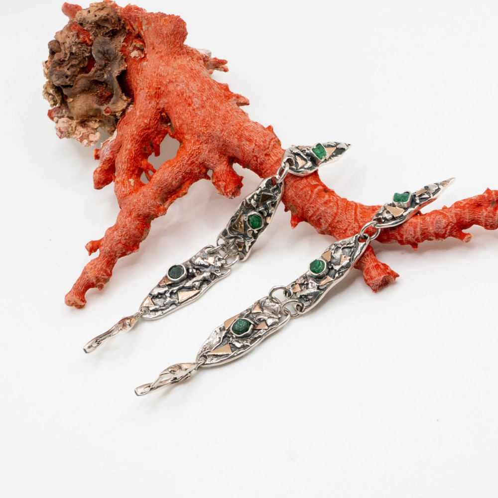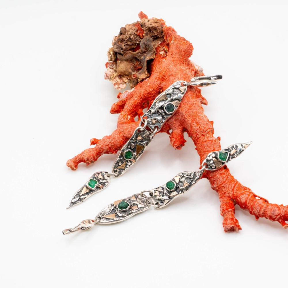 Сережки красиво рухаються з кожним кроком, підкреслюючи лінію шиї та додаючи образу витонченої сміливості. Авторська прикраса, у якій природа, метал і камінь зливаються в єдину історію — для тих, хто обирає не просто аксесуар, а відчуття.
