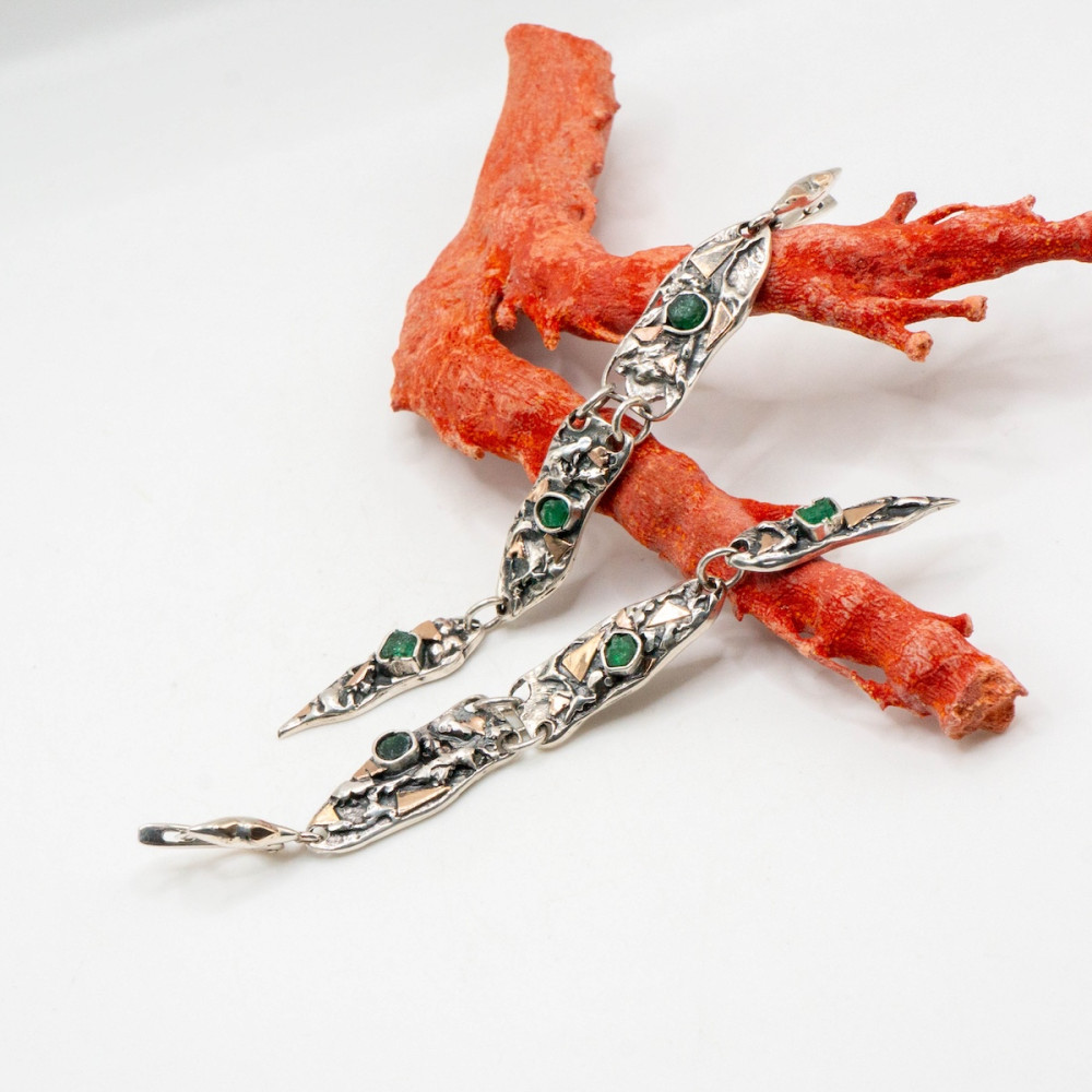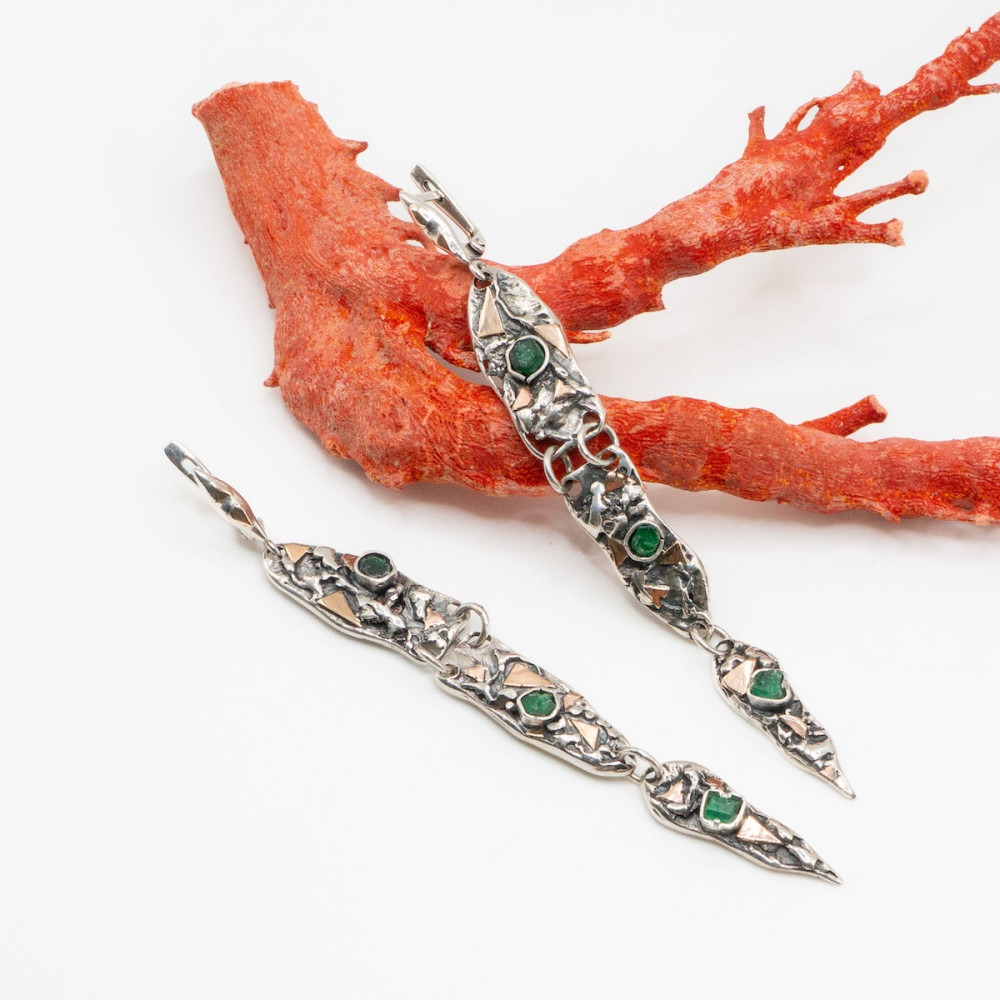Ці довгі срібні сережки — мов витягнуті з часу уламки давньої легенди. Фактурне срібло нагадує поверхню скелі, сформовану стихіями, а теплі золоті акценти виглядають як сонячні промені, що назавжди застигли в металі.