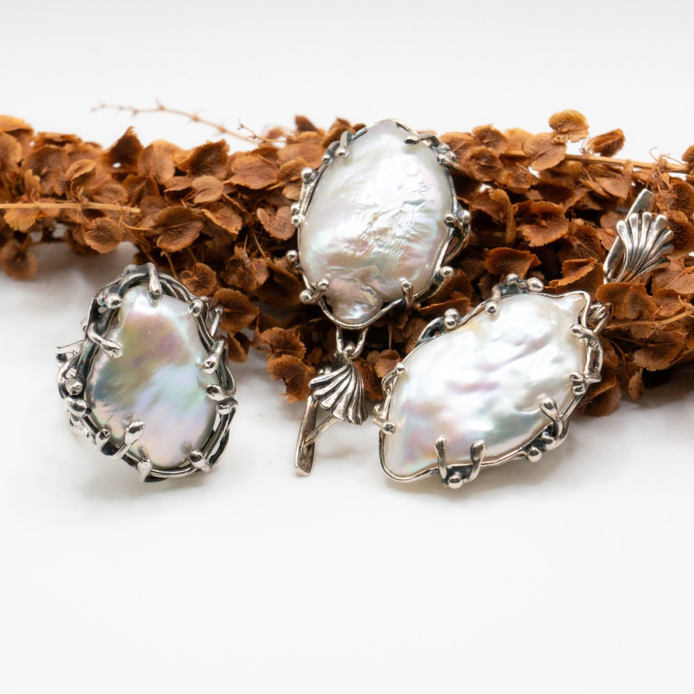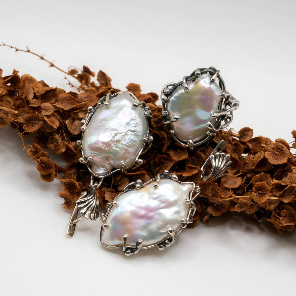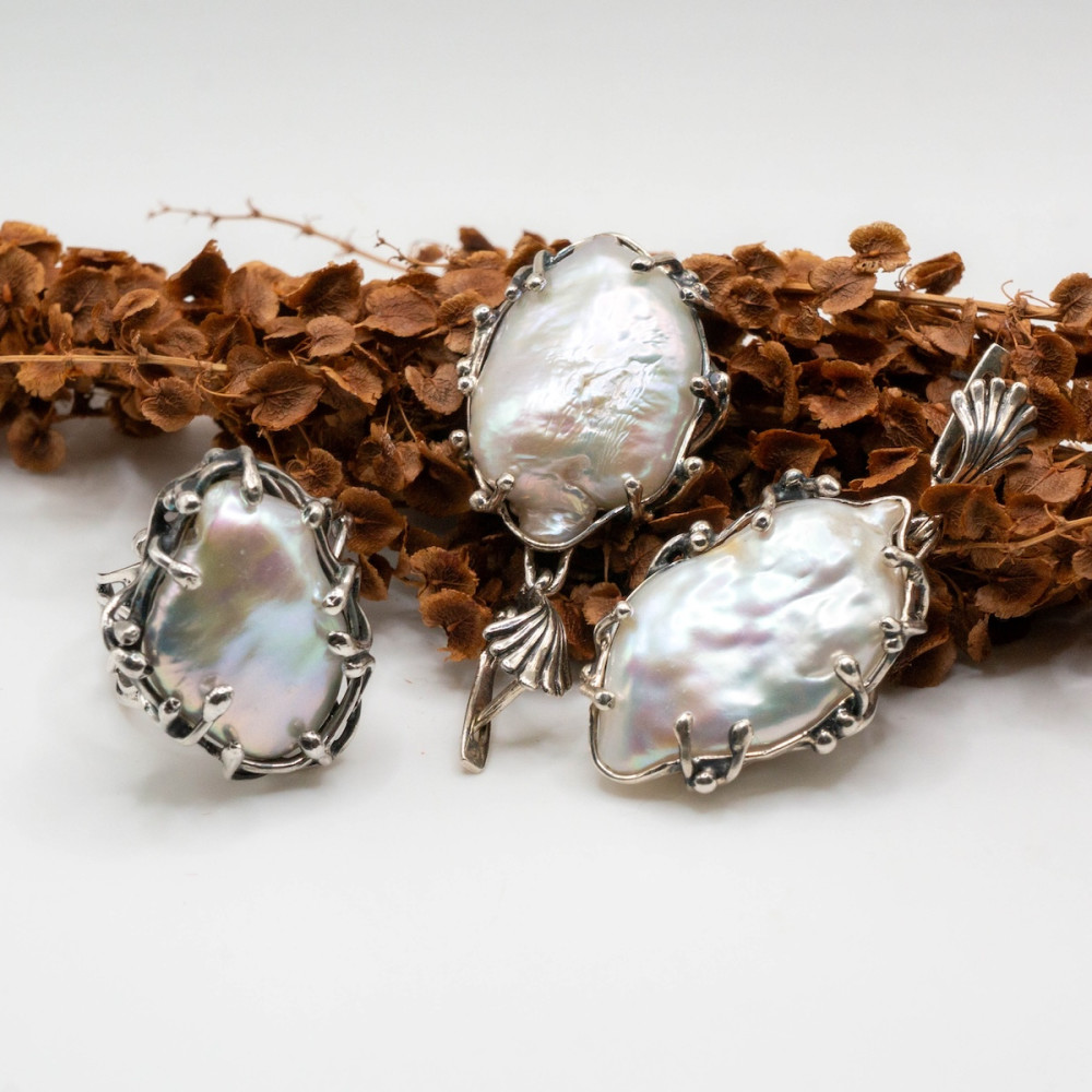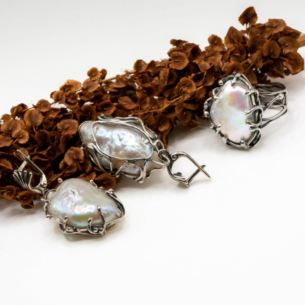 Авторські срібні оправи виконані вручну та делікатно підкреслюють форму перлин, не прагнучи до ідеальної симетрії. Сережки й кільце звучать разом гармонійно, формуючи завершений образ, який виглядає сучасно, статусно й впевнено.
