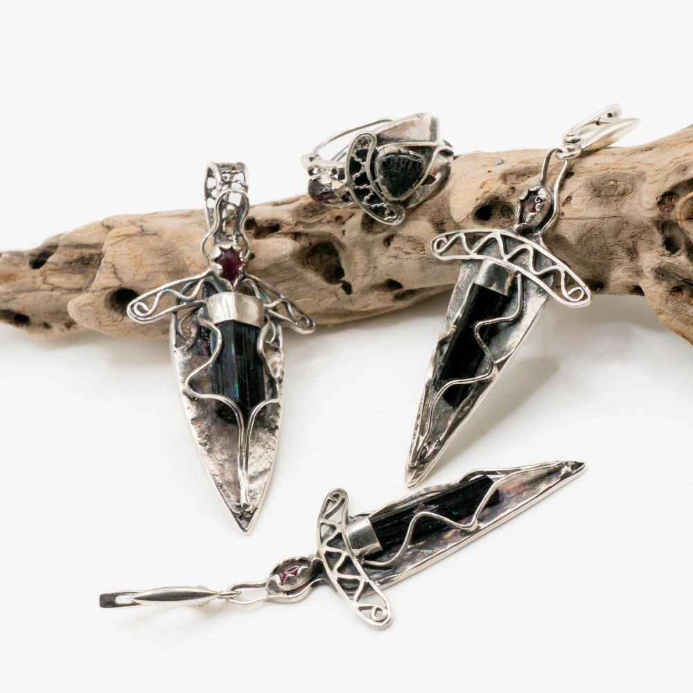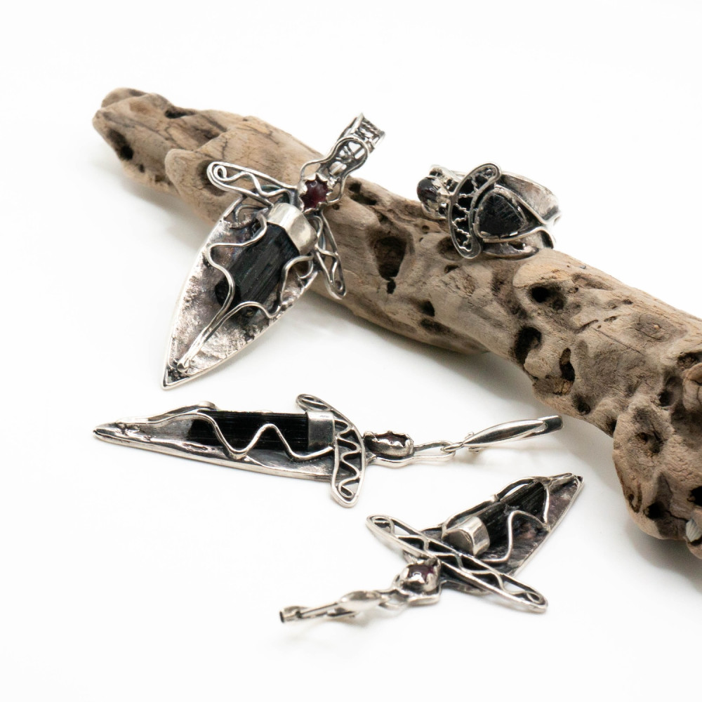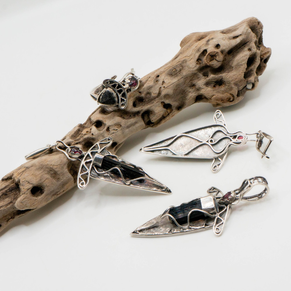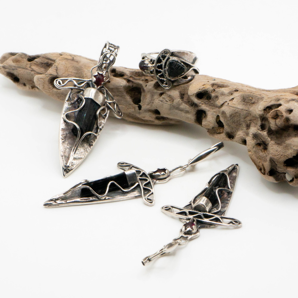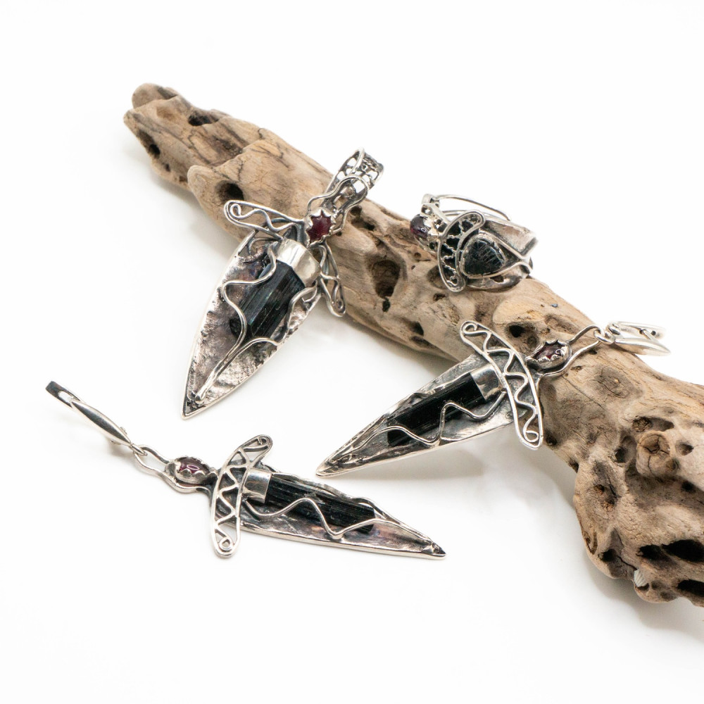 Цей ювелірний комплект сприймається як єдиний ритуальний образ — наче серія артефактів, створених з одного каменю та однієї ідеї. Кулон, каблучка й сережки об’єднані загостреною геометрією, кованою фактурою срібла та силою необробленого чорного турмаліну. Форми нагадують наконечники стріл або леза — символи захисту, спрямованої волі та внутрішньої концентрації.