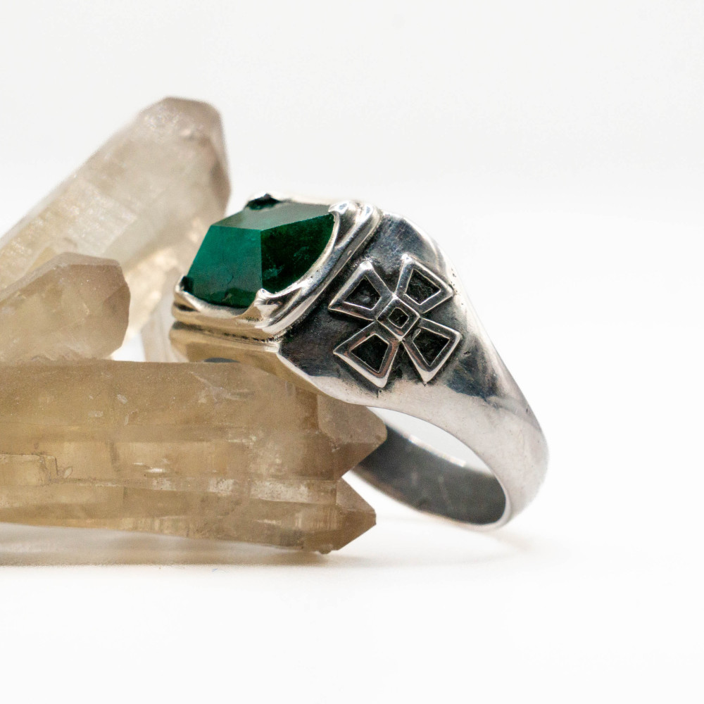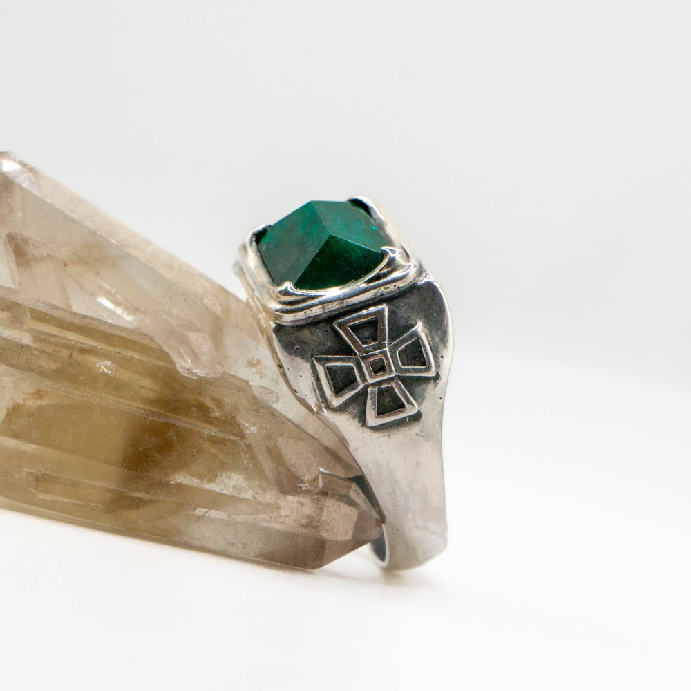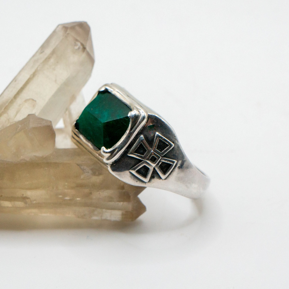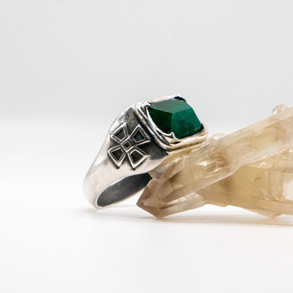 Ця авторська прикраса втілює стриману силу та глибину кольору. Насичений зелений діоптаз із чіткою геометрією огранки контрастує з масивною срібною формою, створюючи відчуття балансу між природою і архітектурою. Метал тут не хаотичний — він зібраний, майже монументальний, з гладкою поверхнею та акцентами ручної обробки. Лаконічний орнамент на шинці нагадує символ або стародавній знак, додаючи виробу характеру і внутрішнього змісту. Це не просто каблучка — це wearable art із чіткою енергією.