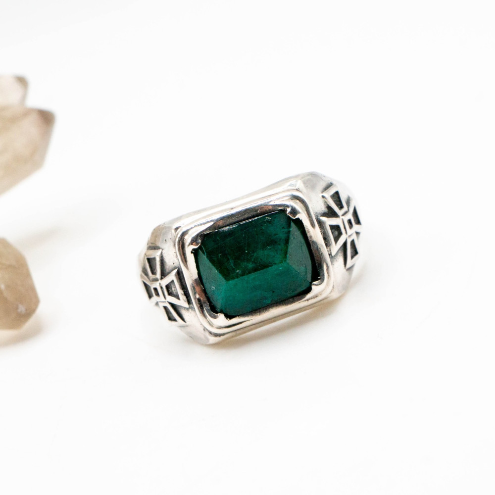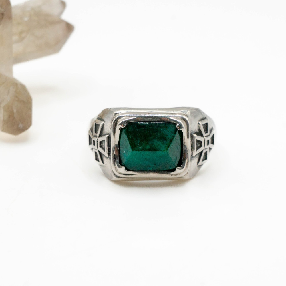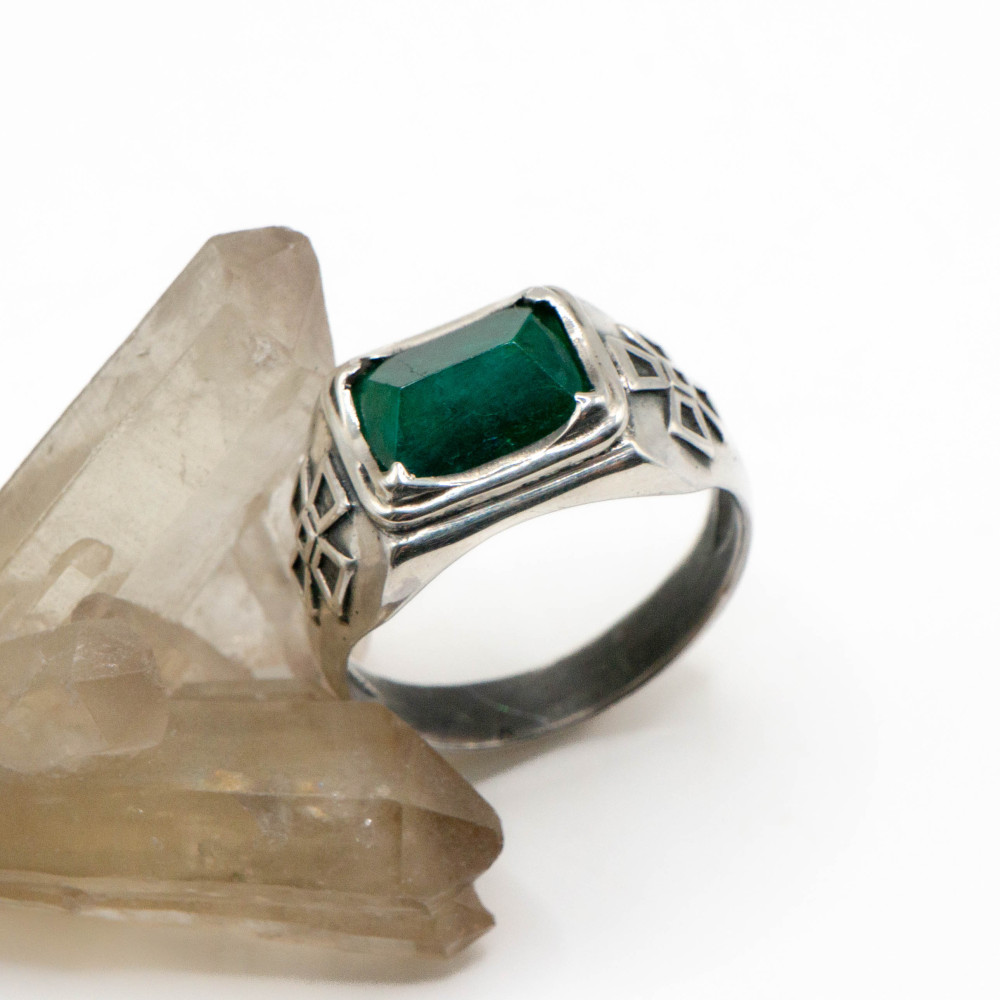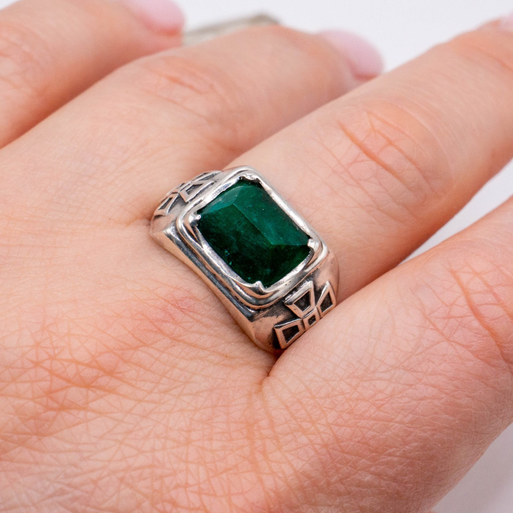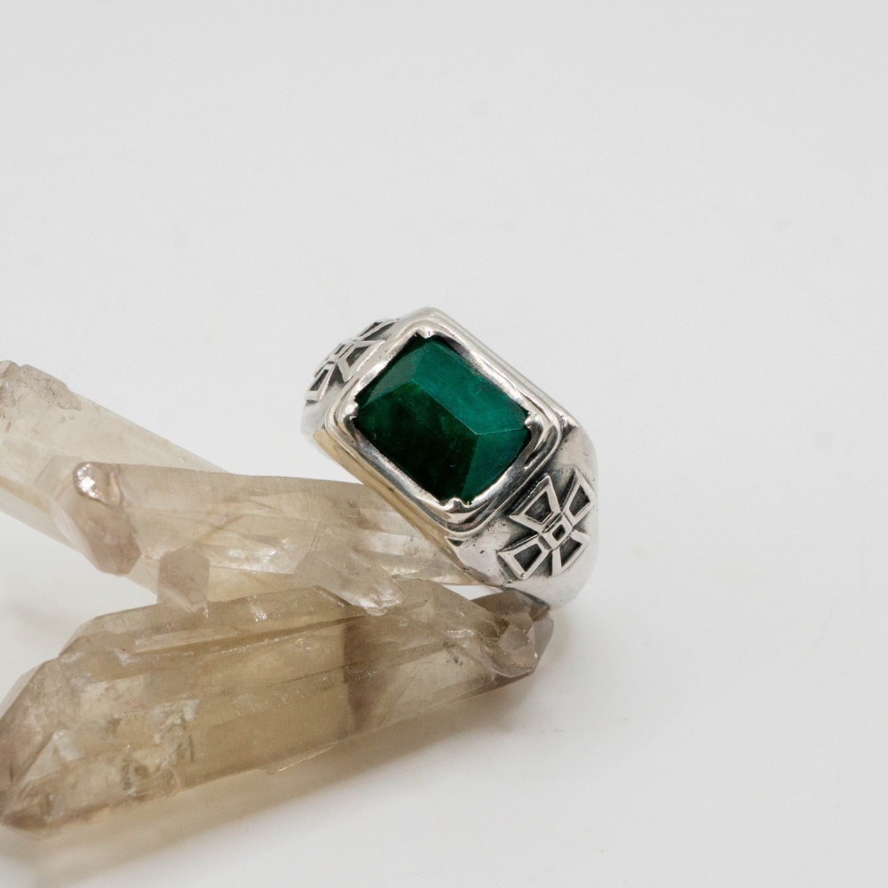 Ця авторська прикраса втілює стриману силу та глибину кольору. Насичений зелений діоптаз із чіткою геометрією огранки контрастує з масивною срібною формою, створюючи відчуття балансу між природою і архітектурою. Метал тут не хаотичний — він зібраний, майже монументальний, з гладкою поверхнею та акцентами ручної обробки. Лаконічний орнамент на шинці нагадує символ або стародавній знак, додаючи виробу характеру і внутрішнього змісту. Це не просто каблучка — це wearable art із чіткою енергією.