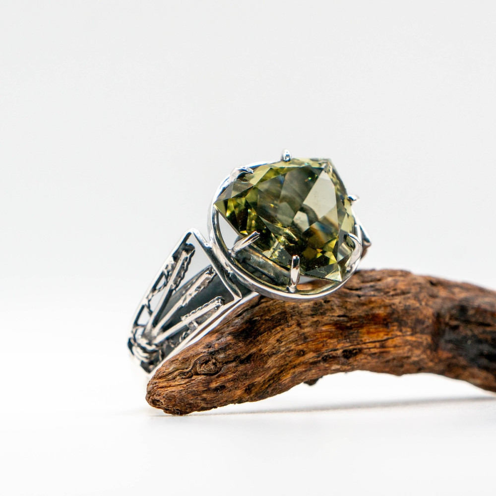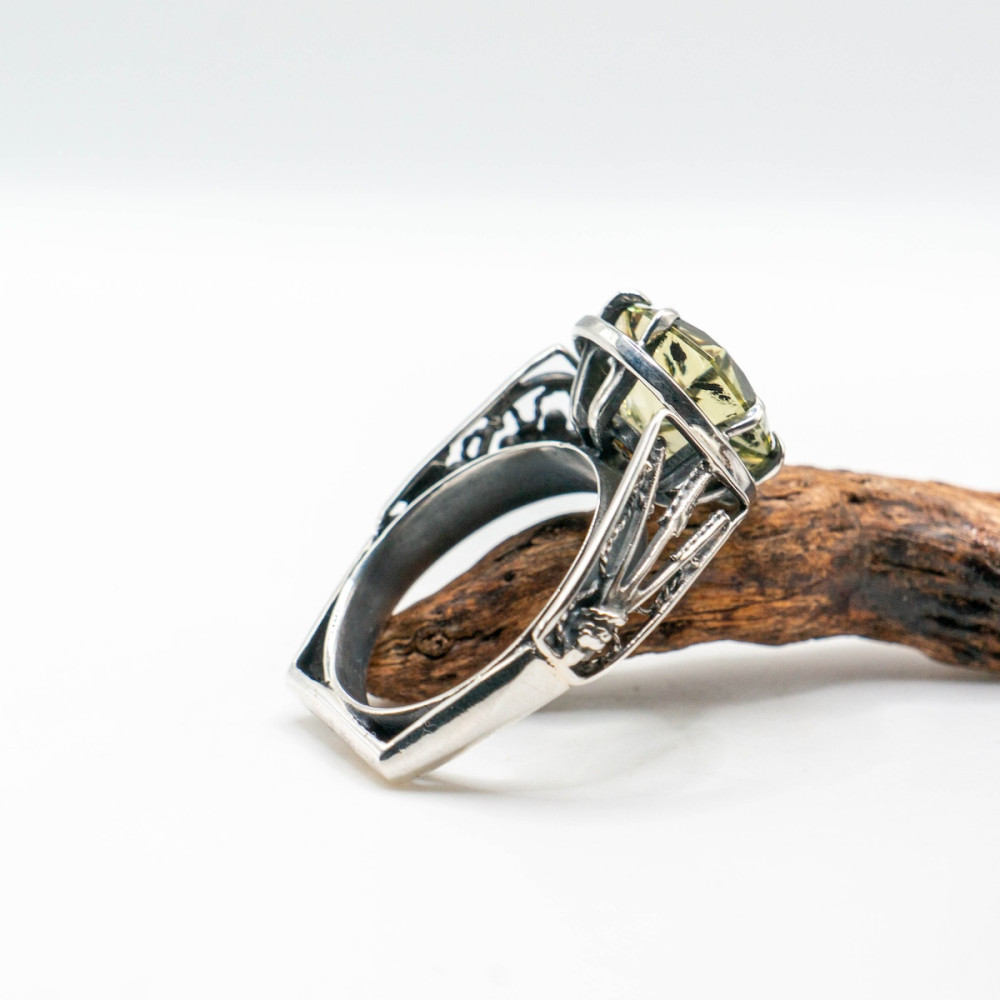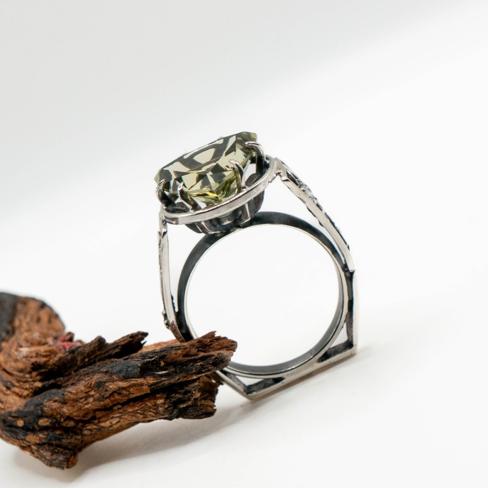 Кільце з геліодором ніжно-зеленого відтінку в огранці – це витончена та стильна прикраса, що вражає своєю легкістю й гармонією.