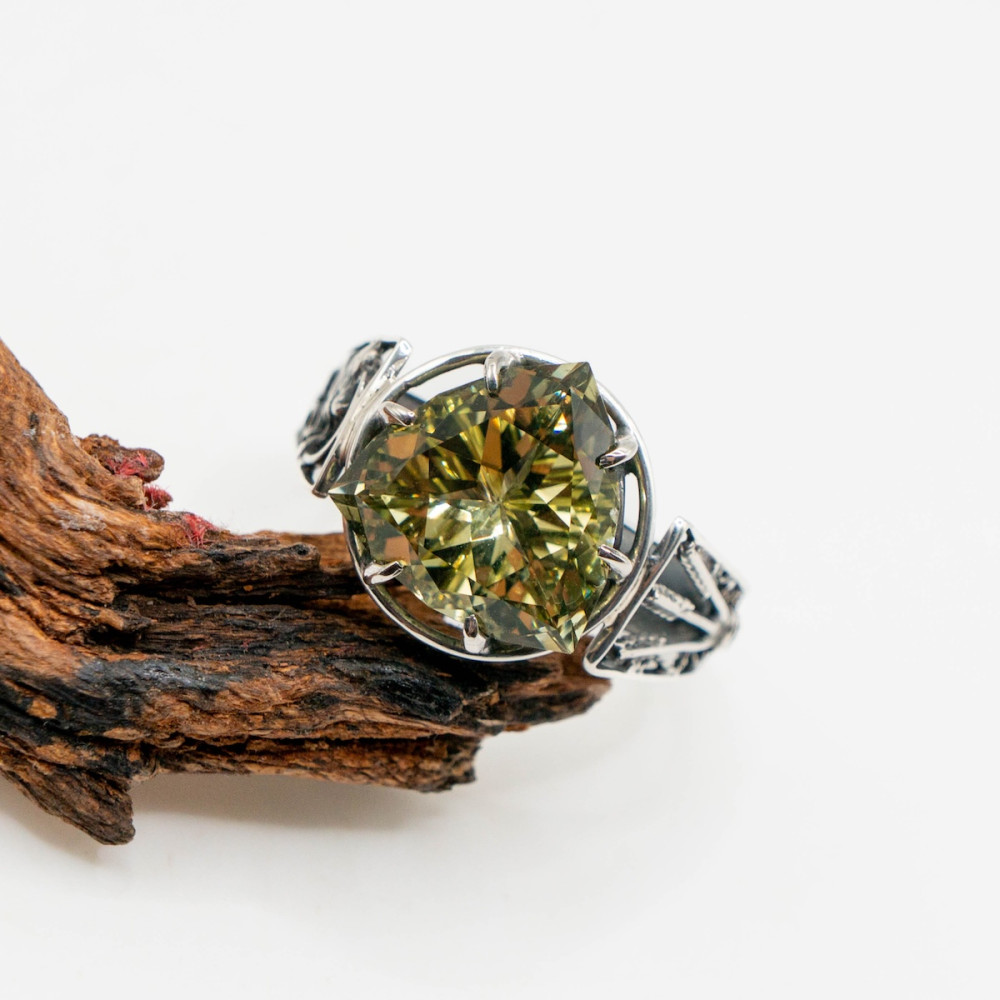 Світло-зелений камінь м’яко переливається на світлі, випромінюючи спокій та свіжість, ніби віддзеркалюючи подих природи. Його благородне сяйво надає образу особливого шарму, а сучасний дизайн кільця підкреслює індивідуальність власника. Таке кільце стане символом внутрішньої гармонії, сили й витонченого смаку.