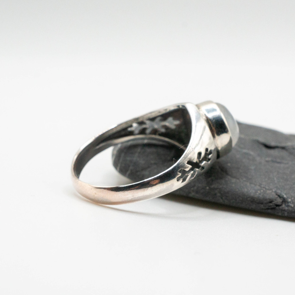 Ця авторська прикраса народжується на межі світла й тіні — там, де срібло дихає, а камінь зберігає тишу ночі. Лаконічна, але виразна форма каблучки підкреслює органічний дизайн: гладко відшліфоване срібло огортає природний мінерал, немов захищаючи його внутрішнє сяйво. Вставка кабошон має м’яку, округлу форму, а тонкі прорізи у шинці додають виробу нео-готичної графіки й легкості. Це прикраса, що говорить тихо — але її неможливо не почути.