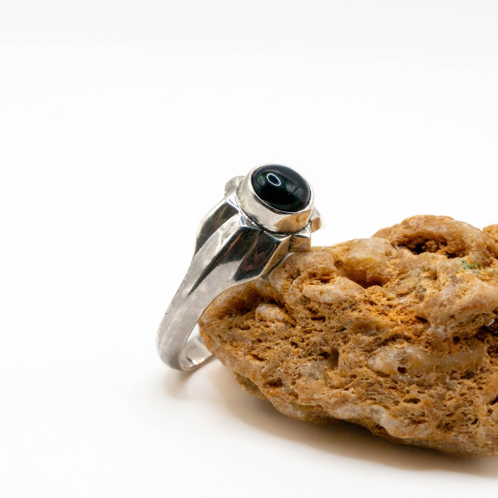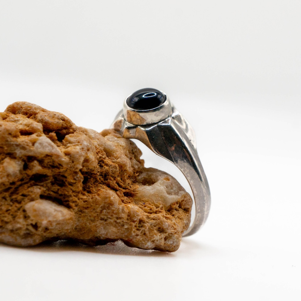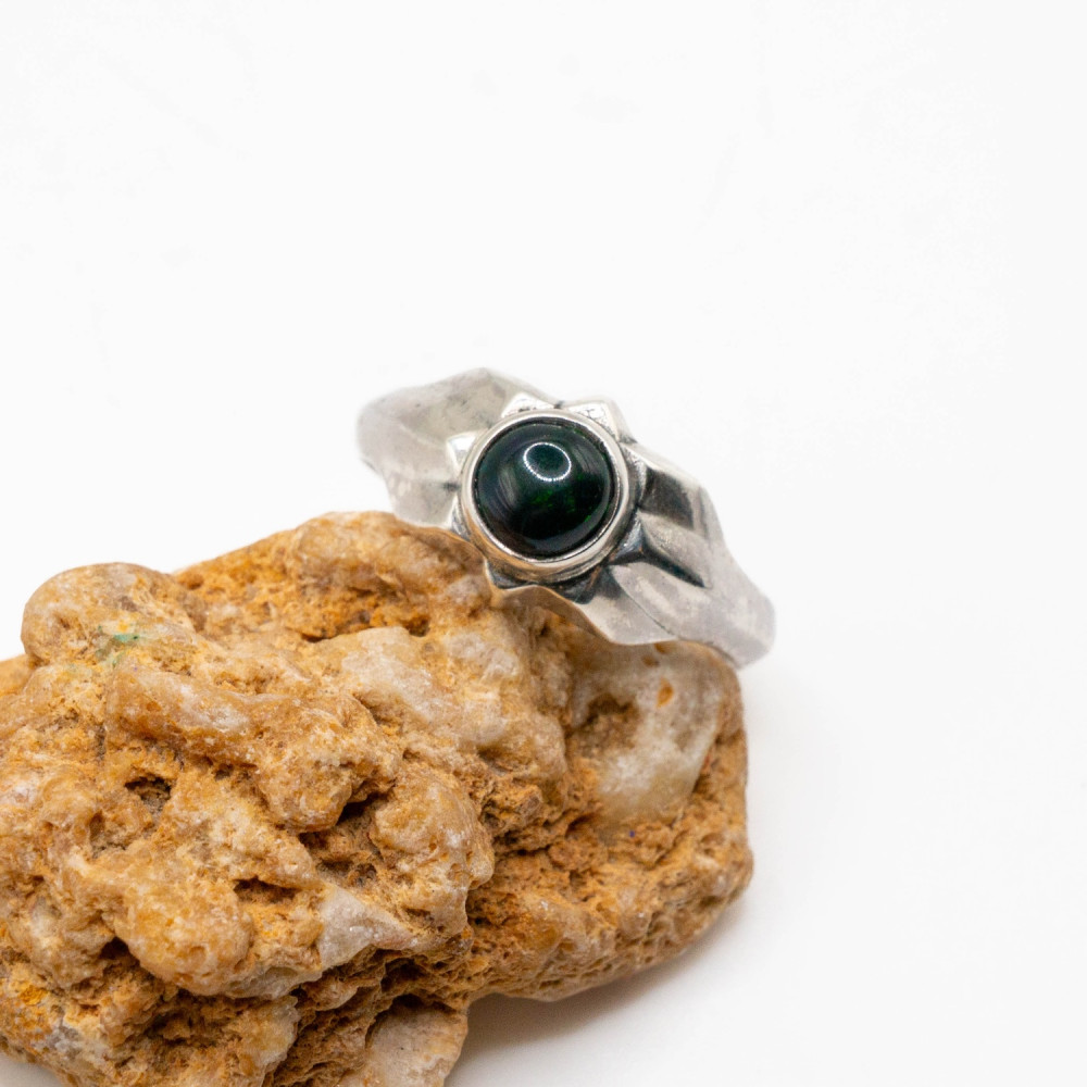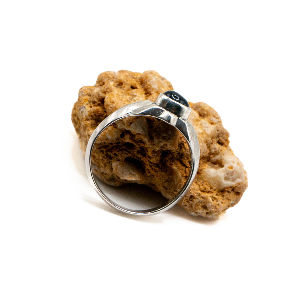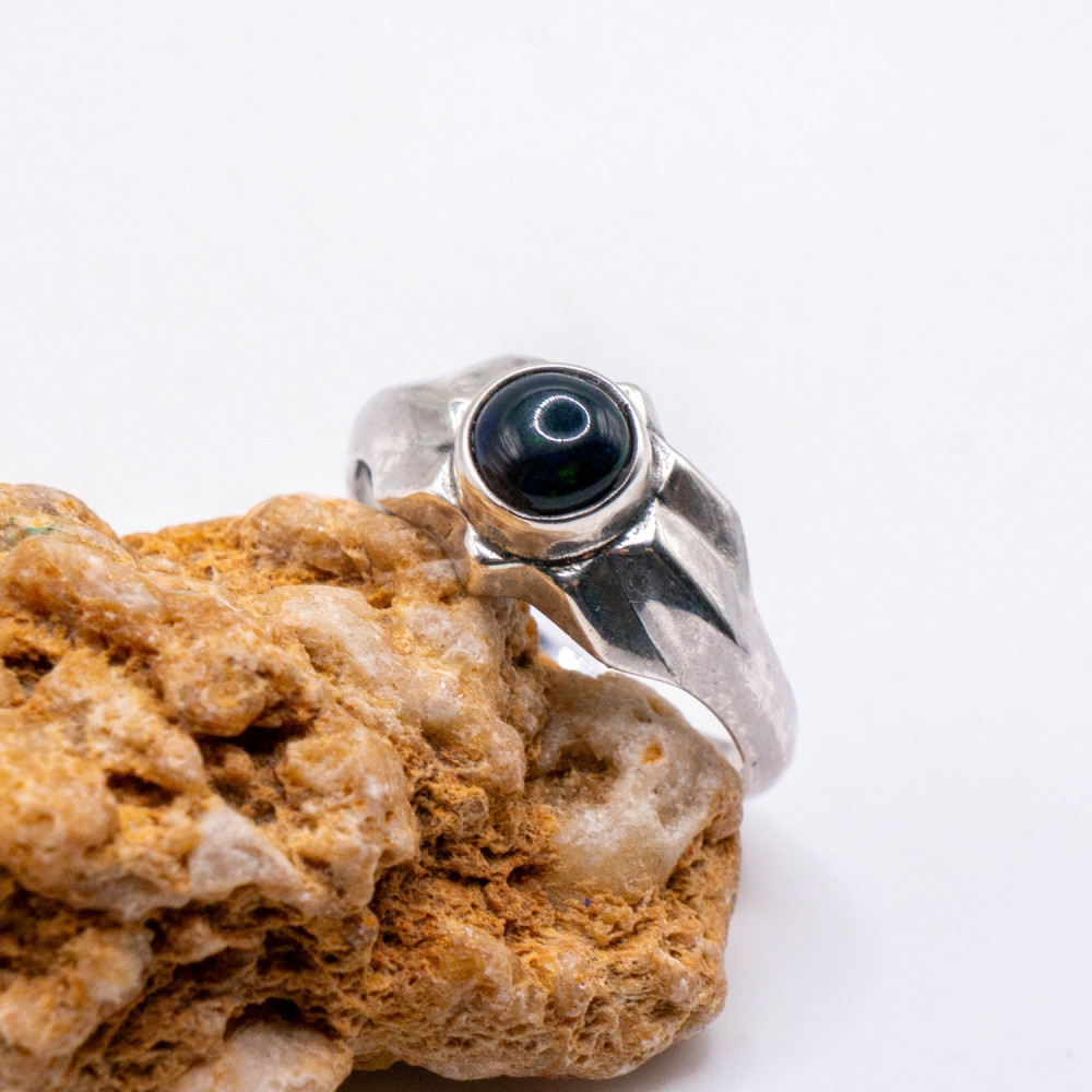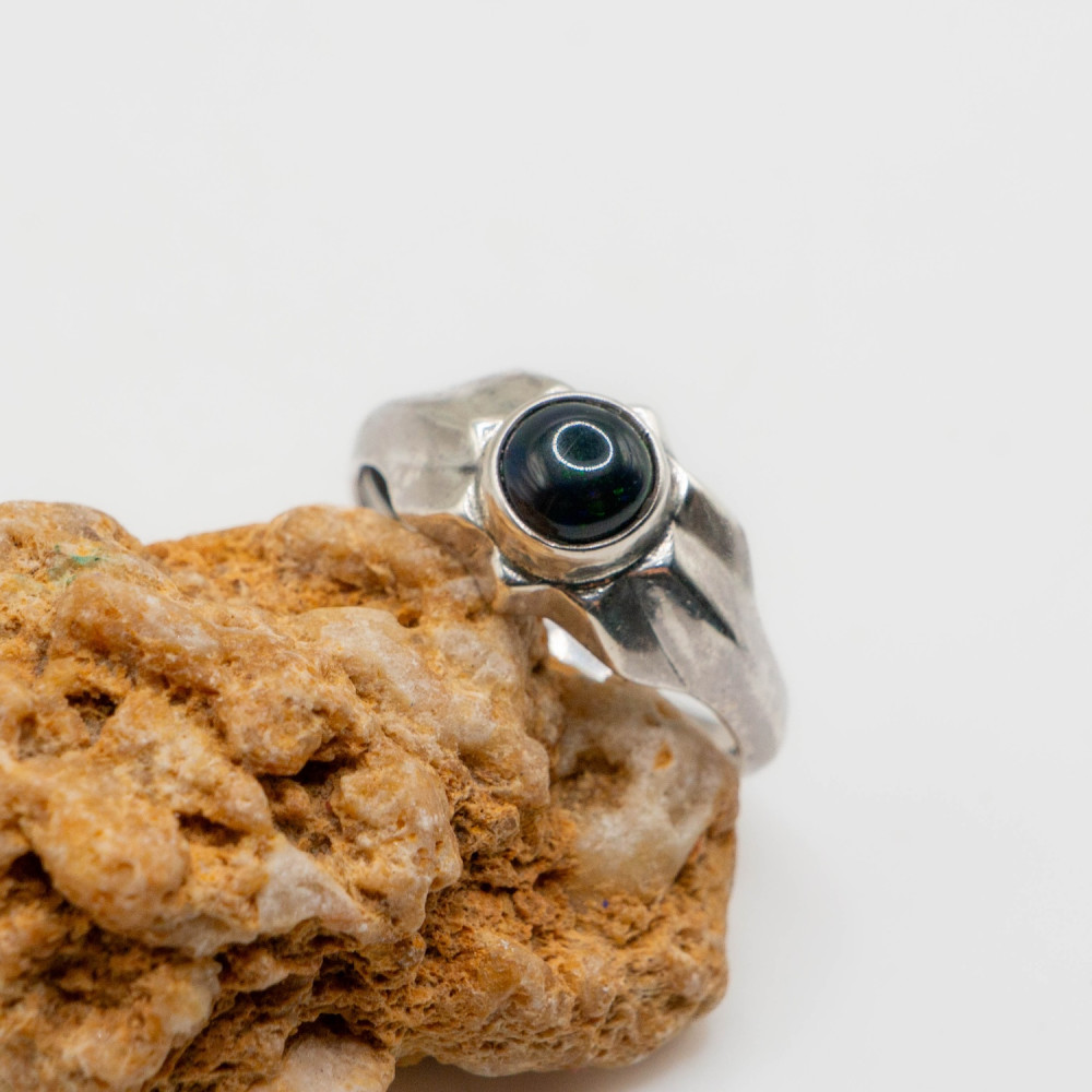 Ця каблучка від Komarov Jewelry — як тиха глибина ночі, втілена в металі та камені. Органічний дизайн срібної оправи розгортається плавними, живими лініями, ніби повторюючи природні ритми. Метал частково гладкий, частково з легкою фактурою, що додає відчуття ручної присутності майстра. У центрі — темний опал із дзеркальною поліровкою, в якому народжується світло: кожен рух відкриває нові спалахи кольору. Це авторська прикраса, що звучить стримано, але глибоко.