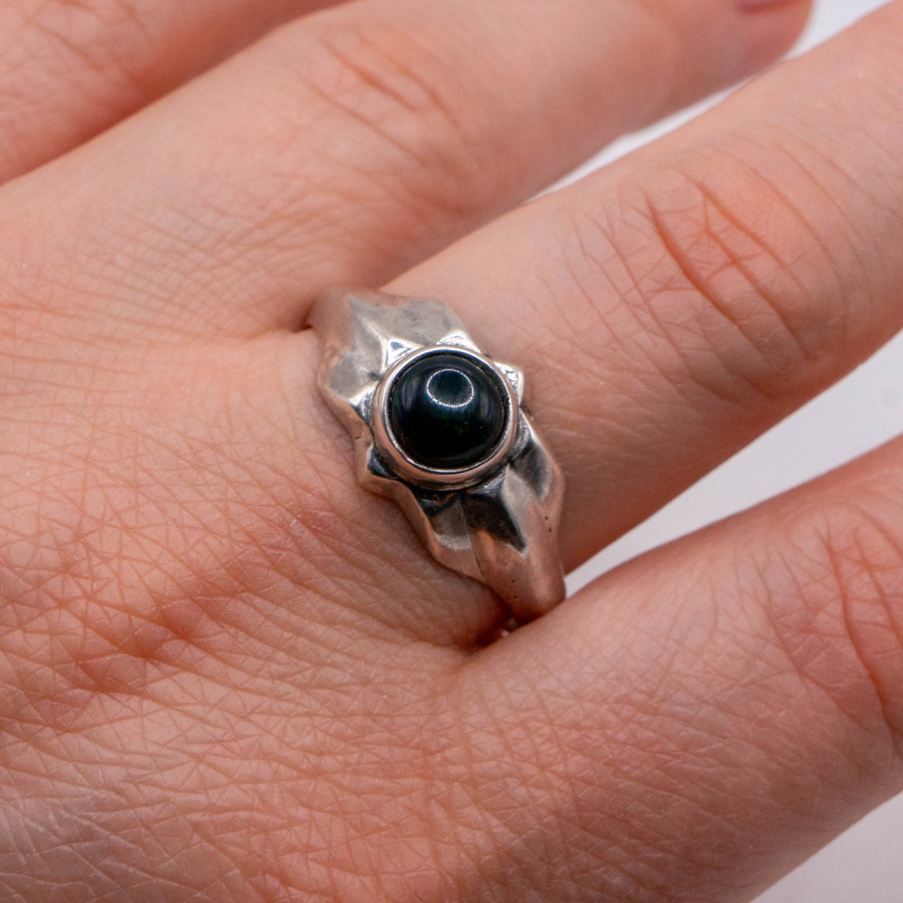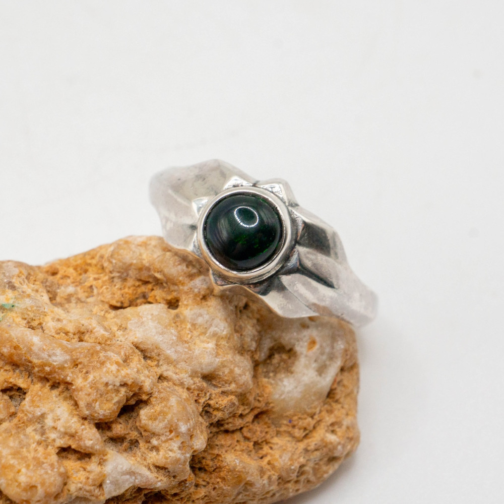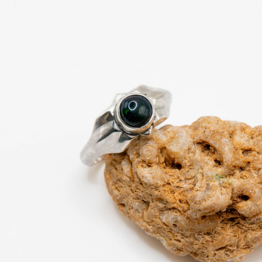 Темний опал — рідкісний натуральний камінь, відомий своєю живою грою відтінків. У його глибині з’являються переливи синього, зеленого, фіолетового та вогняних іскор — ніби прихована галактика. Цей природний мінерал асоціюється з інтуїцією, внутрішнім балансом і тонким відчуттям світу. Кожен опал унікальний, і саме це робить каблучку абсолютно неповторною.