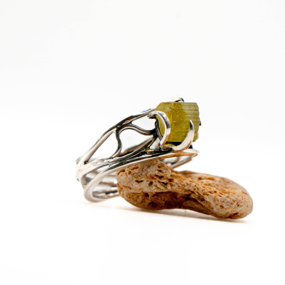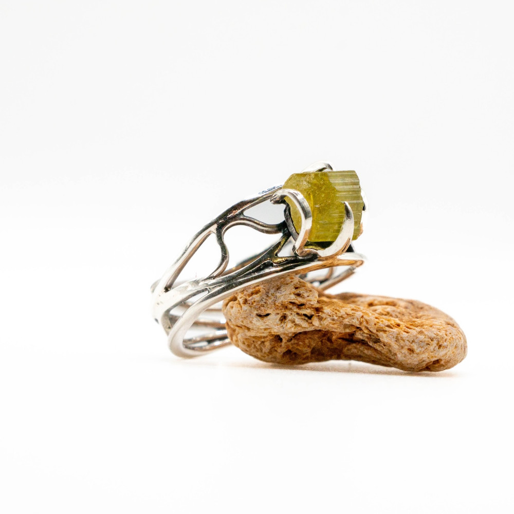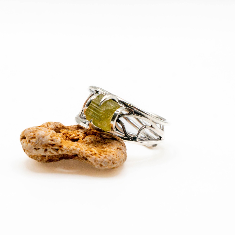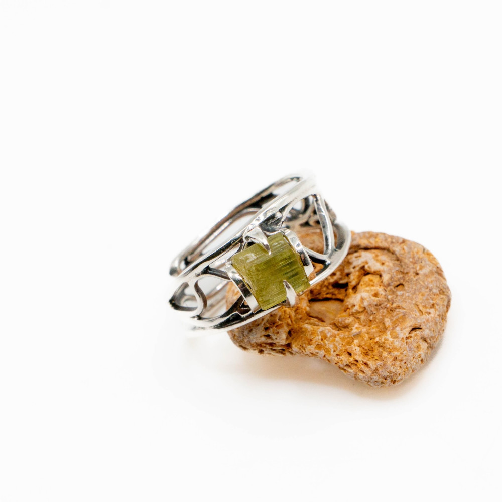 У цій каблучці відчувається дихання природи. Нерівні лінії срібної оправи ніби повторюють органічні форми гілок і коріння, створюючи відчуття живої структури. У центрі композиції — природний мінерал, зелений турмалін із природною кристалічною формою. Його рельєфна поверхня з тонкими вертикальними гранями ловить світло і відкриває глибокий медово-оливковий відтінок. Камінь виглядає так, ніби щойно був знайдений у надрах землі та делікатно закріплений у сріблі.