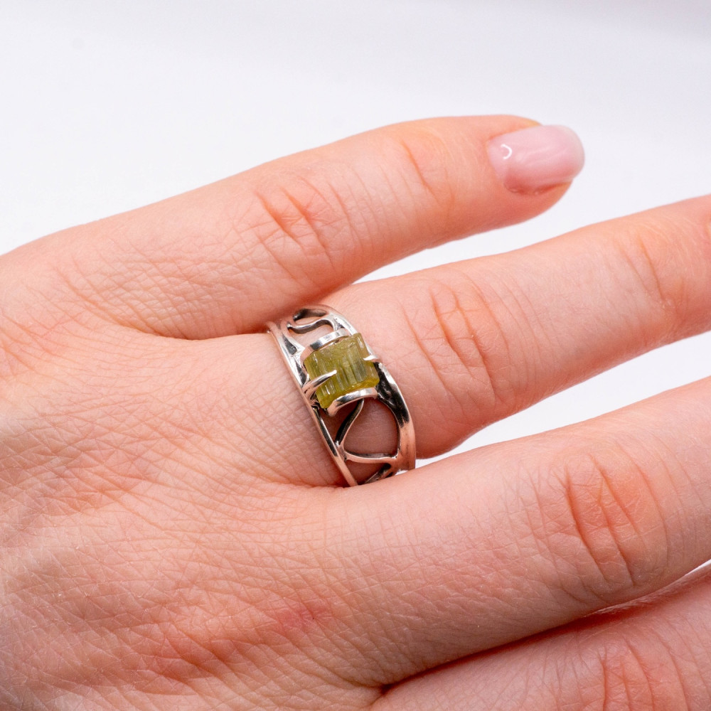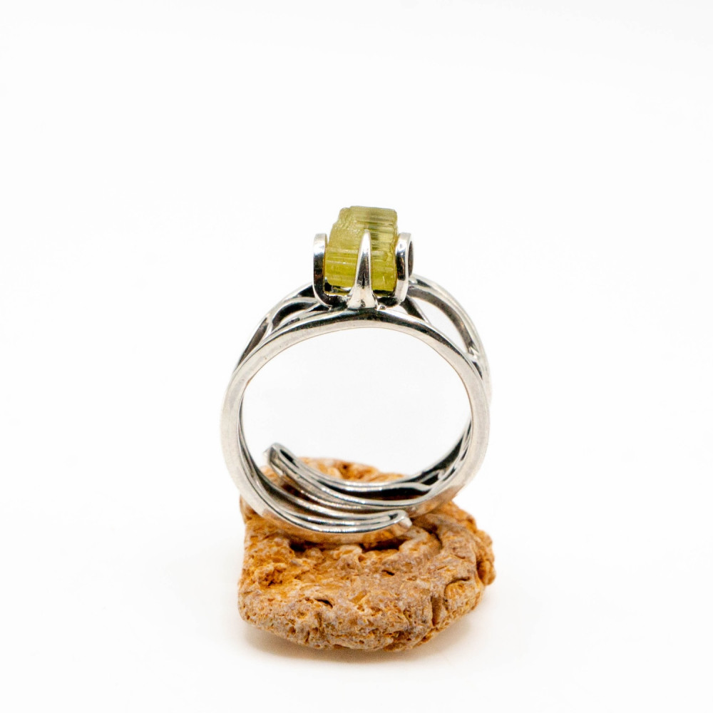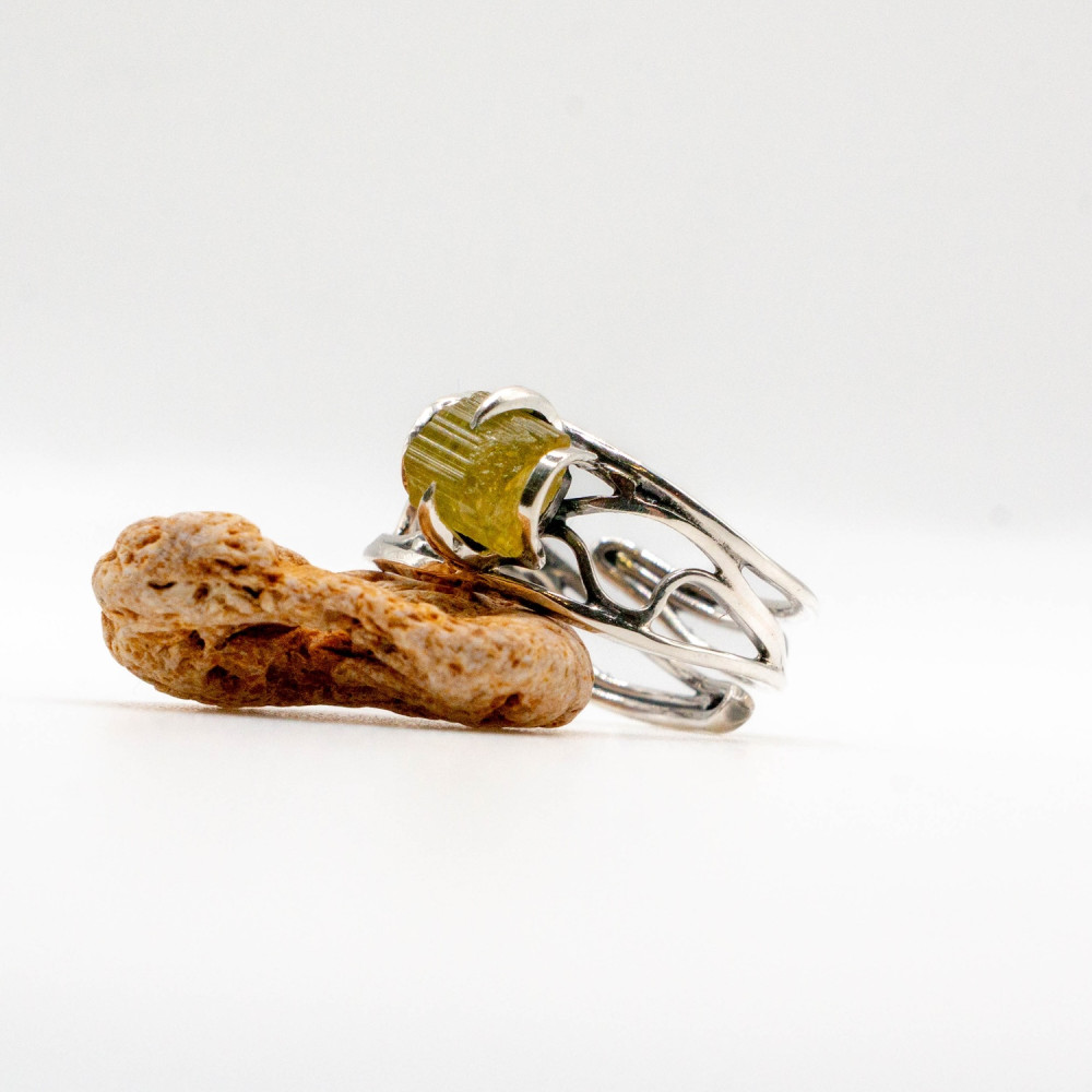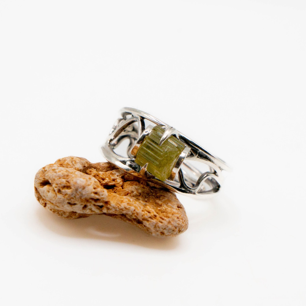 У цій каблучці відчувається дихання природи. Нерівні лінії срібної оправи ніби повторюють органічні форми гілок і коріння, створюючи відчуття живої структури. У центрі композиції — природний мінерал, зелений турмалін із природною кристалічною формою. Його рельєфна поверхня з тонкими вертикальними гранями ловить світло і відкриває глибокий медово-оливковий відтінок. Камінь виглядає так, ніби щойно був знайдений у надрах землі та делікатно закріплений у сріблі.
