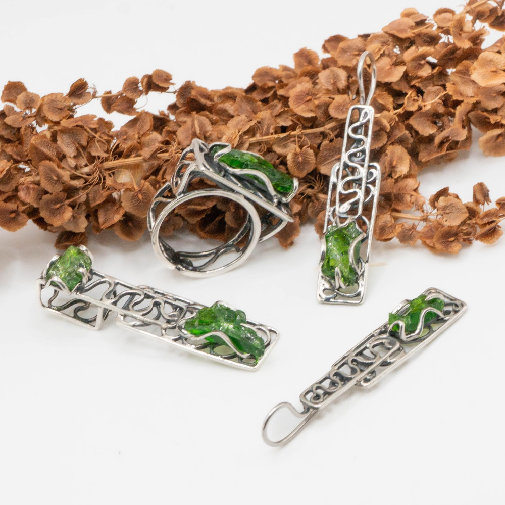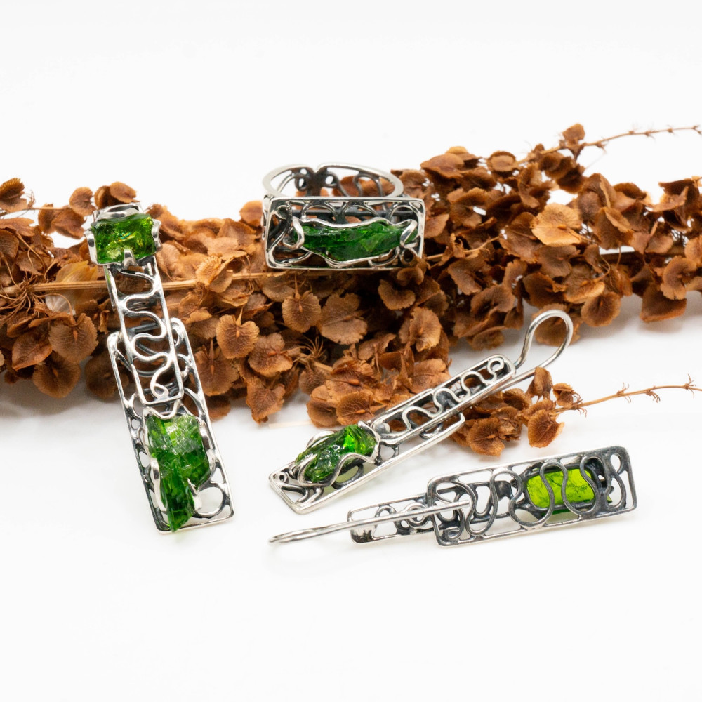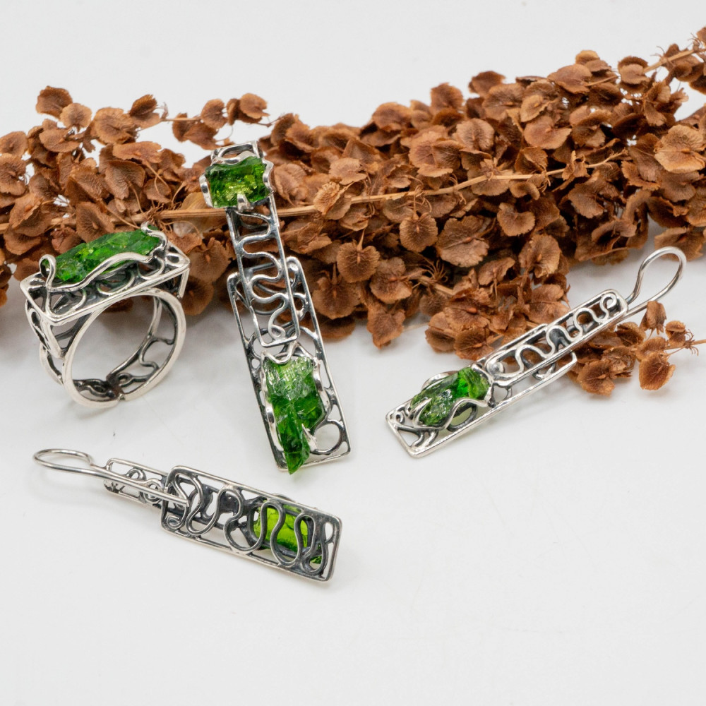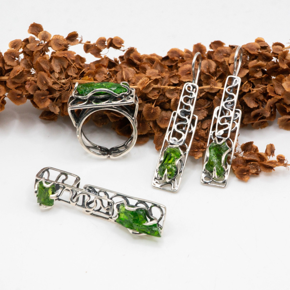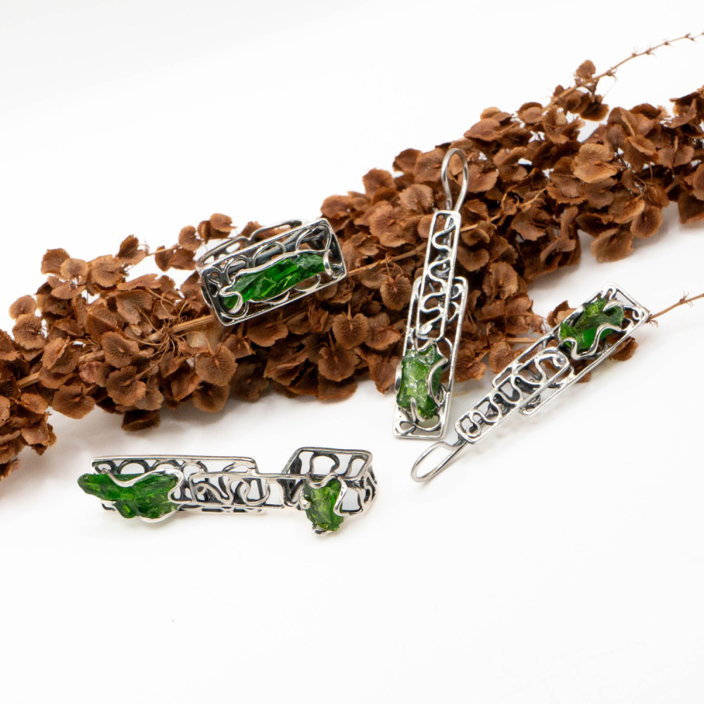 Цей комплект — про глибину лісу після дощу. Насичений зелений хромдіопсид у поєднанні з холодним сріблом створює виразний контраст світла й тіні. Камінь ніби світиться зсередини, а ажурна, органічна пластика оправи нагадує переплетіння гілок або старовинний орнамент.