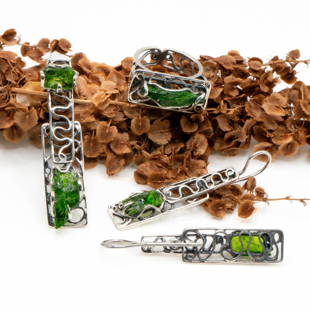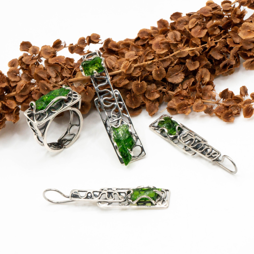 Сережки, каблучка та кулон виконані в єдиній стилістиці: видовжені срібні рамки з вільною лінією всередині підкреслюють природну форму каменю. Хромдіопсид не шліфований «до ідеалу» — збережена жива структура мінералу, його природна фактура й глибина кольору.