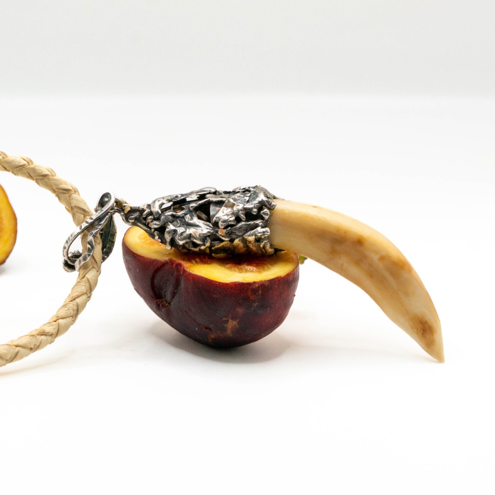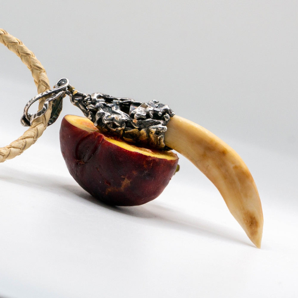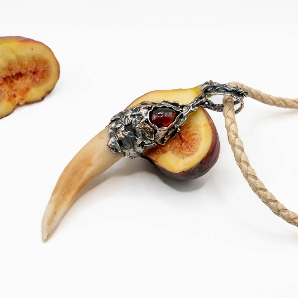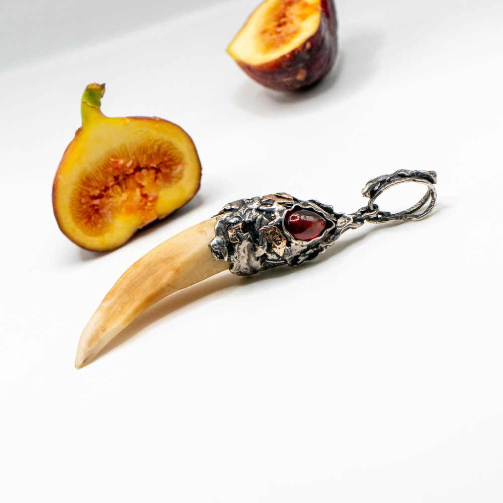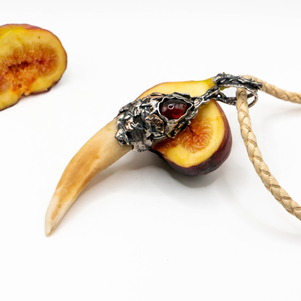 Центральною частиною композиції цього кулона є справжнє ікло вовка, оздоблений сріблом та вишуканими золотими акцентами. Камінь гранат надає прикрасі глибини та вогняного сяйва, посилюючи її енергетику. Кулон уособлює силу, свободу й вірність, стаючи оберегом для свого власника.