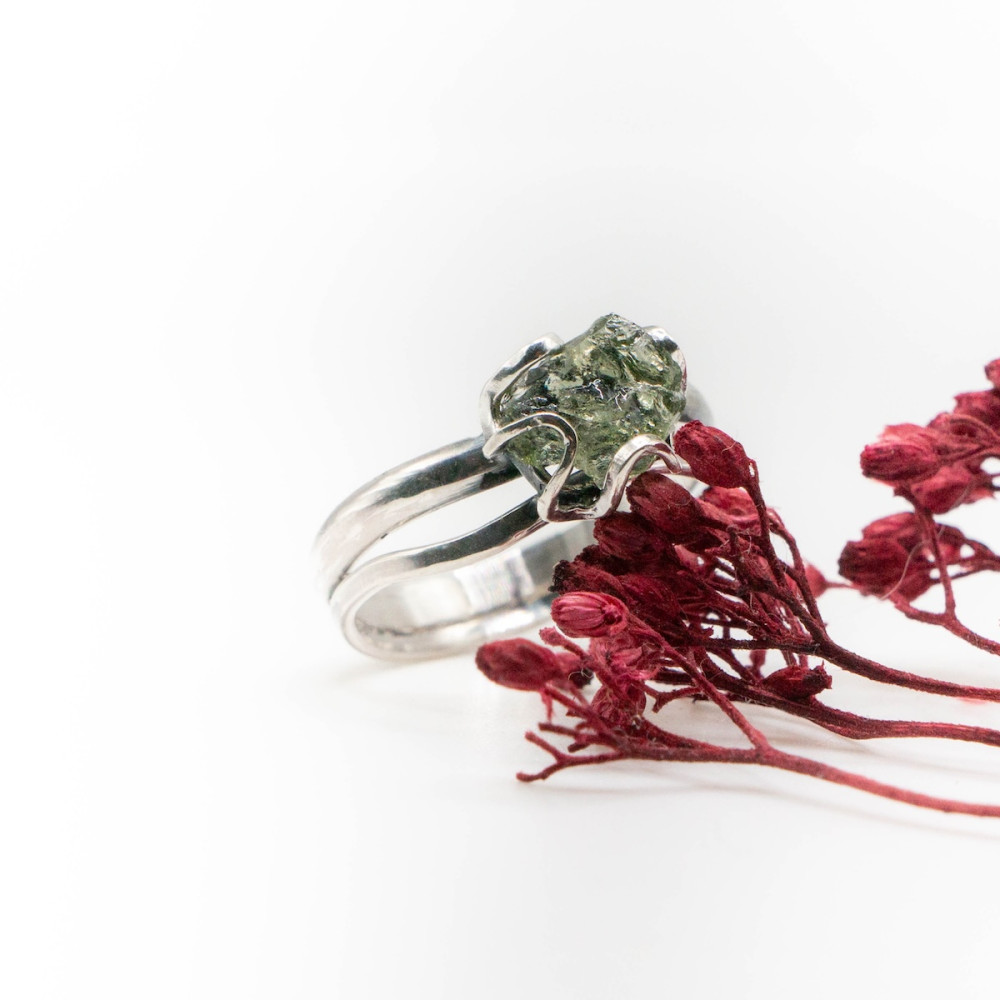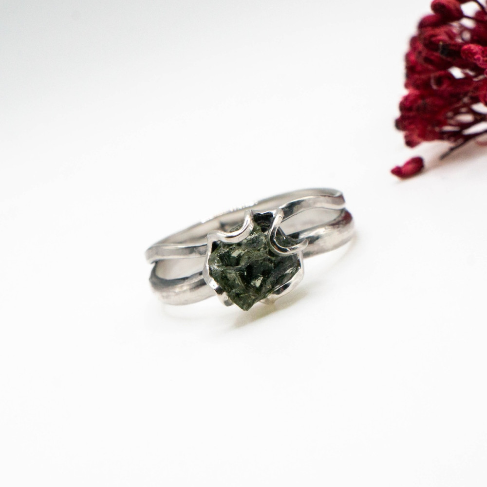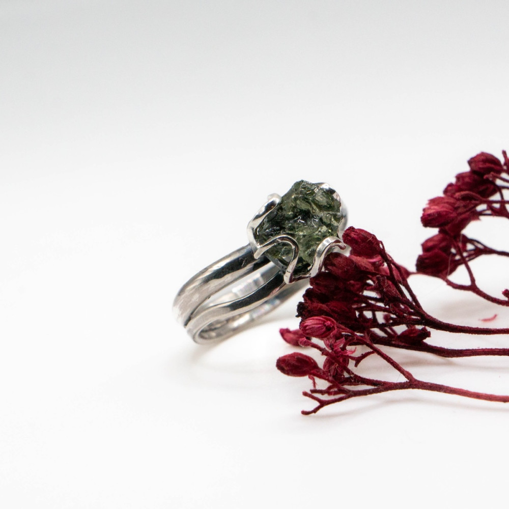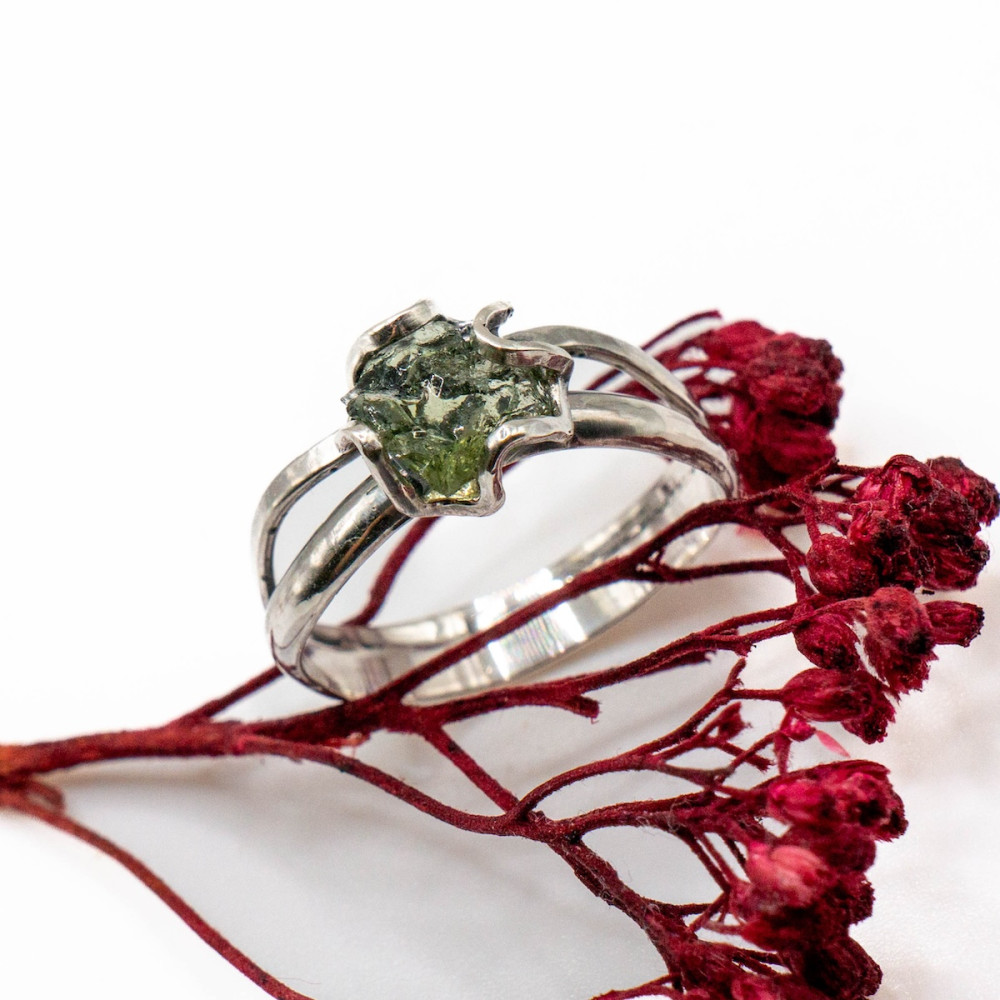 Кожна лінія каблучки продумана так, щоб підкреслити природну красу каменю, не обтяжуючи його масивністю. Молдавит — рідкісний тектит, народжений зіткненням метеорита із Землею, символізує трансформацію, внутрішню силу та нові початки.