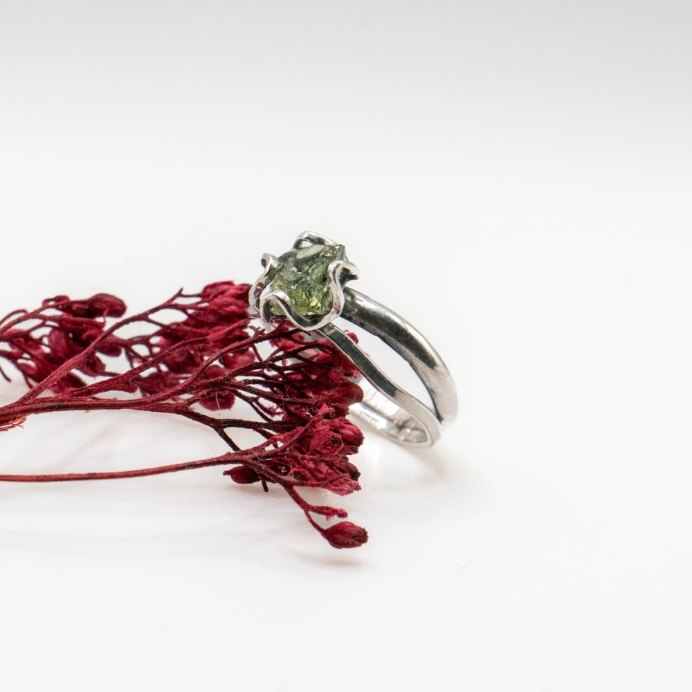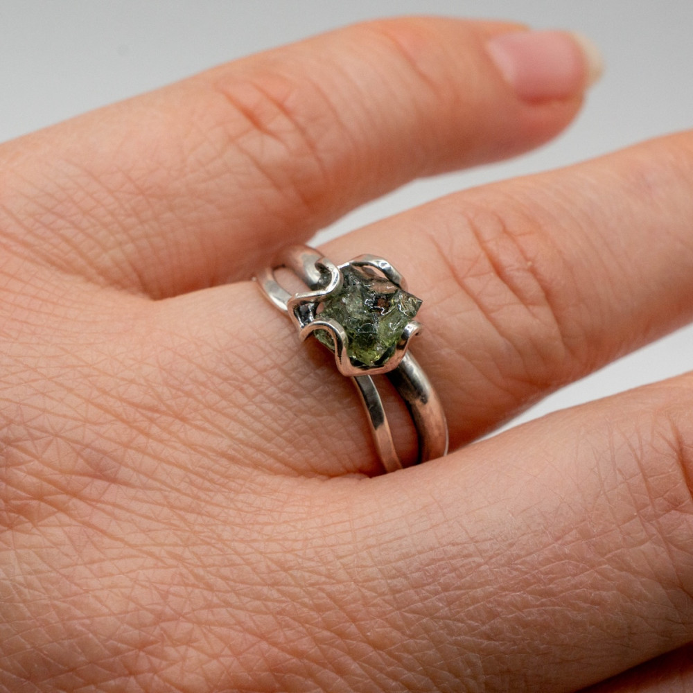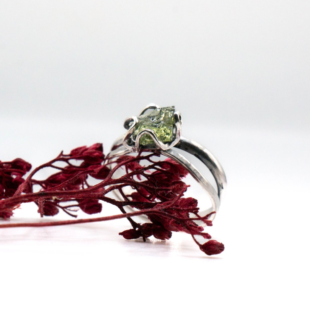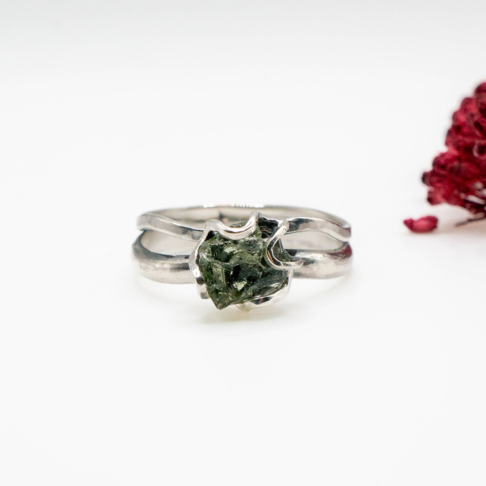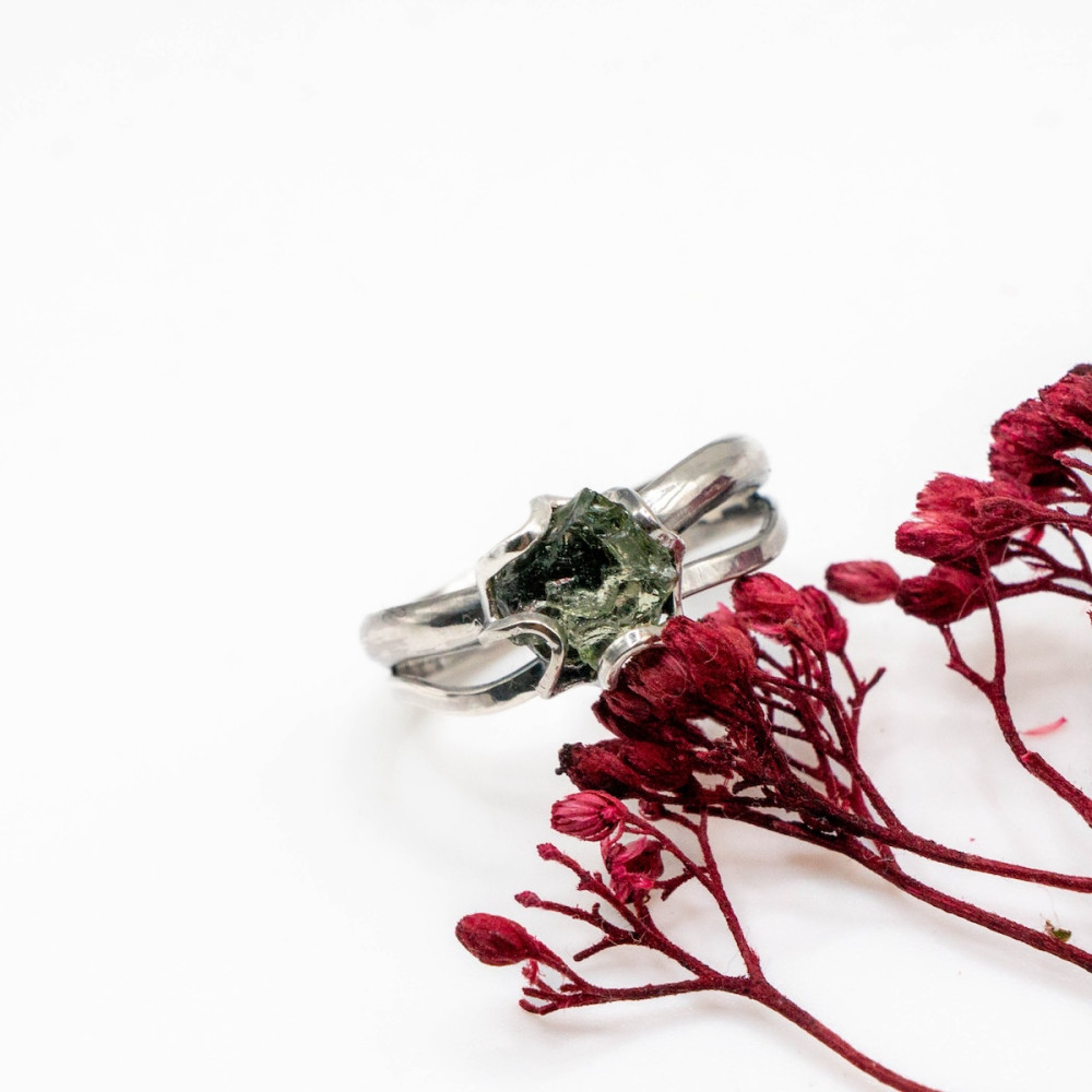 Кожна лінія каблучки продумана так, щоб підкреслити природну красу каменю, не обтяжуючи його масивністю. Молдавит — рідкісний тектит, народжений зіткненням метеорита із Землею, символізує трансформацію, внутрішню силу та нові початки.