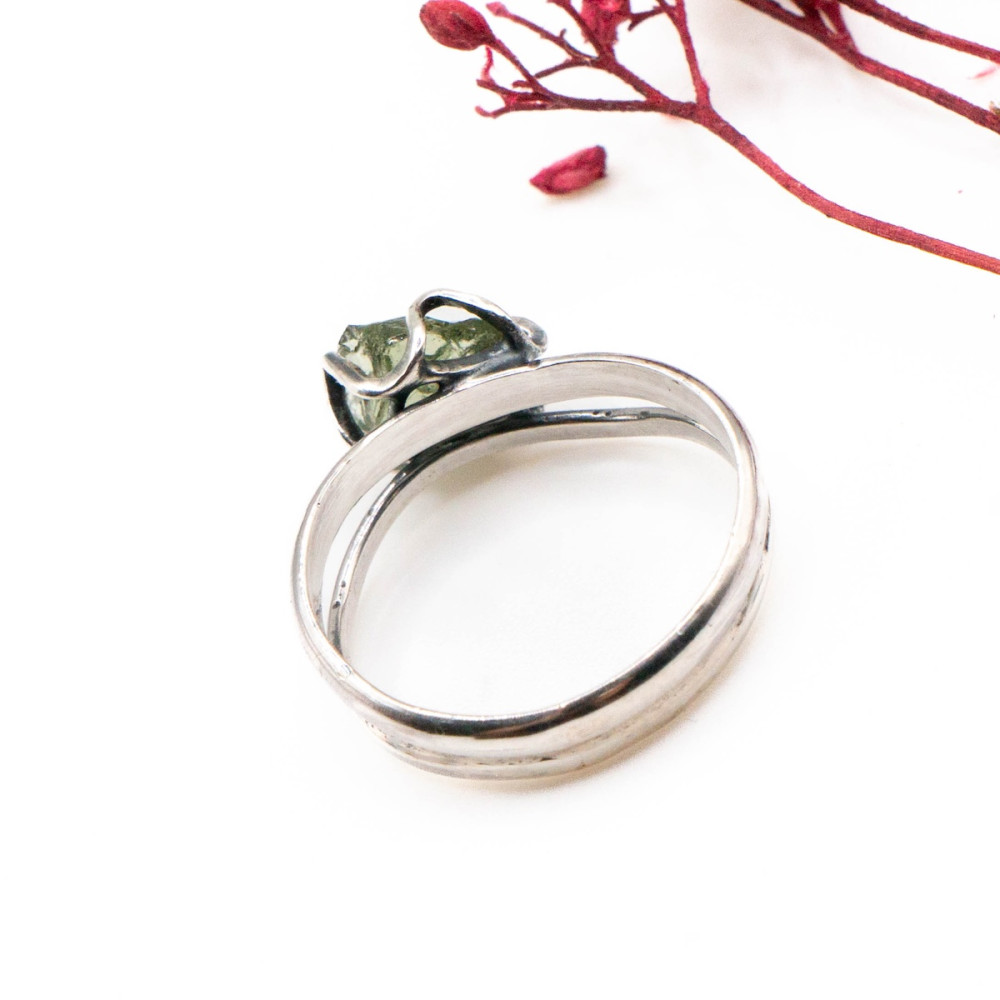 Повітряна авторська каблучка зі срібла з молдавитом — прикраса, у якій поєднуються легкість форми та космічна енергія каменю. Прозорий зелений молдавит ніби ширяє в срібній оправі, пропускаючи світло й створюючи відчуття руху та глибини.