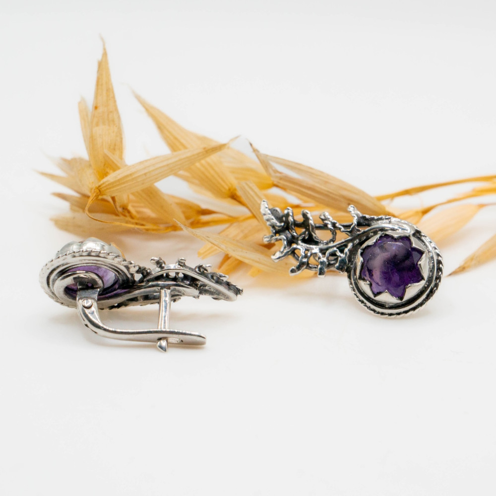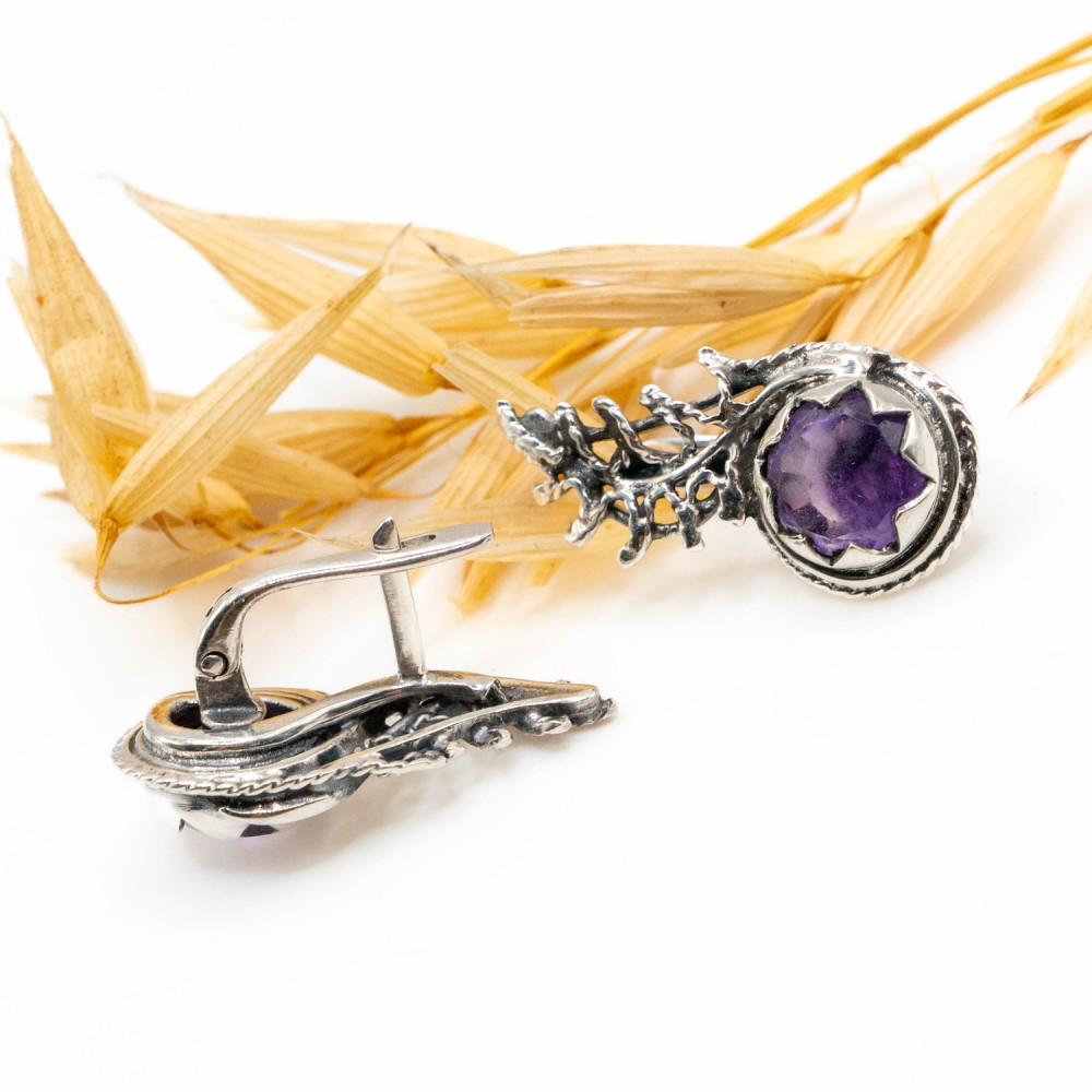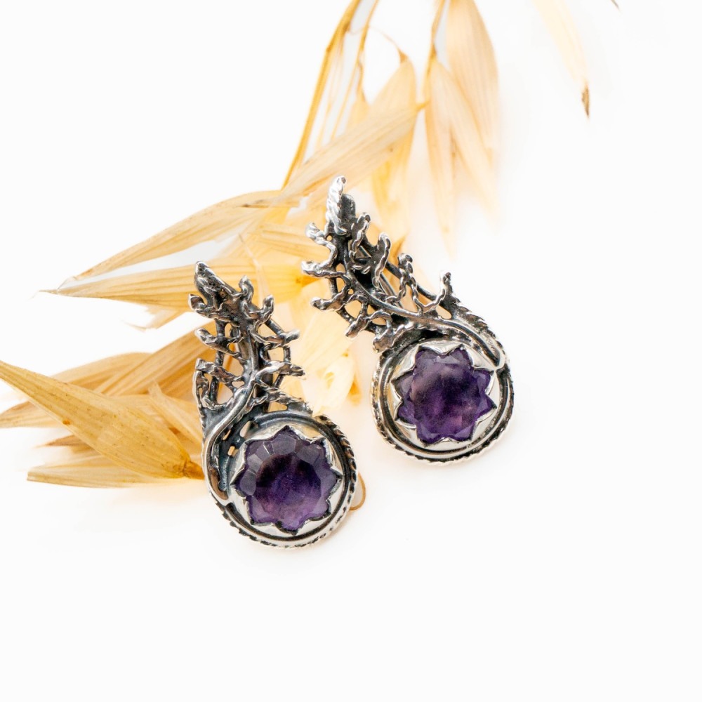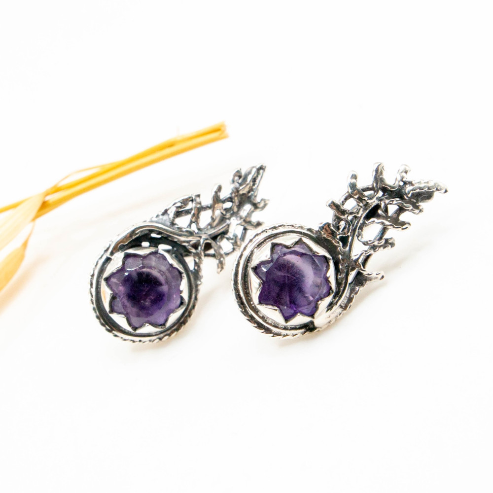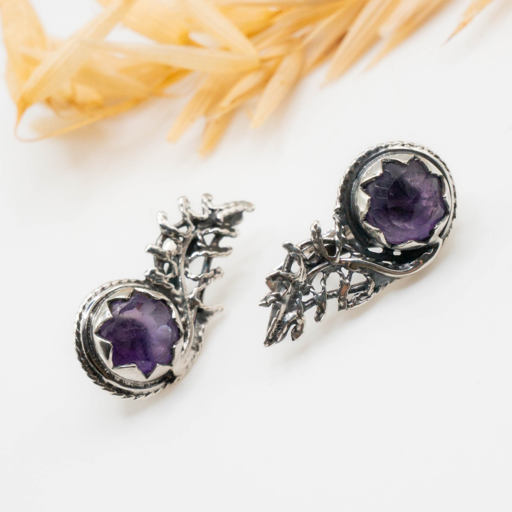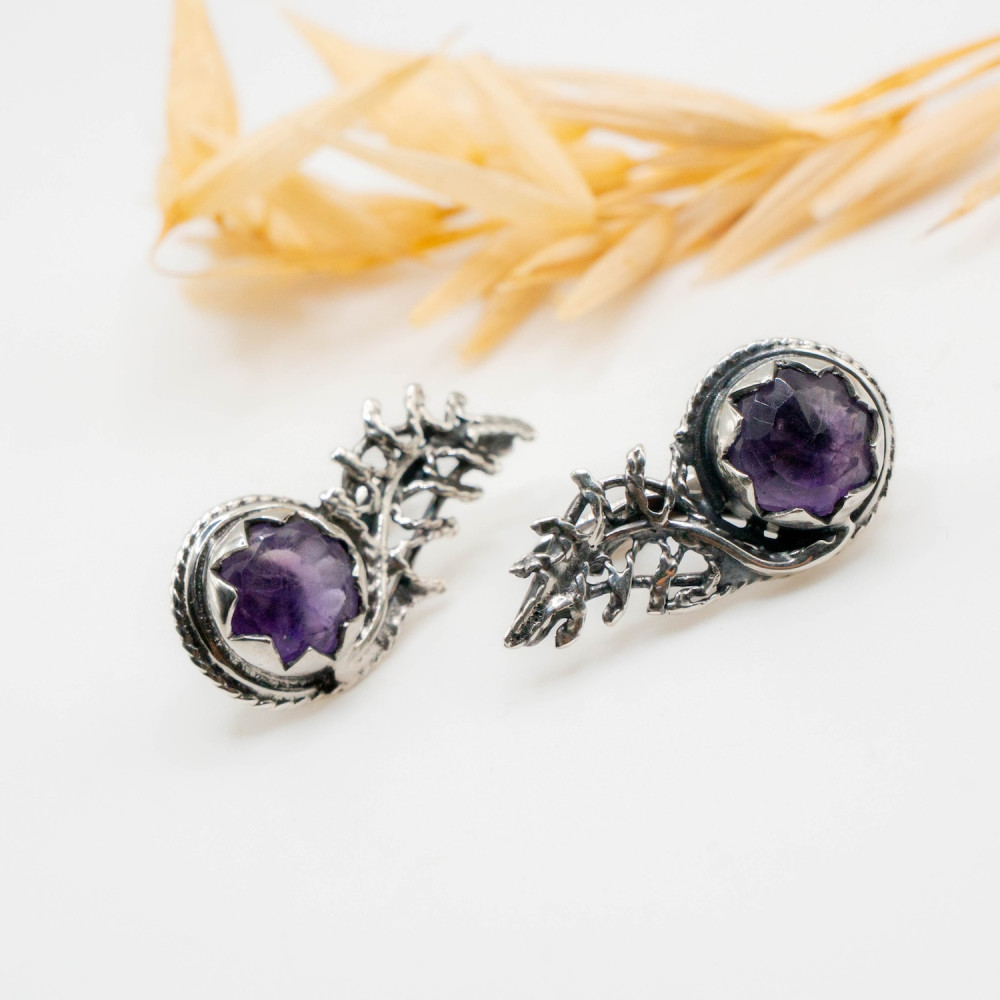 У цих сережках срібло ніби проростає, як жива гілка у туманному лісі. Органічний дизайн створює відчуття природного руху: метал вигинається у вигляді тендітних гілочок, що переплітаються та обіймають камінь. Фактура срібла навмисно нерівна, жива, з легким патинуванням, яке підкреслює глибину рельєфу та нагадує стародавні прикраси, знайдені серед скель або коріння дерев. У центрі композиції — природний мінерал, огранений у формі квітки. Фіолетовий аметист сяє м’яким, містичним світлом, створюючи контраст із прохолодним блиском срібла. Ця авторська прикраса — не просто аксесуар, а маленька скульптура, створена для тих, хто цінує мистецтво, яке можна носити.