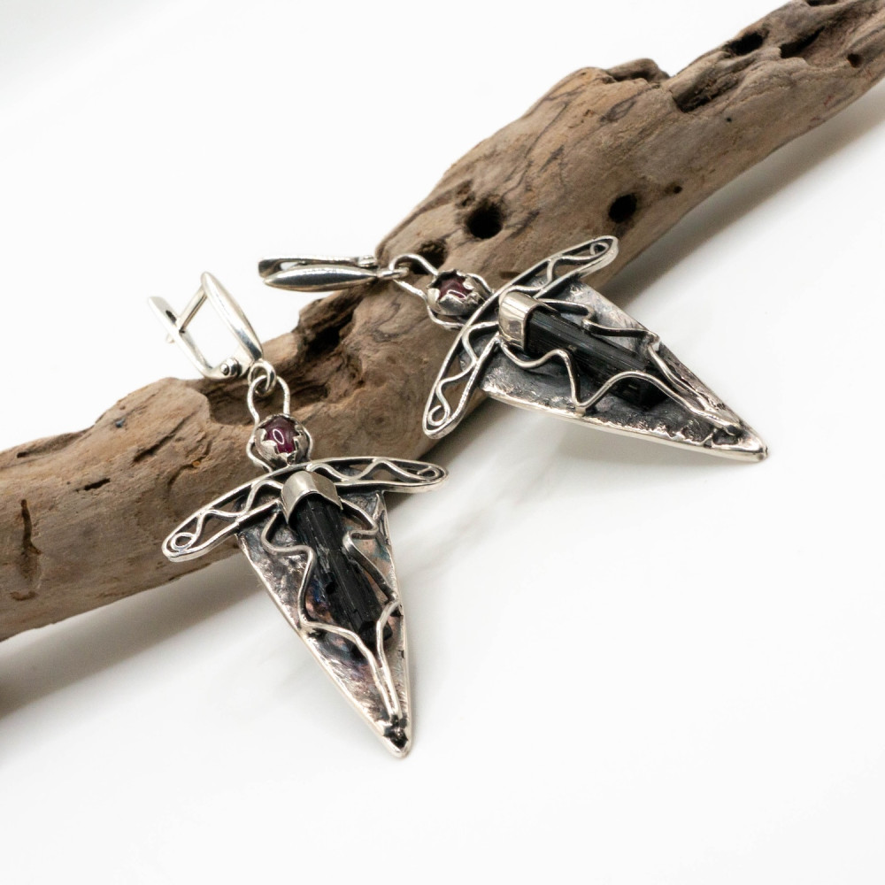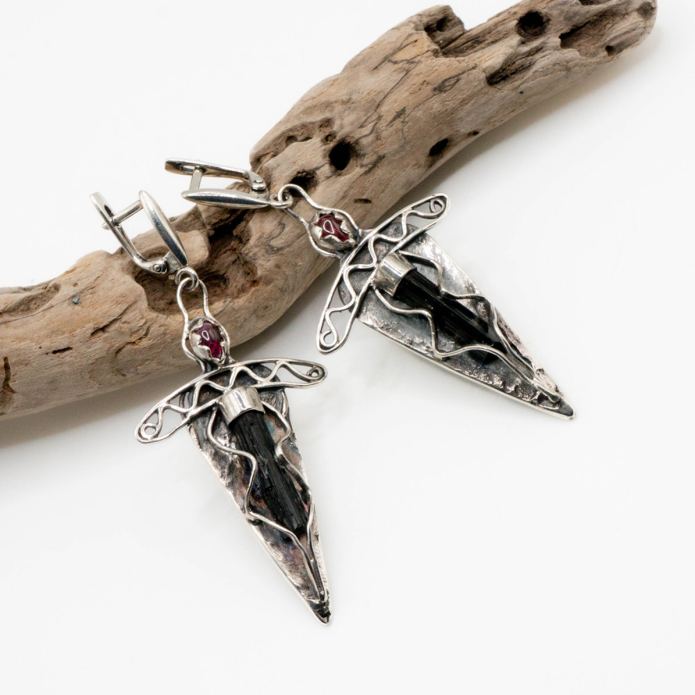 Ці сережки нагадують ритуальні амулети або наконечники стріл. Подовжена, загострена форма візуально витягує силует, а необроблений чорний турмалін стає центром композиції. Срібло має ковану, злегка «зморщену» фактуру з темною патиною, що підсилює відчуття органічності. Маленькі гранати над кристалами додають глибини та внутрішнього світіння.