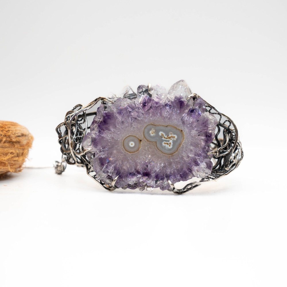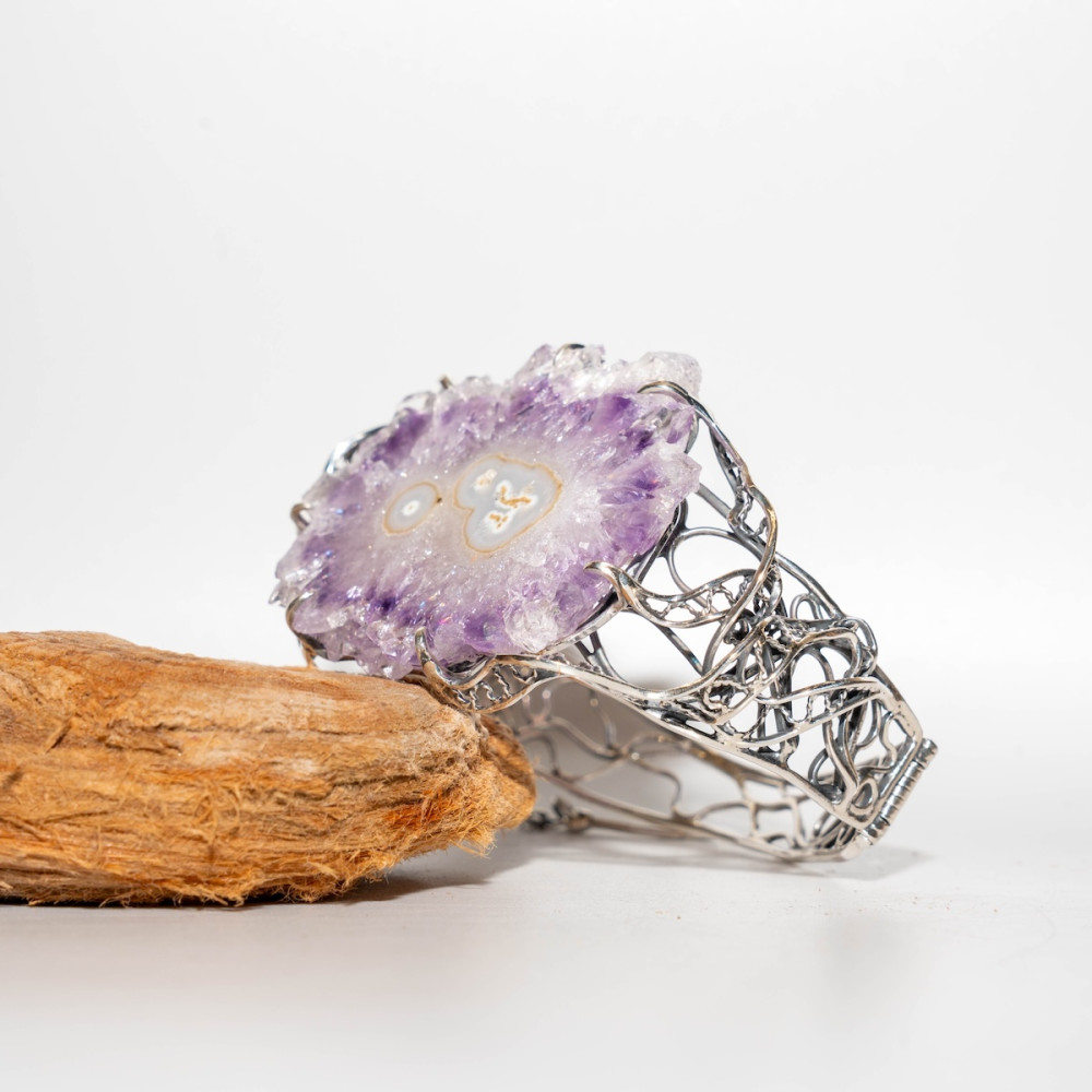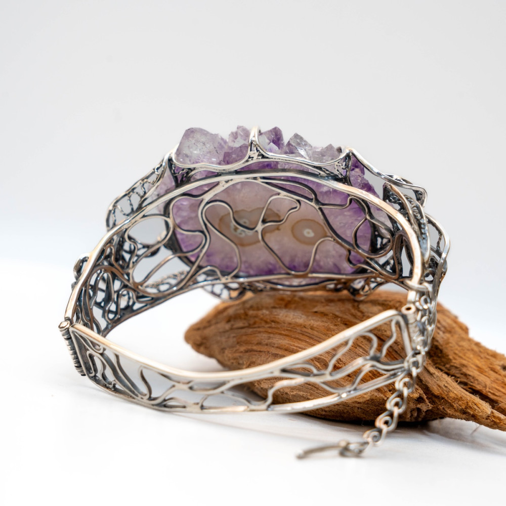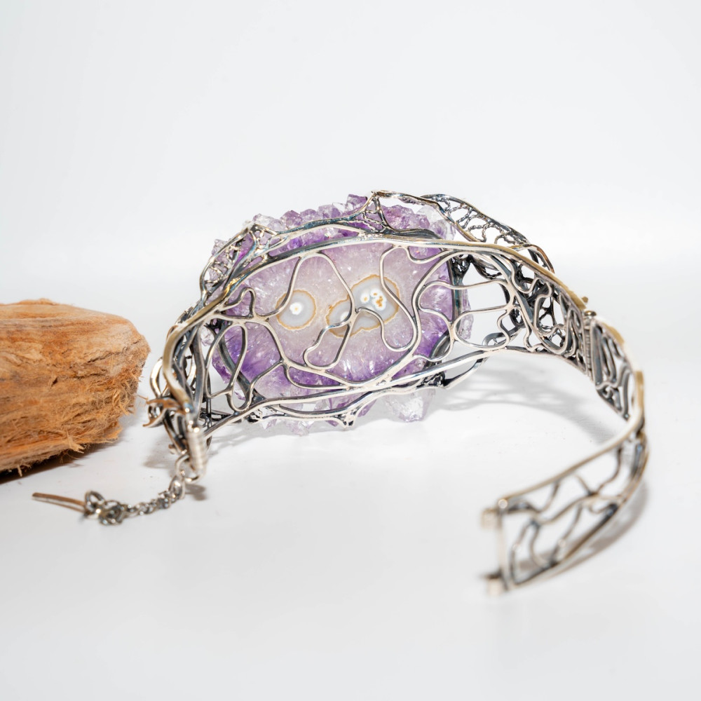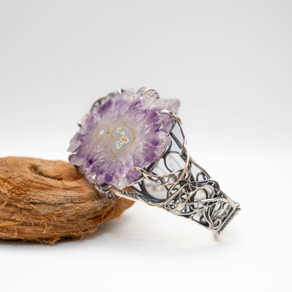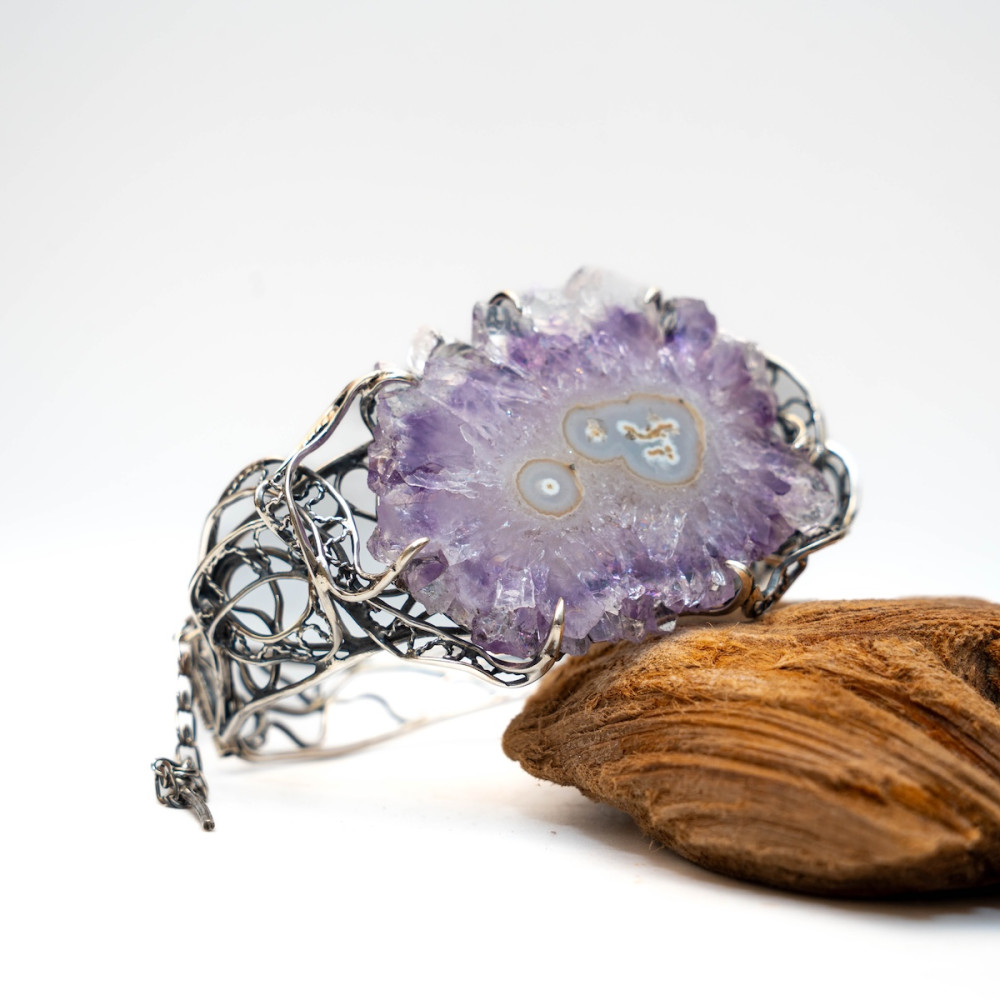 Широкий срібний браслет з аметистовою трояндою — виразна прикраса з сильним характером і природною енергетикою. У центрі — унікальна аметистова роза у зрізі, де кристали формують витончений квітковий візерунок. Ніжні лавандово-фіолетові відтінки мерехтять у світлі, відкриваючи глибину й живу фактуру каменю. Ажурна срібна основа, схожа на переплетіння коріння та гілок, додає браслету об’ємності й сили. Це прикраса для тих, хто обирає індивідуальність і зв’язок із природою.