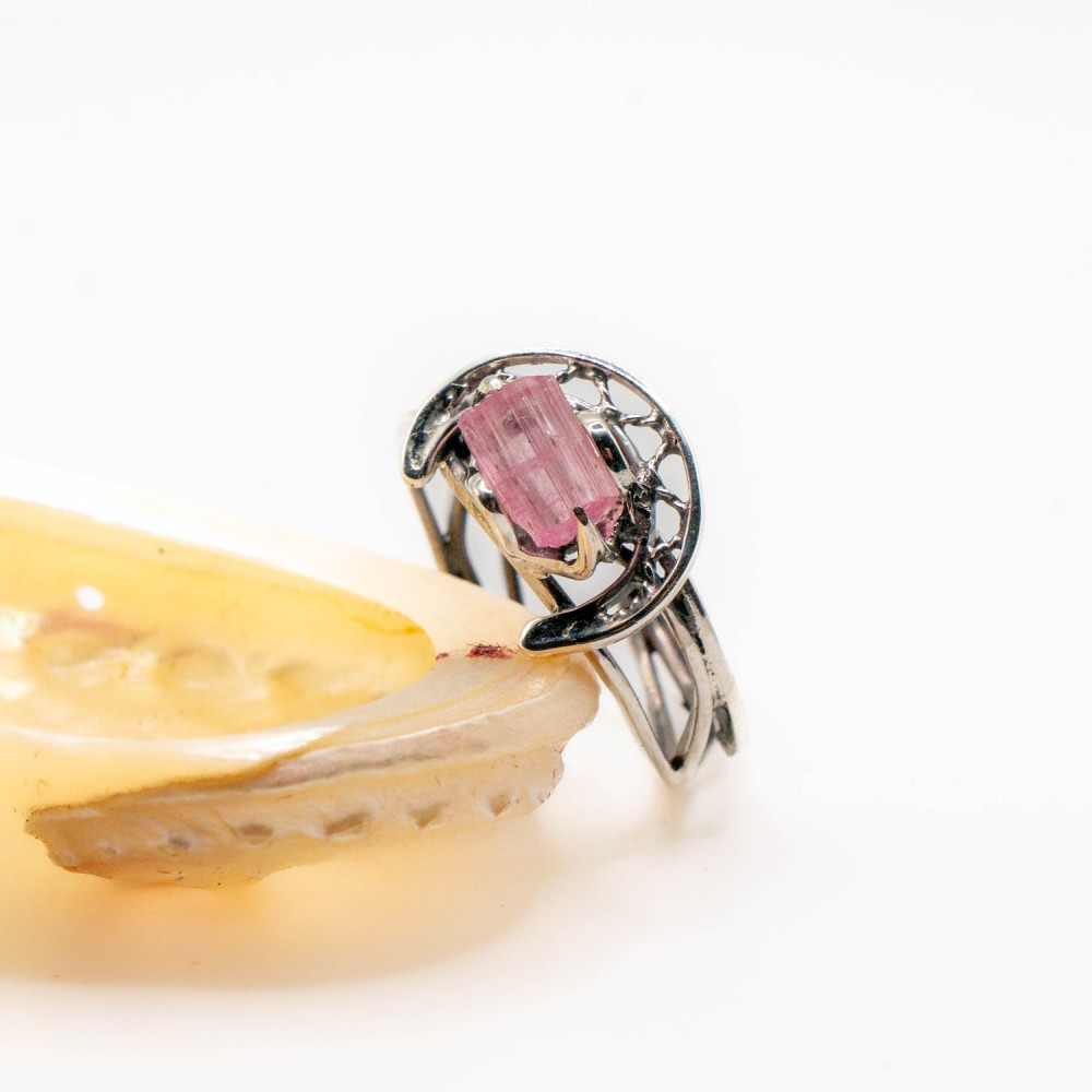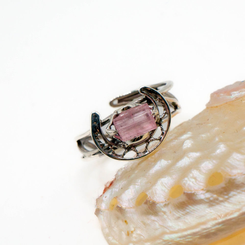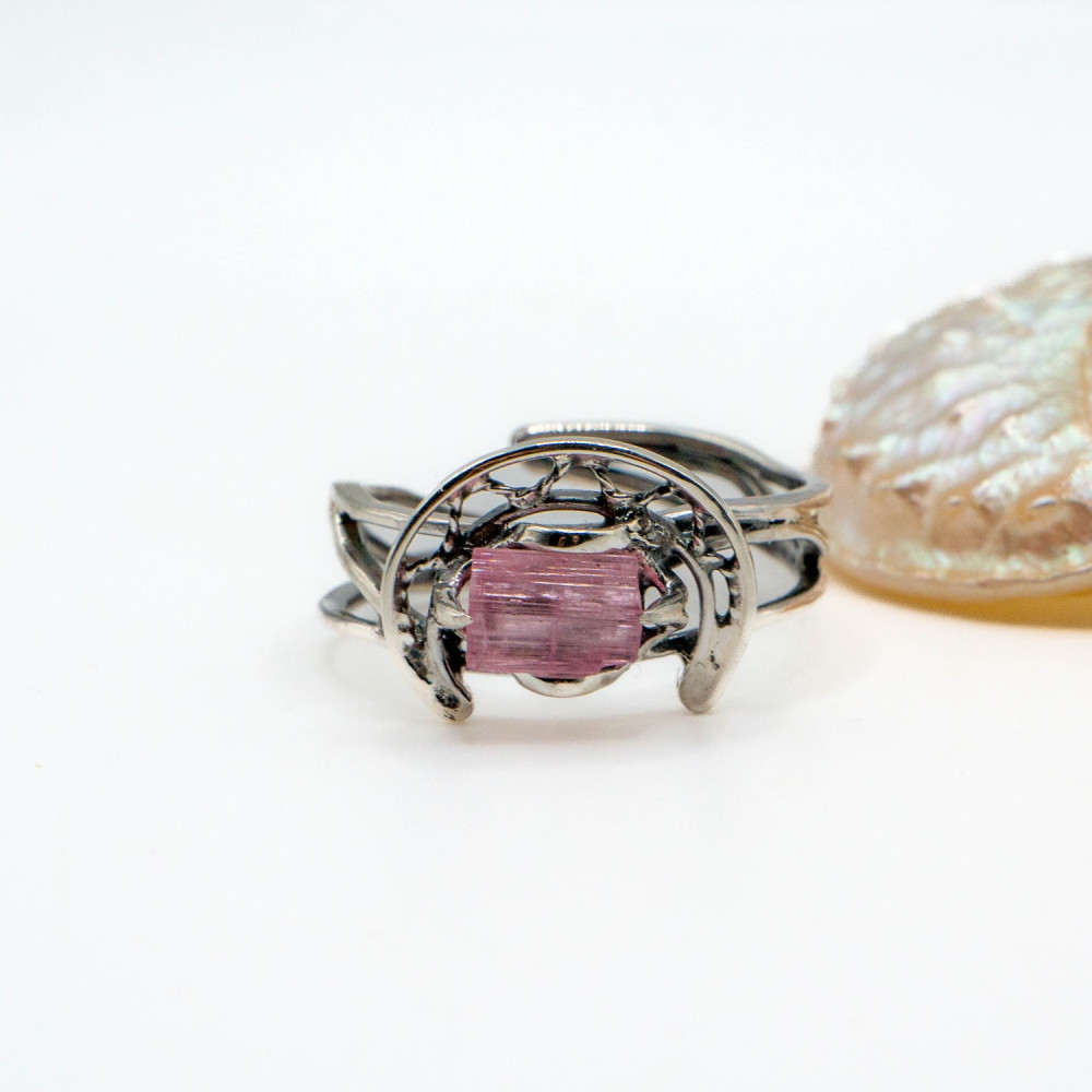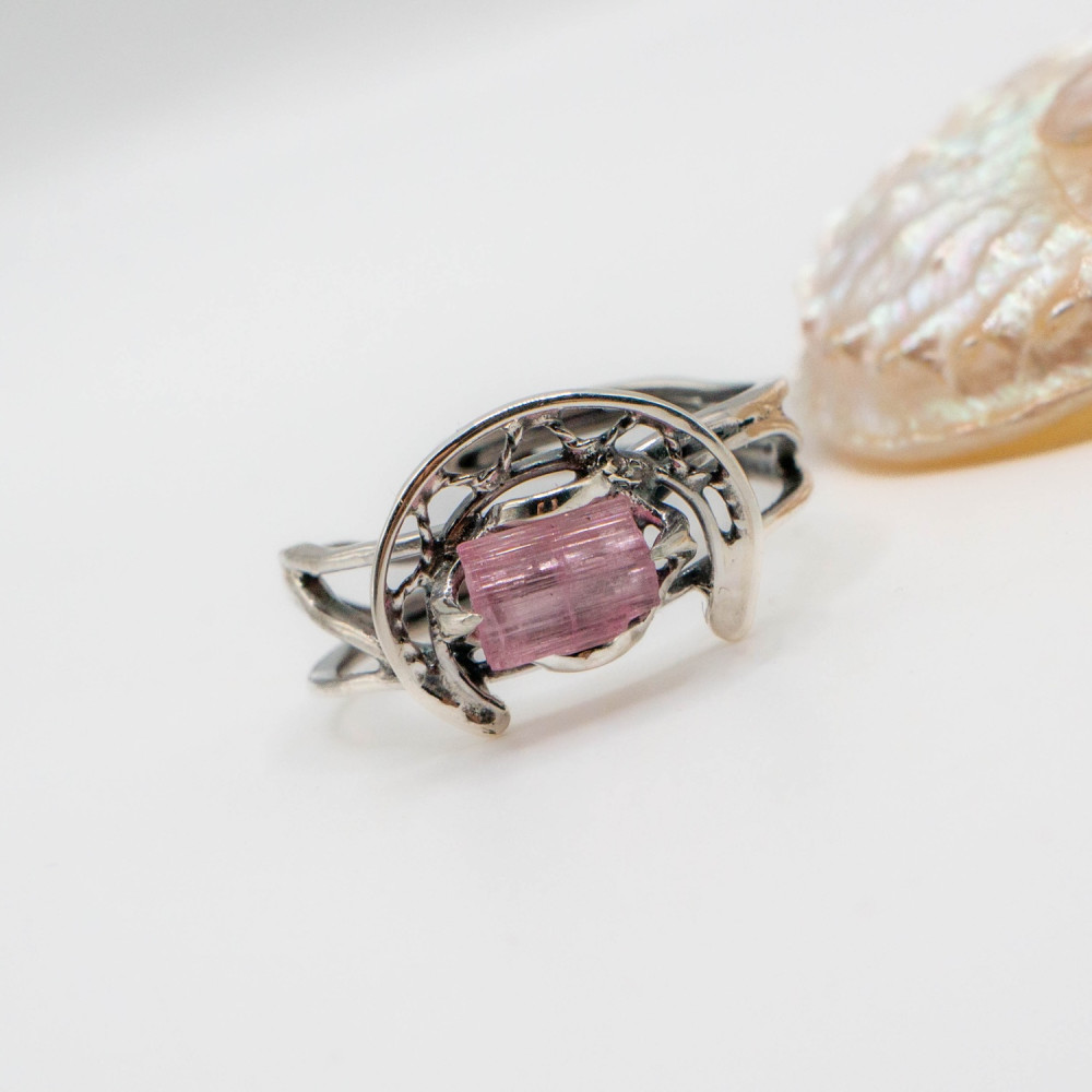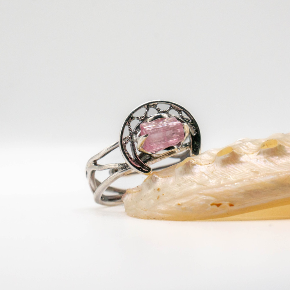 Ця каблучка звучить тихо, але впевнено. Ніжний рожевий турмалін збережений у своїй природній кристалічній формі — з тонкими лініями росту, прозорістю та внутрішнім світінням. Срібна оправа не приховує камінь, а обережно тримає його, створюючи відчуття рівноваги між легкістю й структурою. Органічний дизайн поєднується з чіткою геометрією, ніби фіксуючи мить спокою та внутрішньої гармонії.