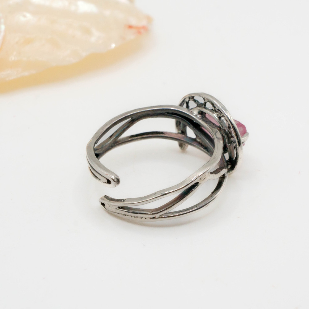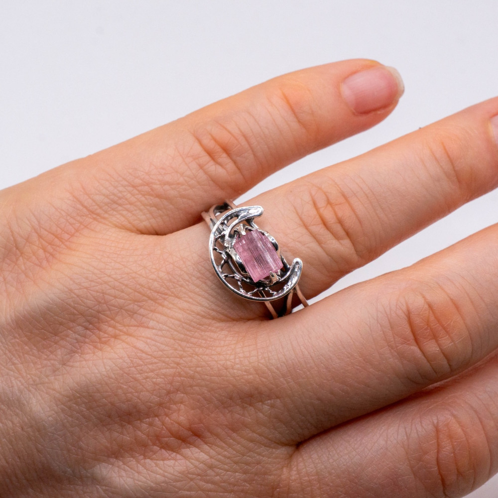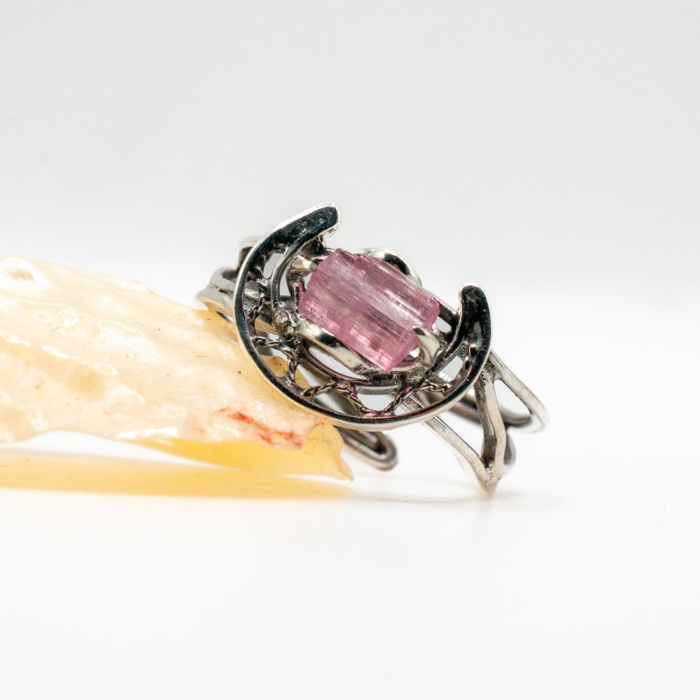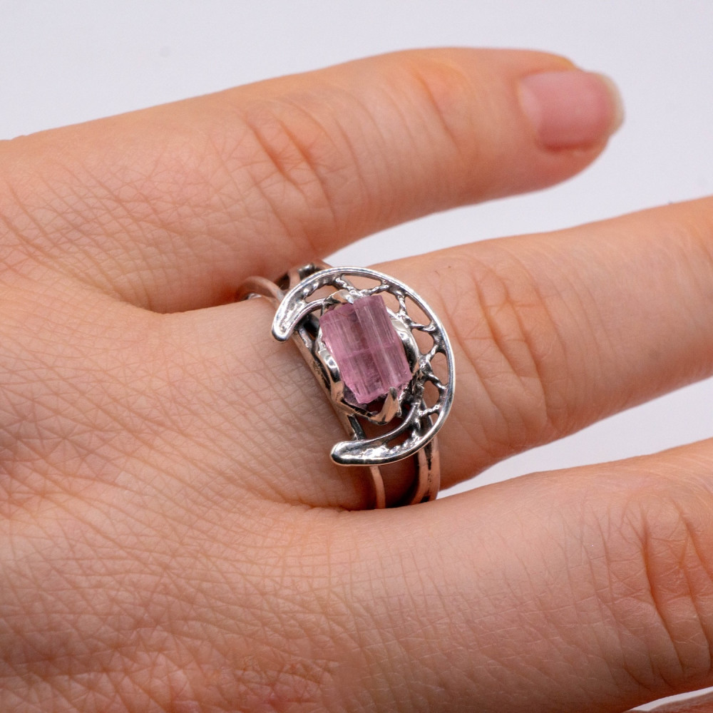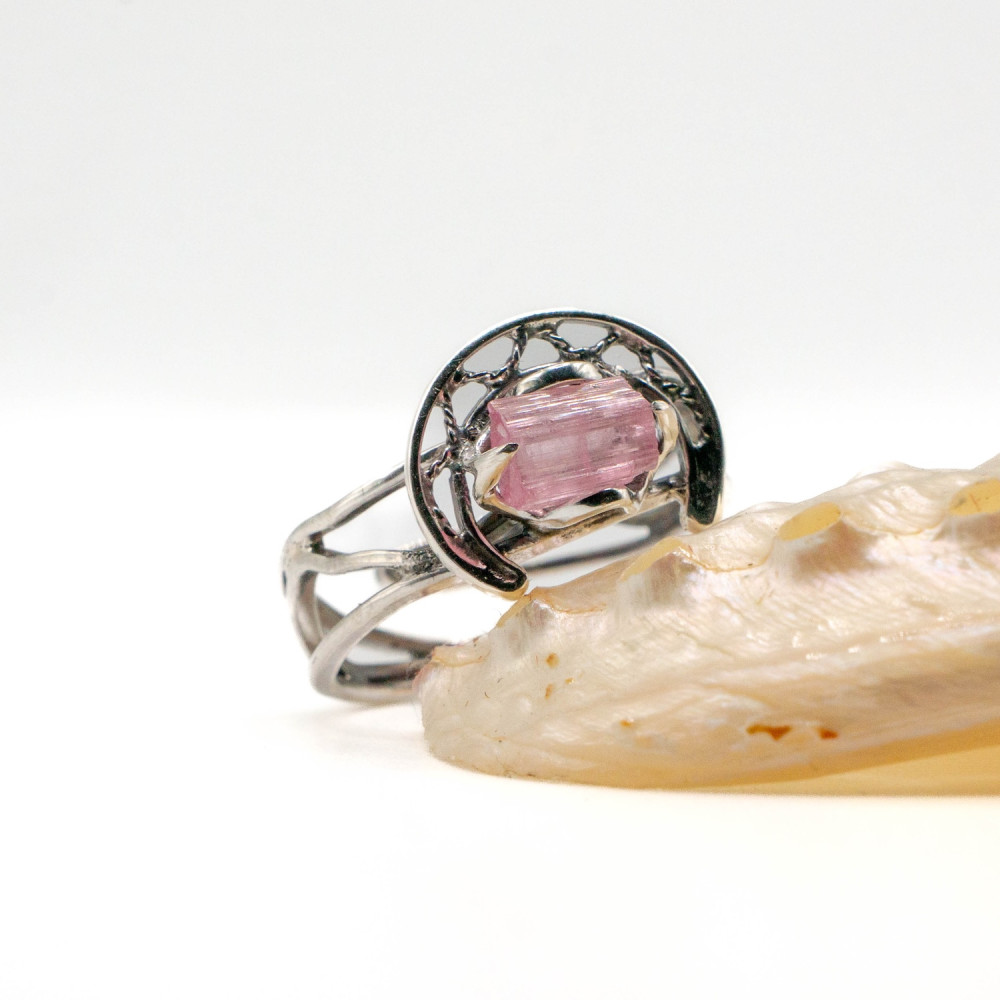 Ця каблучка звучить тихо, але впевнено. Ніжний рожевий турмалін збережений у своїй природній кристалічній формі — з тонкими лініями росту, прозорістю та внутрішнім світінням. Срібна оправа не приховує камінь, а обережно тримає його, створюючи відчуття рівноваги між легкістю й структурою. Органічний дизайн поєднується з чіткою геометрією, ніби фіксуючи мить спокою та внутрішньої гармонії.