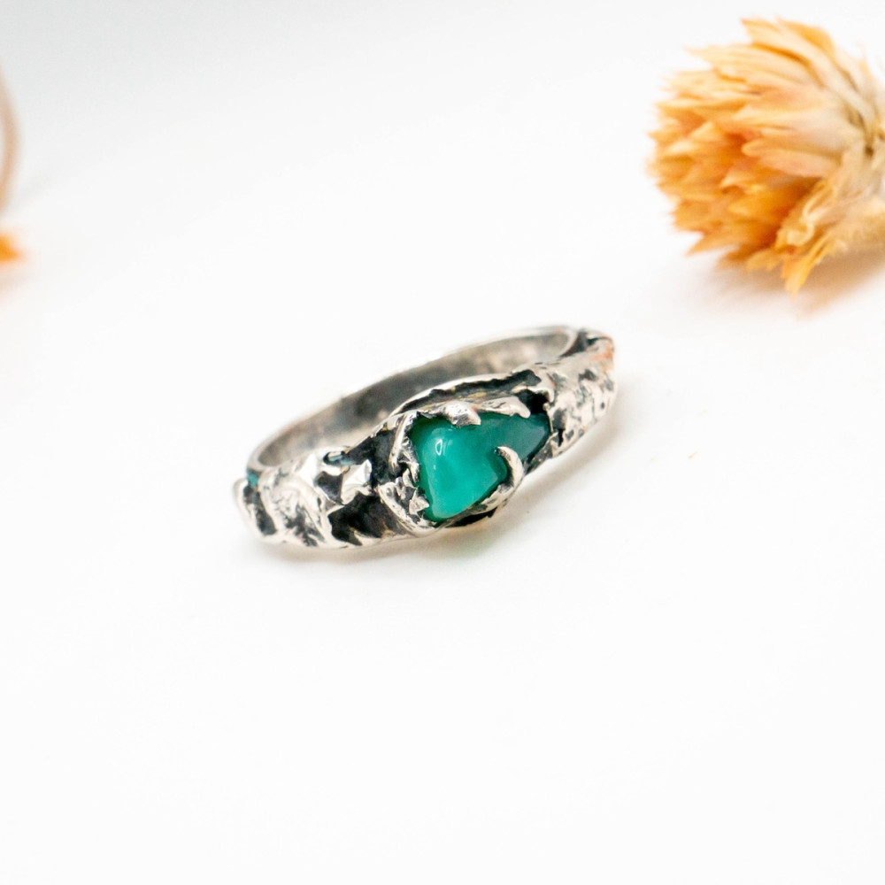 Срібна каблучка, в центрі якої сяє натуральний хризопраз - камінь свіжості та гармонії.