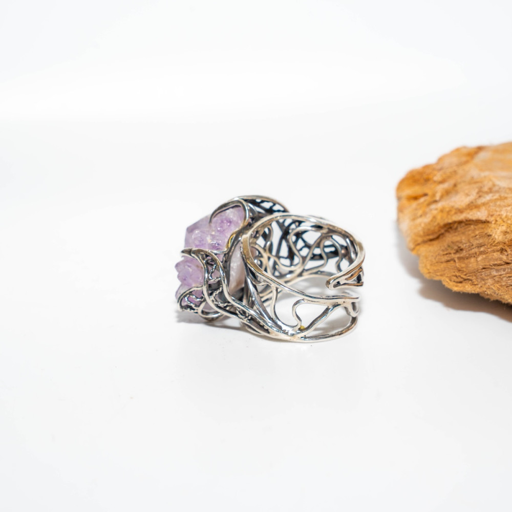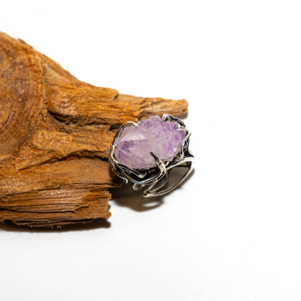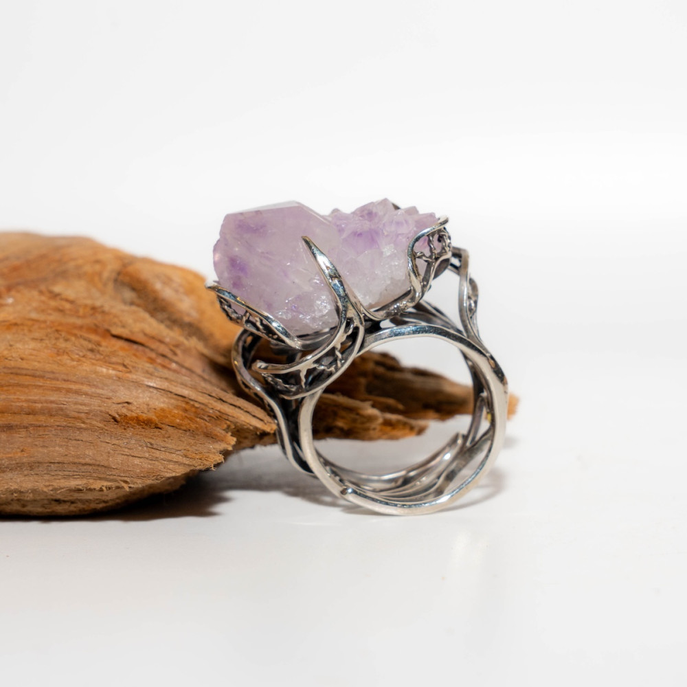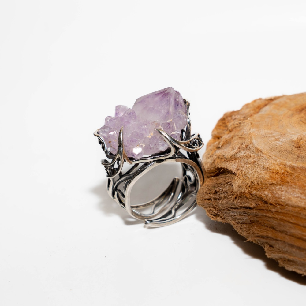 Срібна каблучка з аметистовою друзою — прикраса з первозданною, дикою красою. Натуральні кристали аметисту зберегли свою природну форму, переливаючись ніжними фіолетовими відтінками. Ажурна срібна оправа дбайливо тримає друзу, підкреслюючи її об’єм і унікальність. Ця каблучка — справжній талісман, що несе енергію гармонії, інтуїції та внутрішнього балансу.