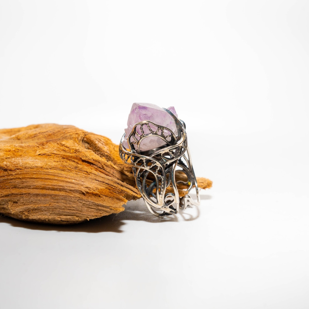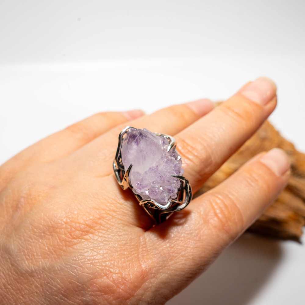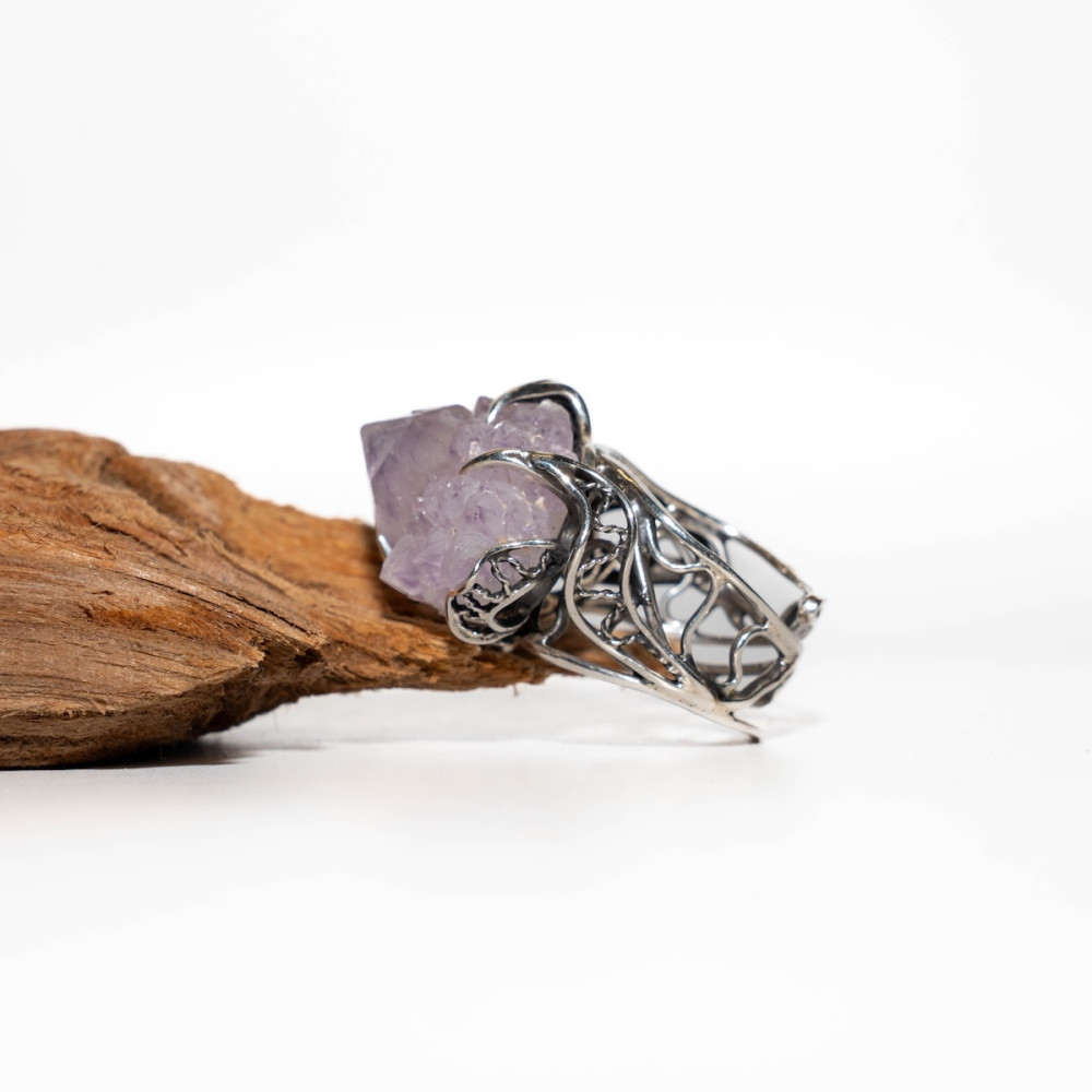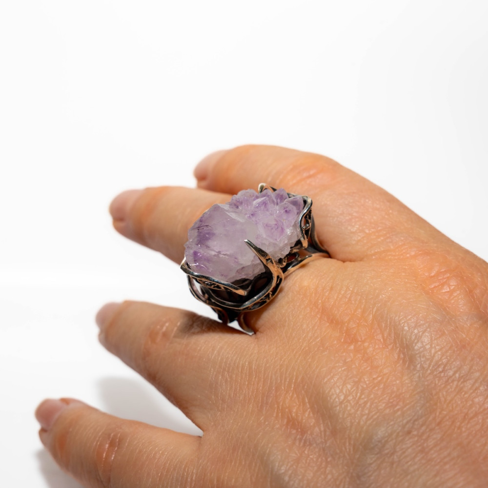 Срібна каблучка з аметистовою друзою — прикраса з первозданною, дикою красою. Натуральні кристали аметисту зберегли свою природну форму, переливаючись ніжними фіолетовими відтінками. Ажурна срібна оправа дбайливо тримає друзу, підкреслюючи її об’єм і унікальність. Ця каблучка — справжній талісман, що несе енергію гармонії, інтуїції та внутрішнього балансу.