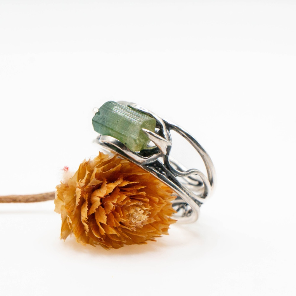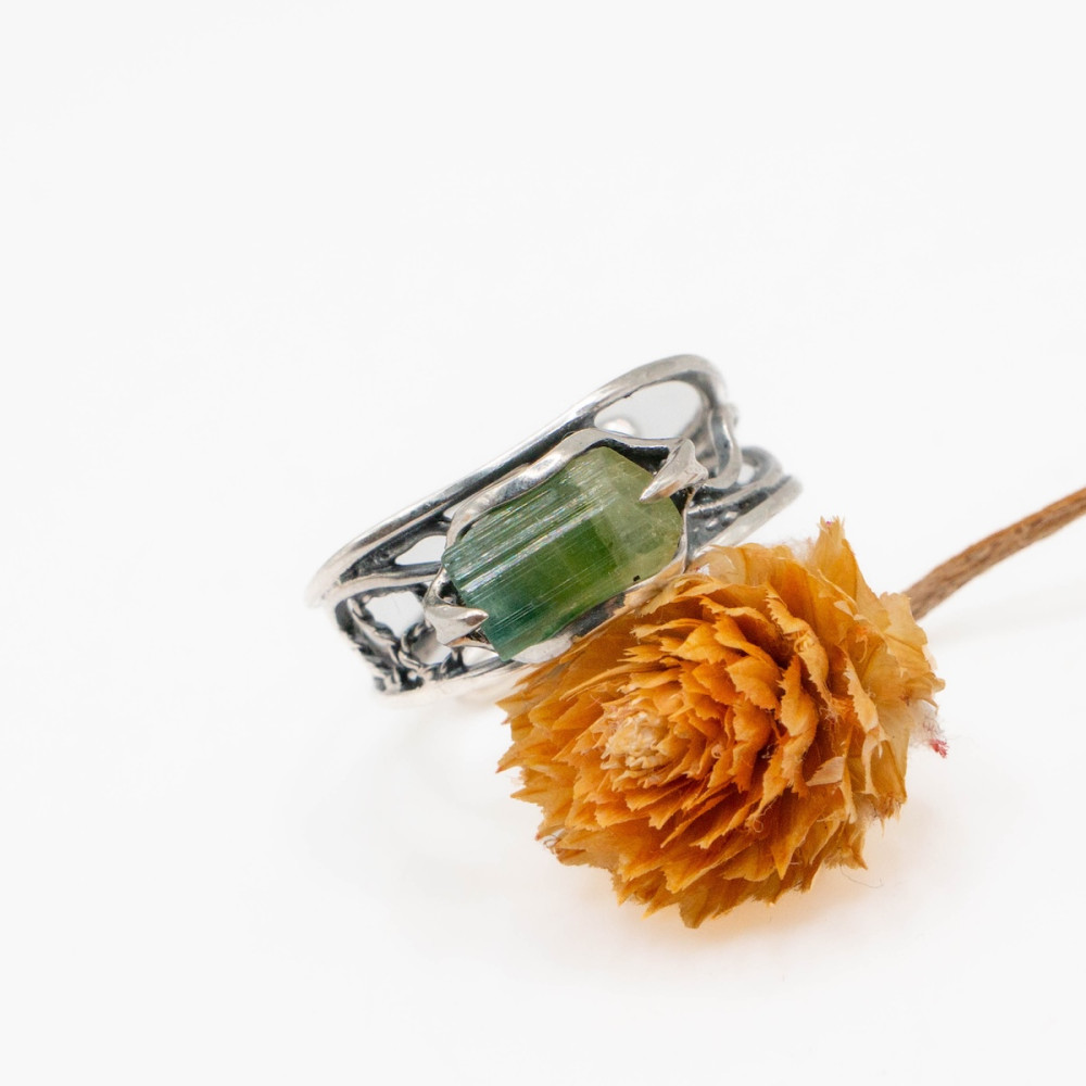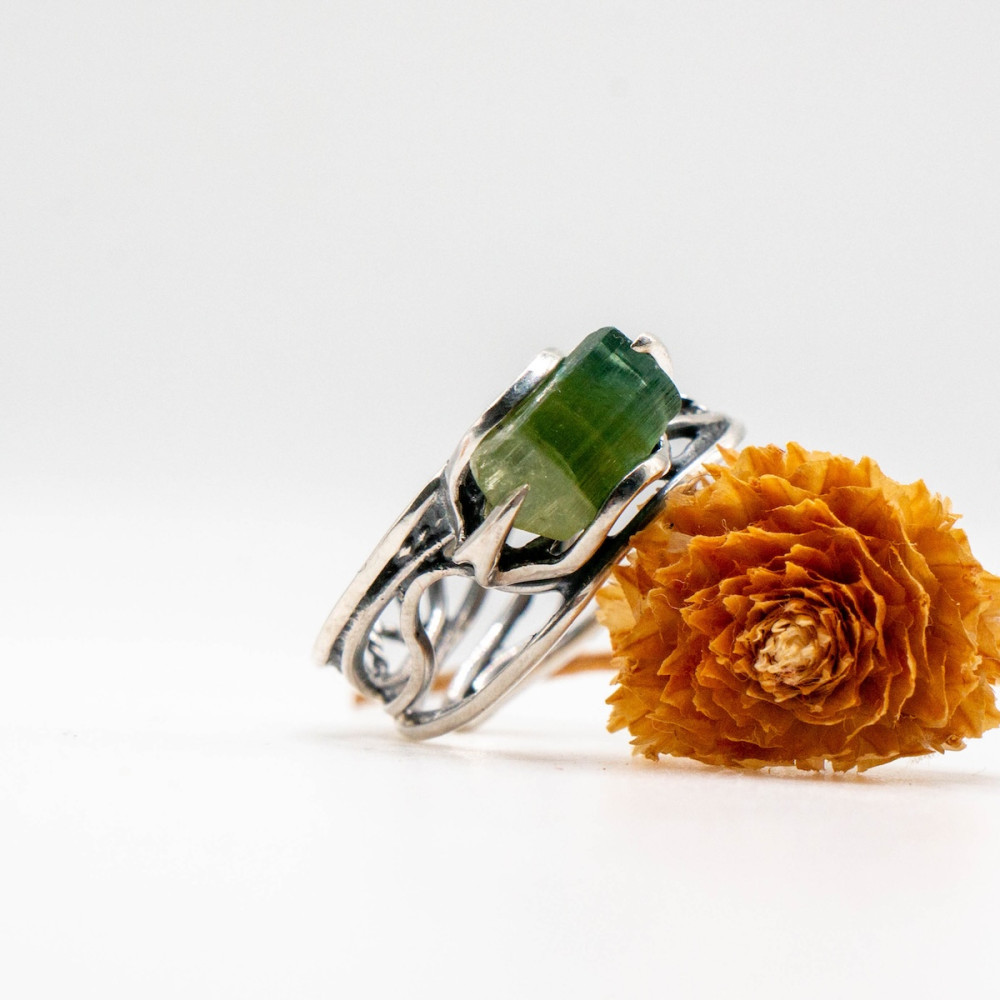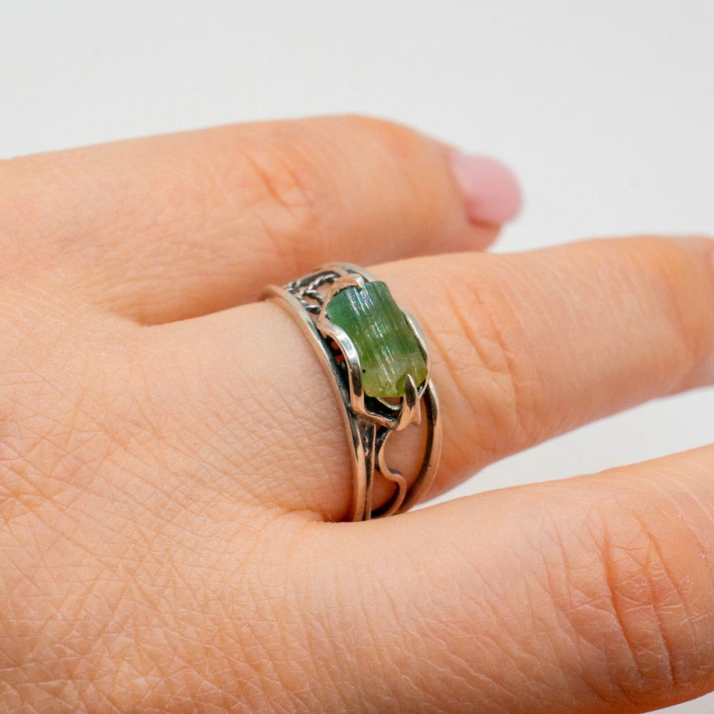 Срібна каблучка з цілісним кристалом зеленого турмаліну — прикраса, яка підтримує зсередини.