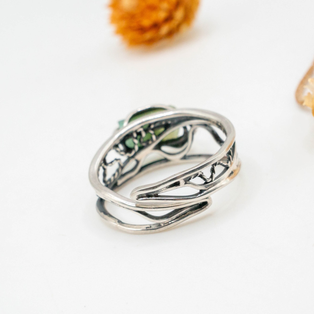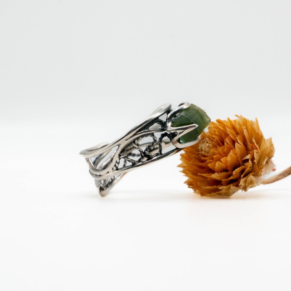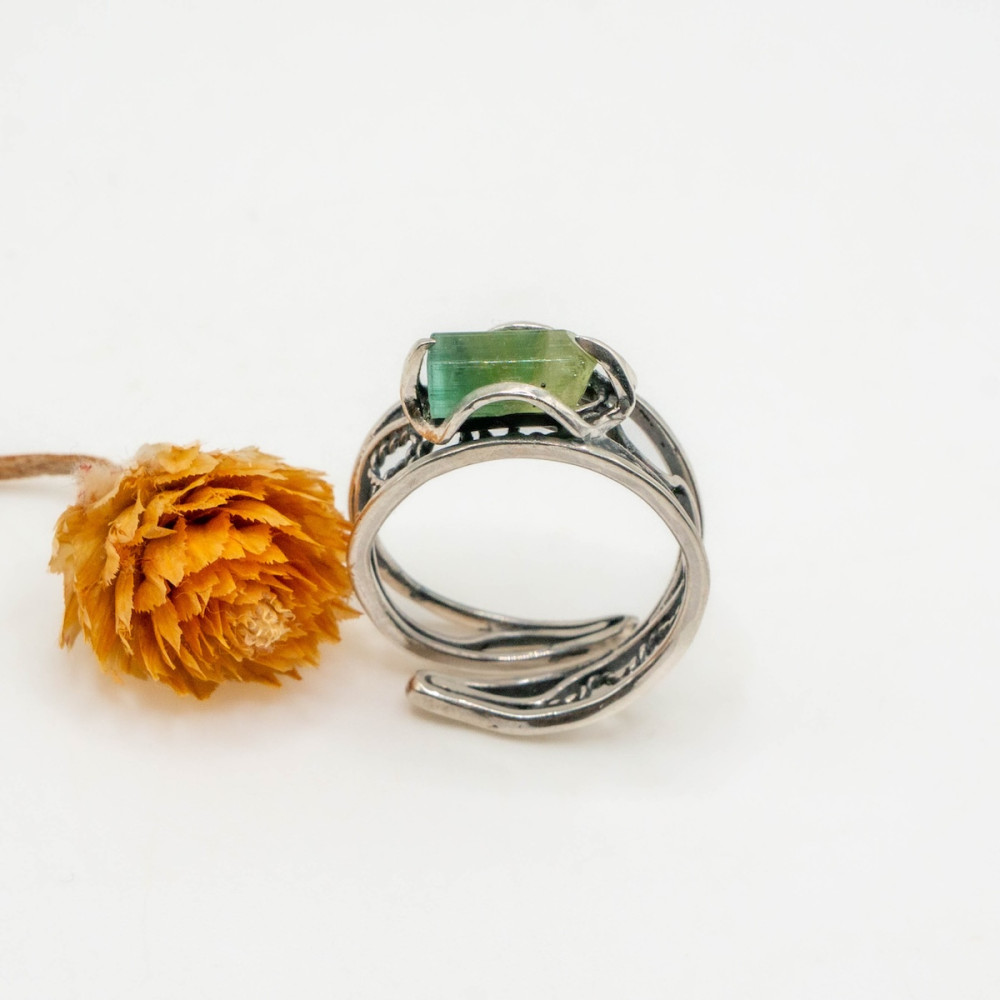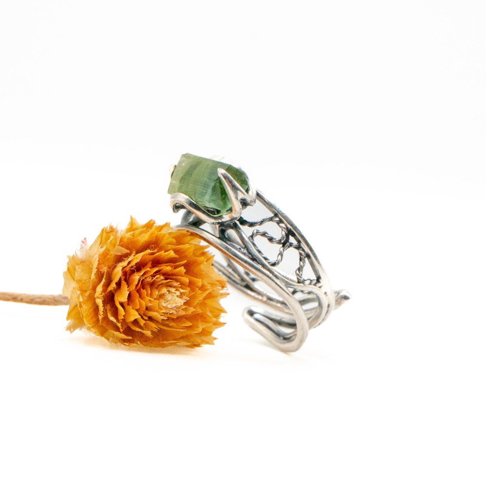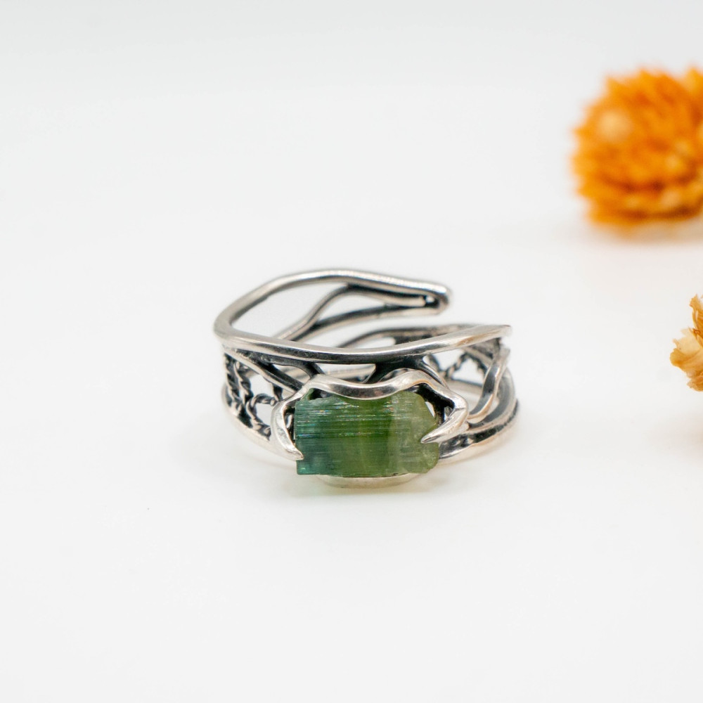 Срібна каблучка з цілісним кристалом зеленого турмаліну — прикраса, яка підтримує зсередини.
