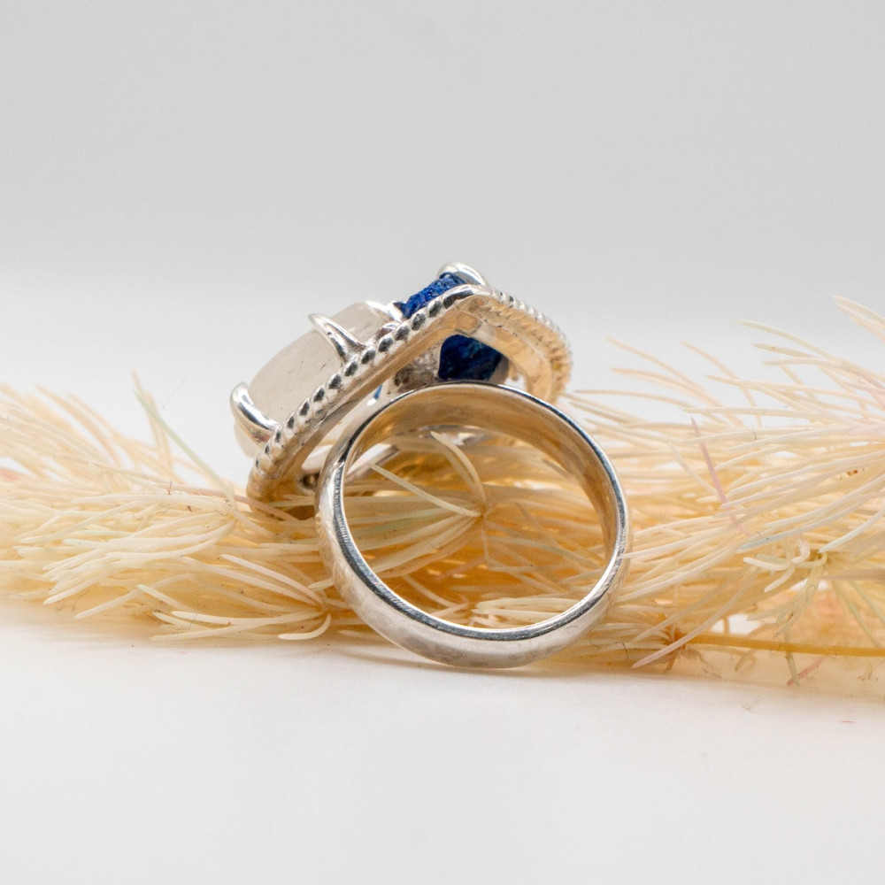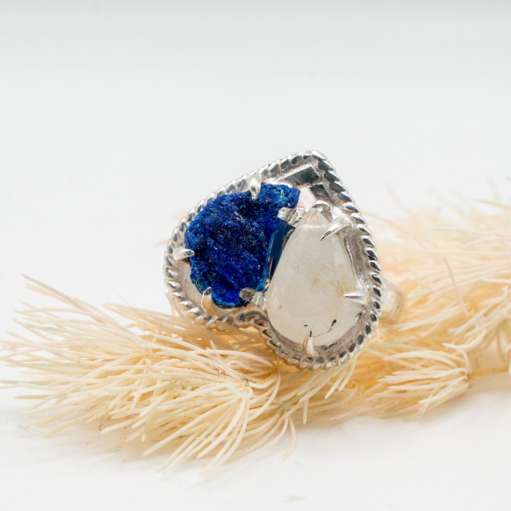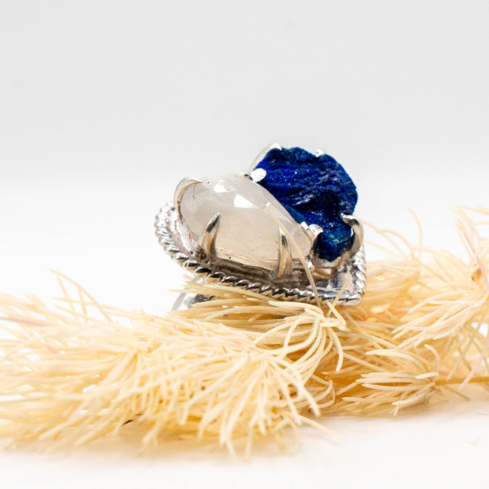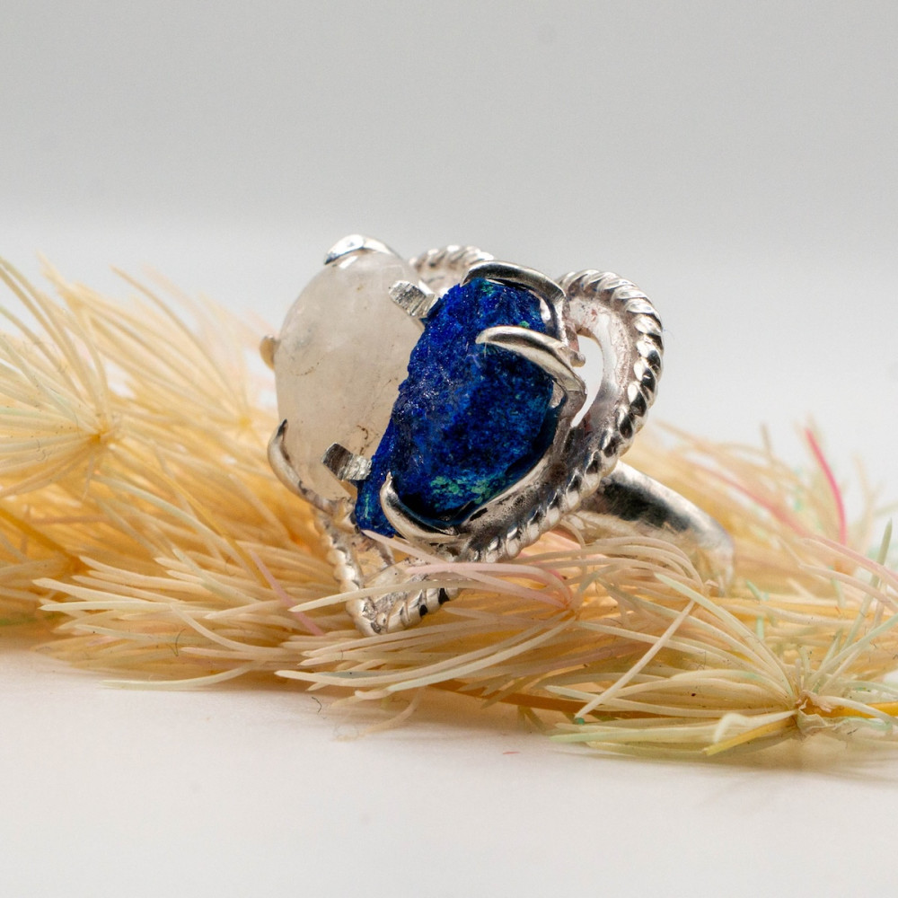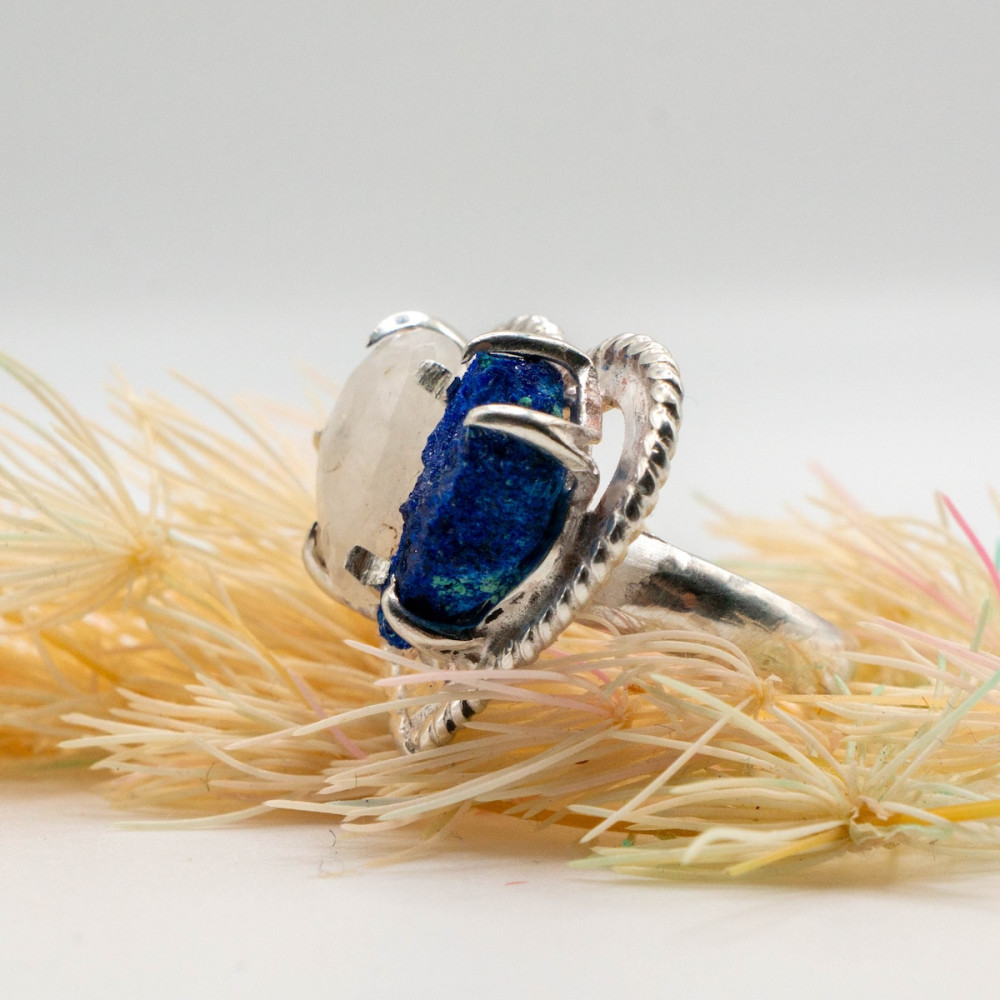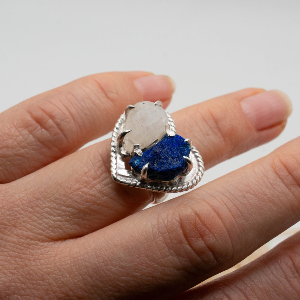 Срібна каблучка з місячним каменем та азуритом — це маленький всесвіт, втілений у прикрасі.