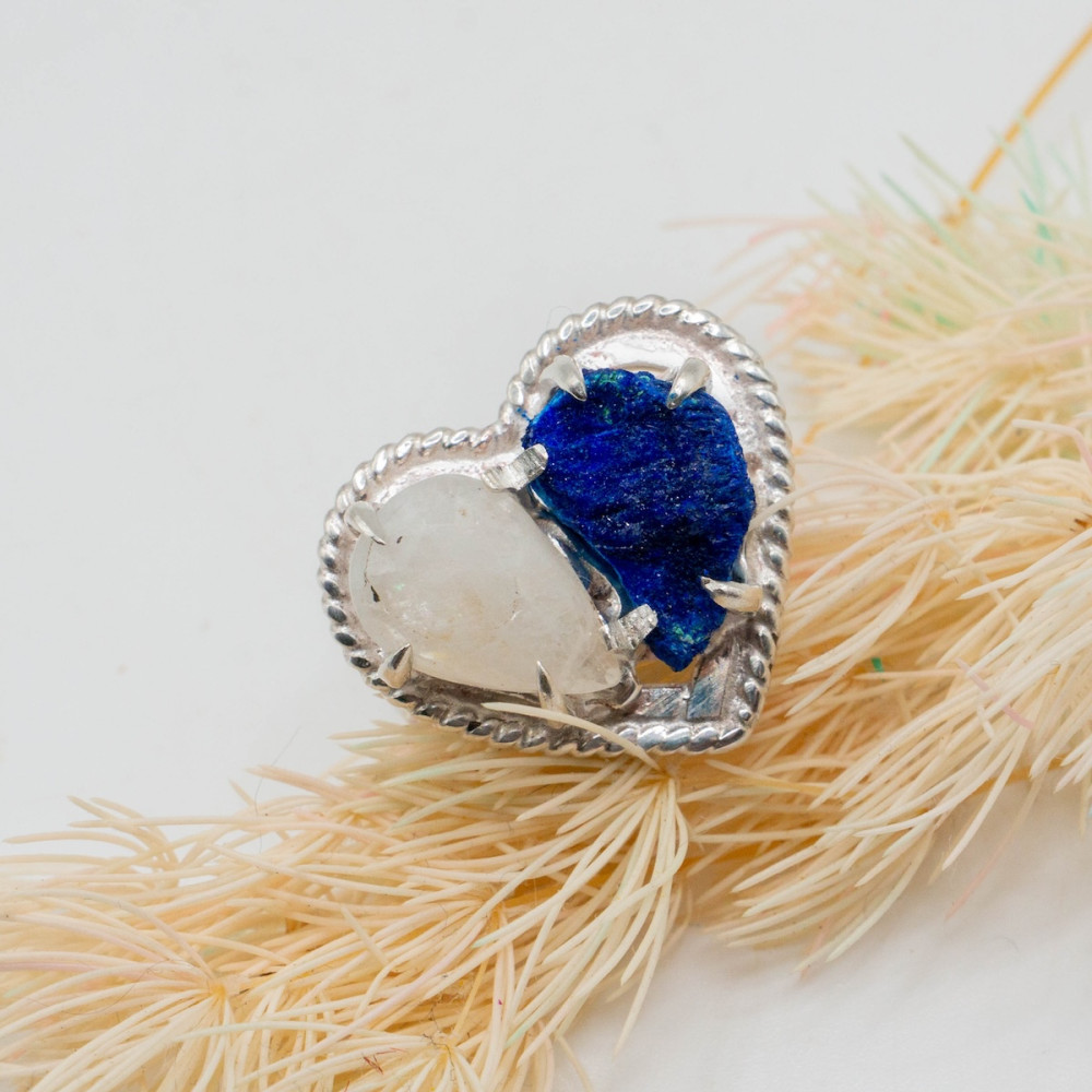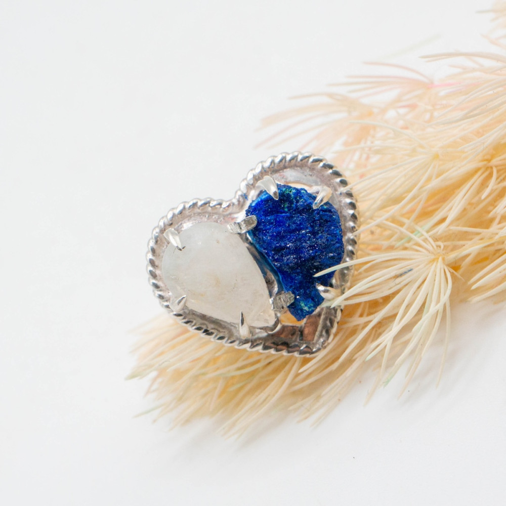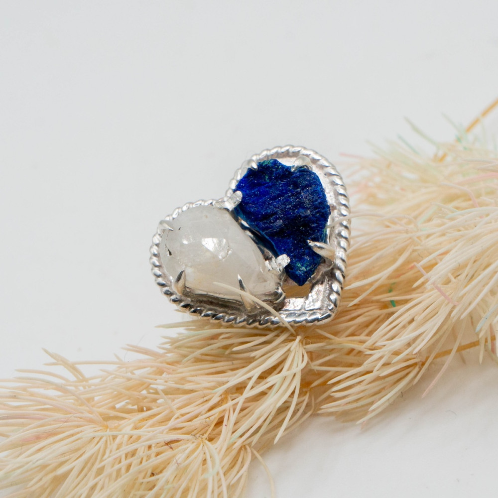 Сердечко зі срібла поєднує два природні скарби: ніжний, світлий місячний камінь та глибокий, оксамитово-синій азурит.