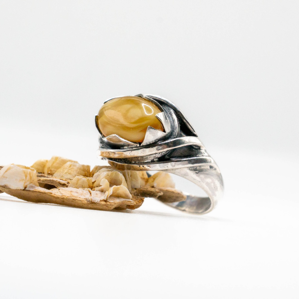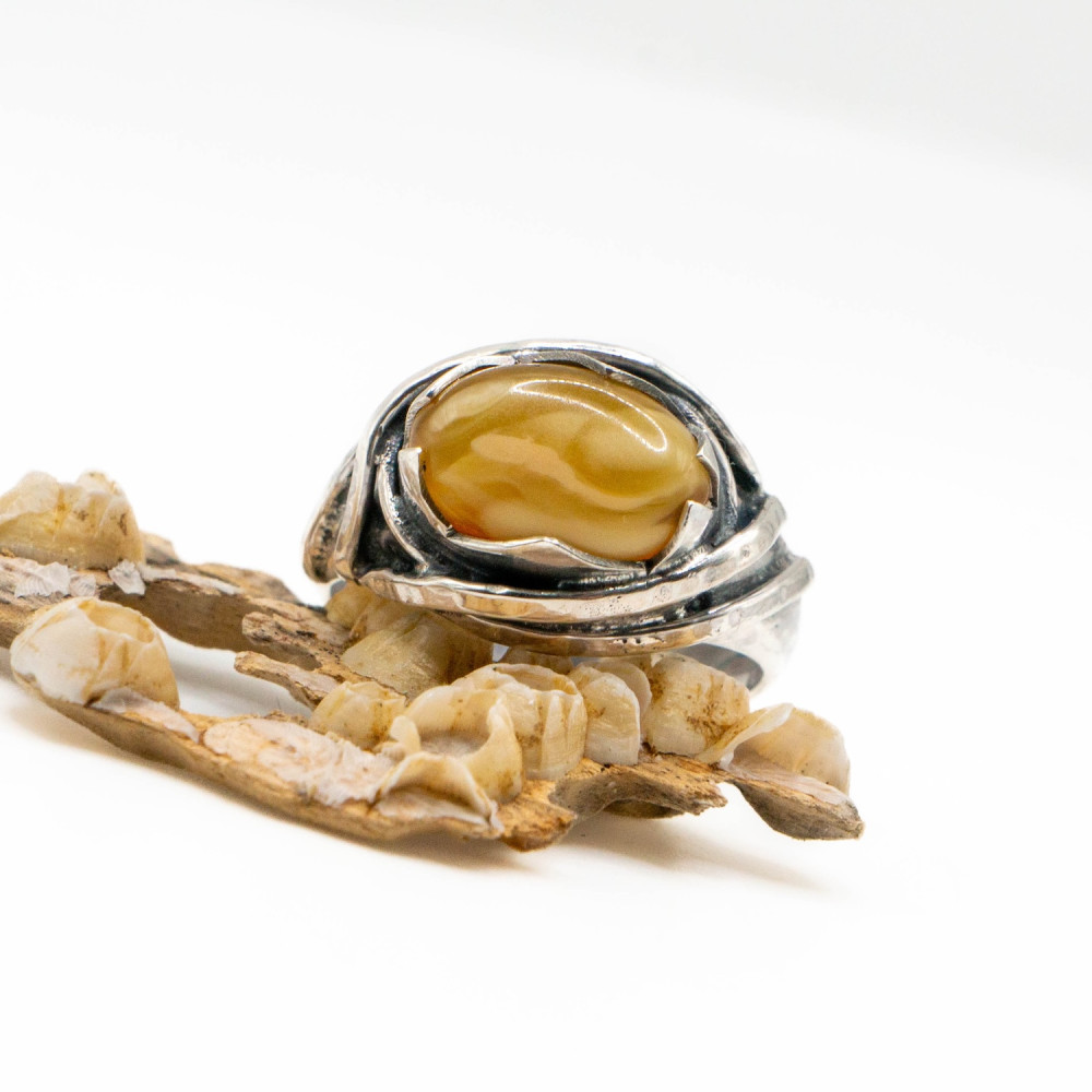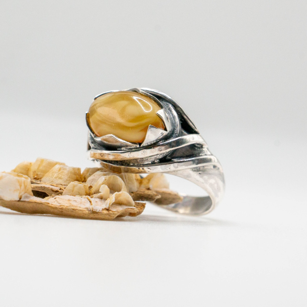 Ця авторська прикраса створена так, ніби срібло обережно огортає шматочок застиглого сонця. Органічні лінії металу формують м’яку, майже природну оправу, яка повторює форму каменю та створює відчуття руху. Гладке поліроване срібло з легкими хвилястими контурами нагадує природні потоки — ніби метал плавно обтікає бурштин, підкреслюючи його теплу глибину. Такий органічний дизайн робить каблучку схожою на маленьку скульптуру, де кожна лінія підпорядкована природній формі мінералу. Це не просто ювелірний виріб, а справжнє wearable art, створене для тих, хто відчуває красу природних форм.