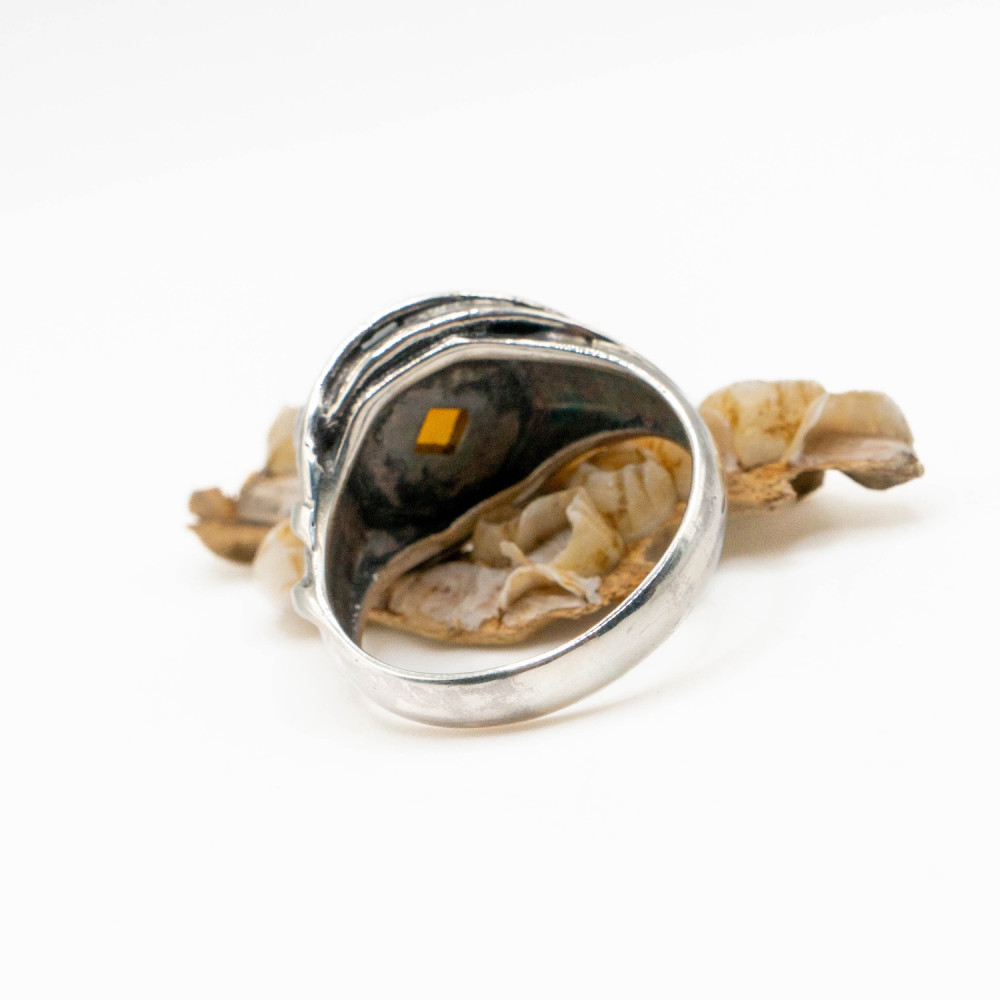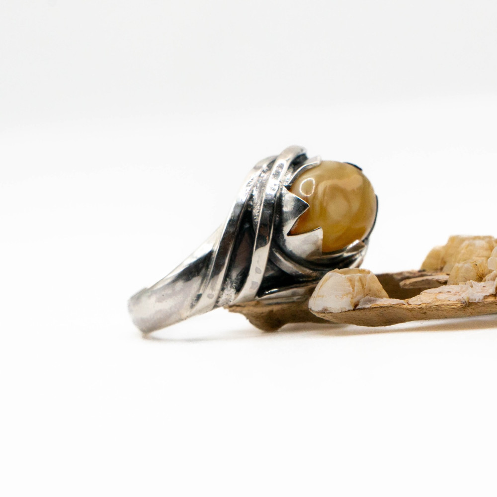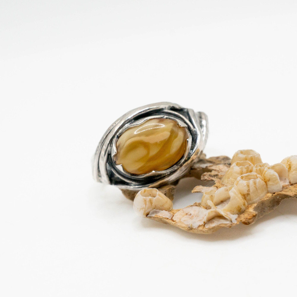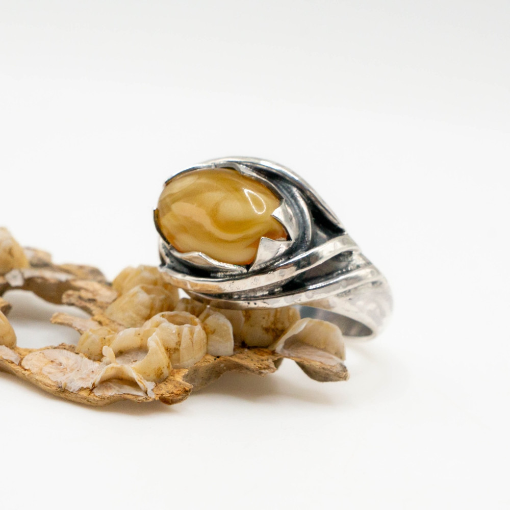 Ця авторська прикраса створена так, ніби срібло обережно огортає шматочок застиглого сонця. Органічні лінії металу формують м’яку, майже природну оправу, яка повторює форму каменю та створює відчуття руху. Гладке поліроване срібло з легкими хвилястими контурами нагадує природні потоки — ніби метал плавно обтікає бурштин, підкреслюючи його теплу глибину. Такий органічний дизайн робить каблучку схожою на маленьку скульптуру, де кожна лінія підпорядкована природній формі мінералу. Це не просто ювелірний виріб, а справжнє wearable art, створене для тих, хто відчуває красу природних форм.