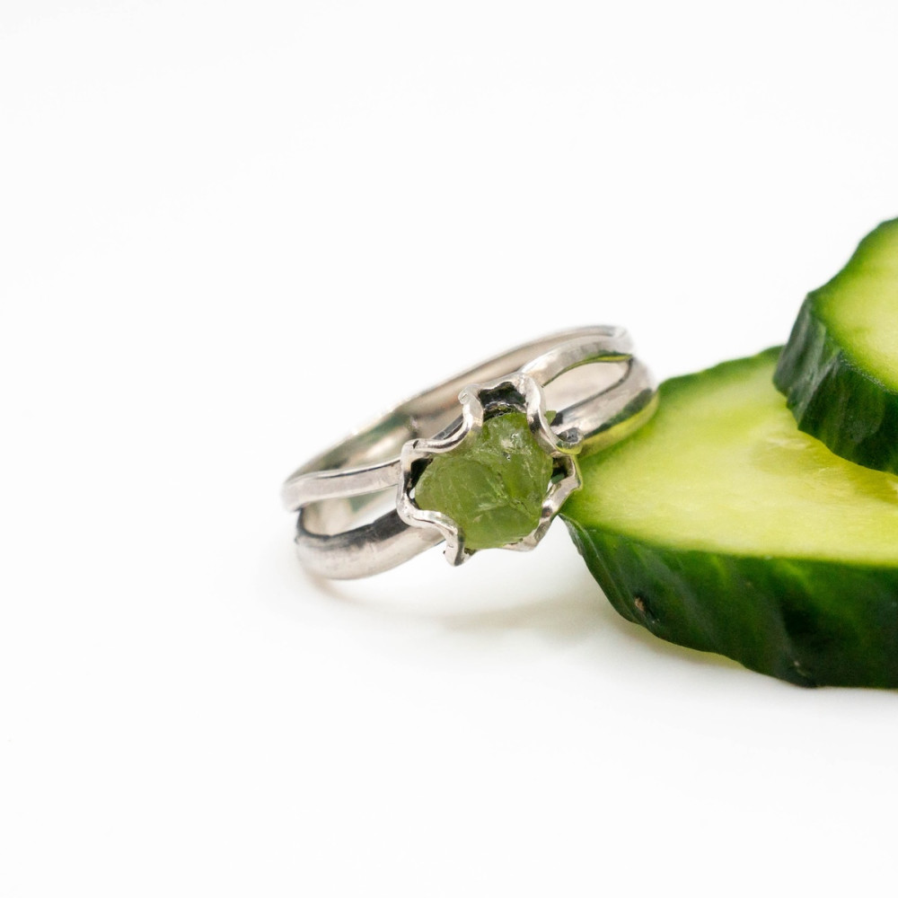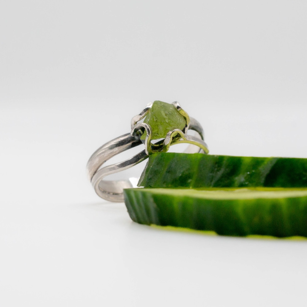 Срібна каблучка з натуральним необробленим хризолітом — прикраса живого світла.