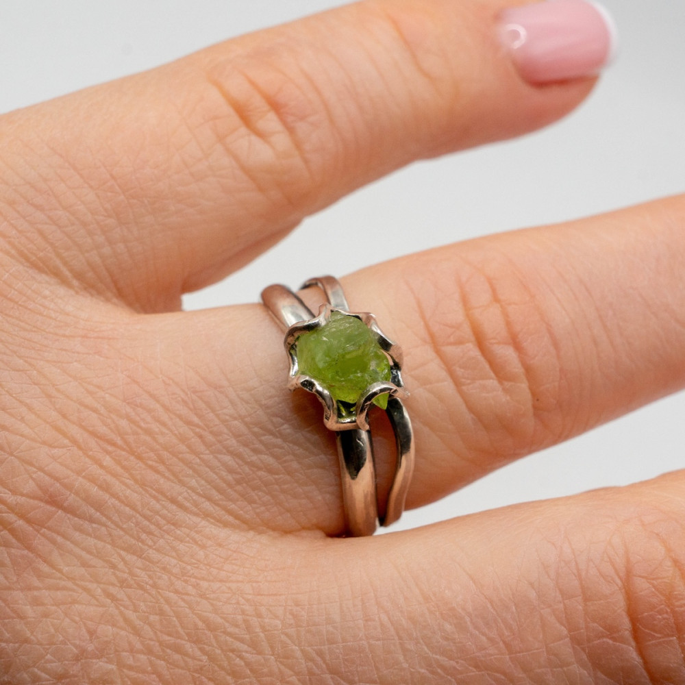 Хризоліт сяє м’яким оливково-зеленим відтінком, ніби зберігає в собі тепло сонця й подих природи. Необроблений камінь зберігає первісну форму та енергію, роблячи кожну каблучку неповторною.