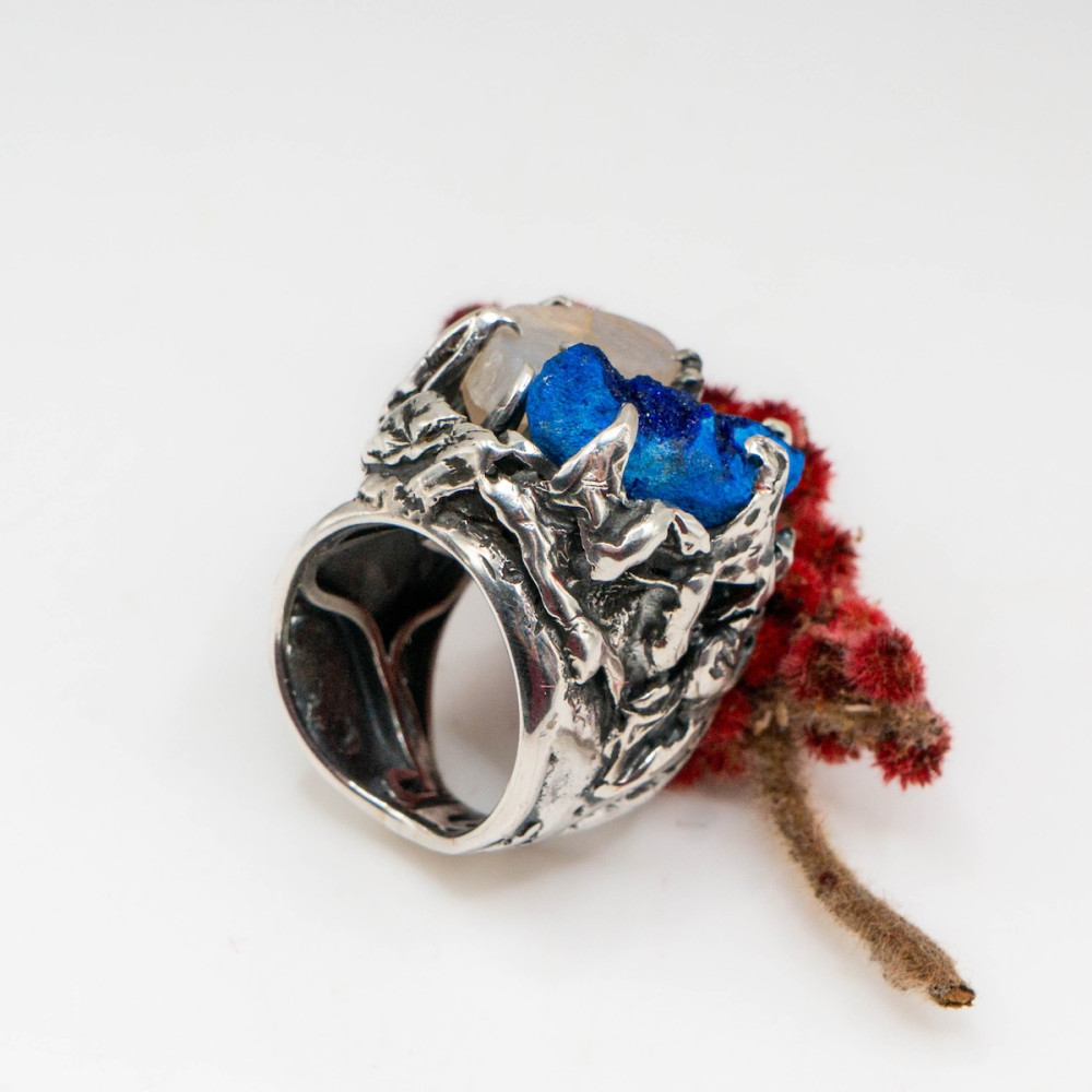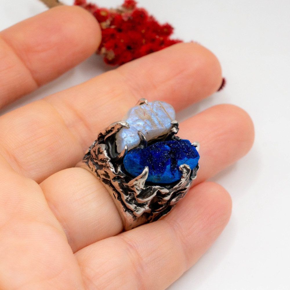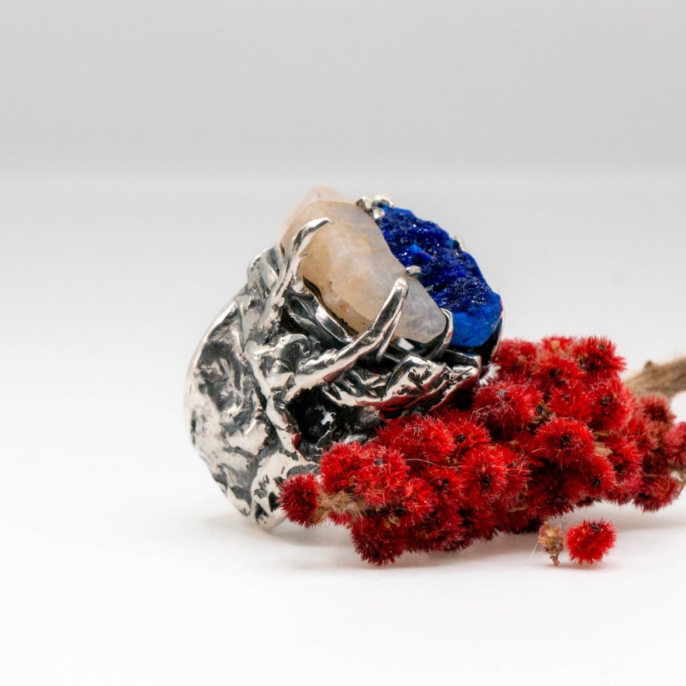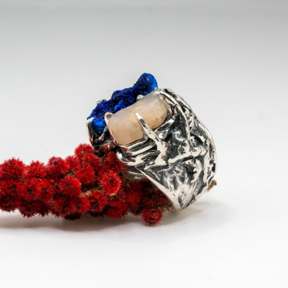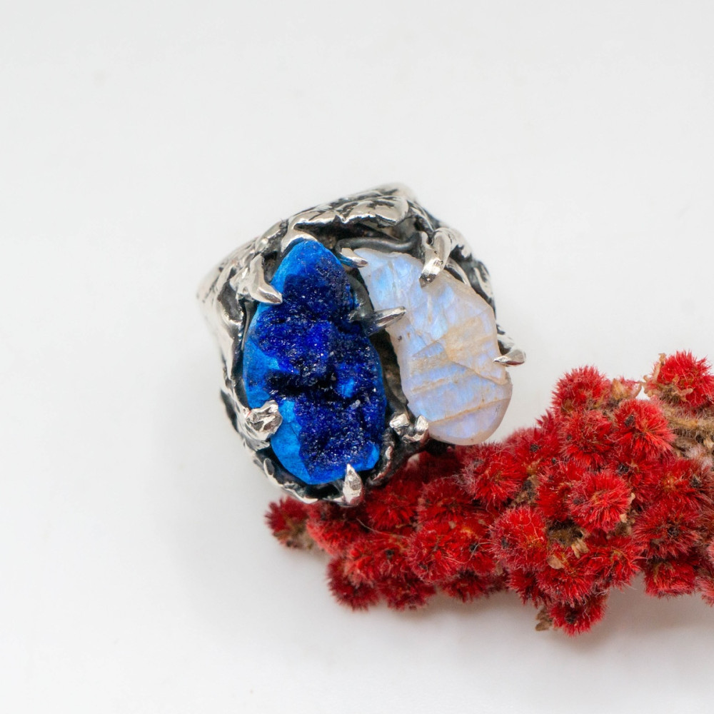 Срібна каблучка з необробленими місячним каменем та азуритом виконана у формі серця, складеного з двох природних половинок. Місячний камінь світиться ніжним перламутровим сяйвом, неначе тримає у собі спокій нічного неба. Поруч розташований насичений синій азурит — камінь із виразним характером, що нагадує про глибини земної породи.