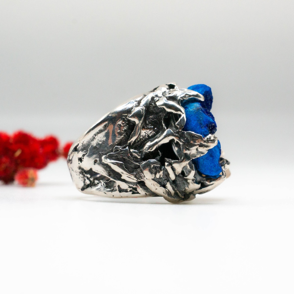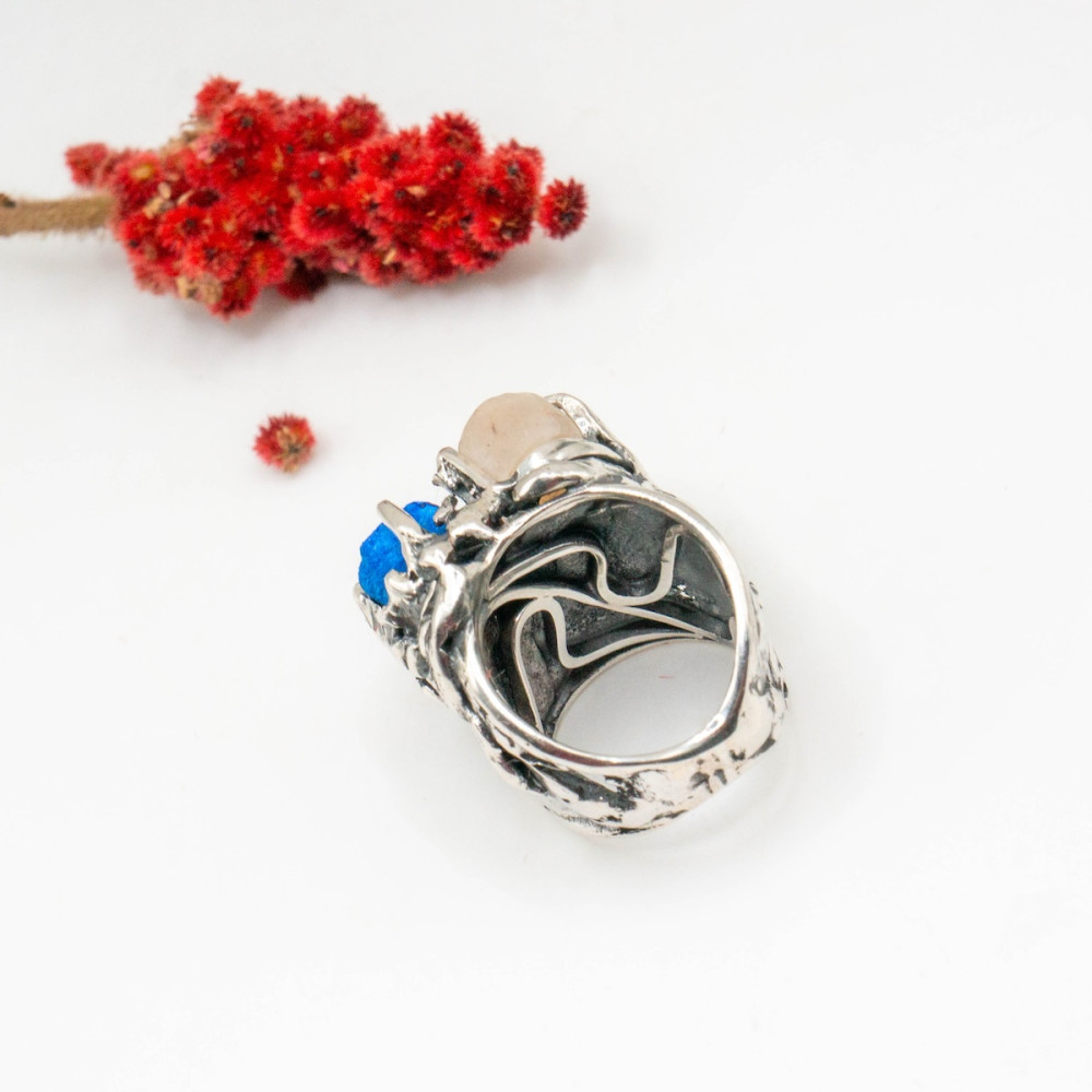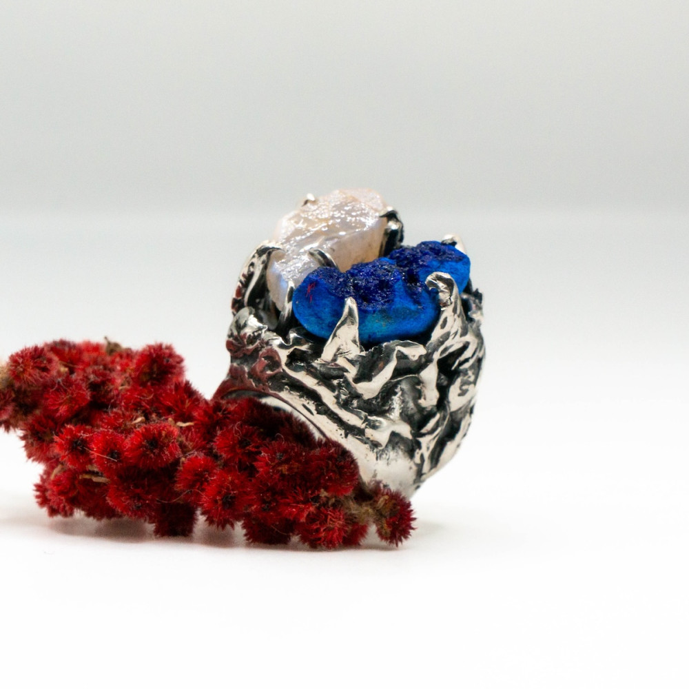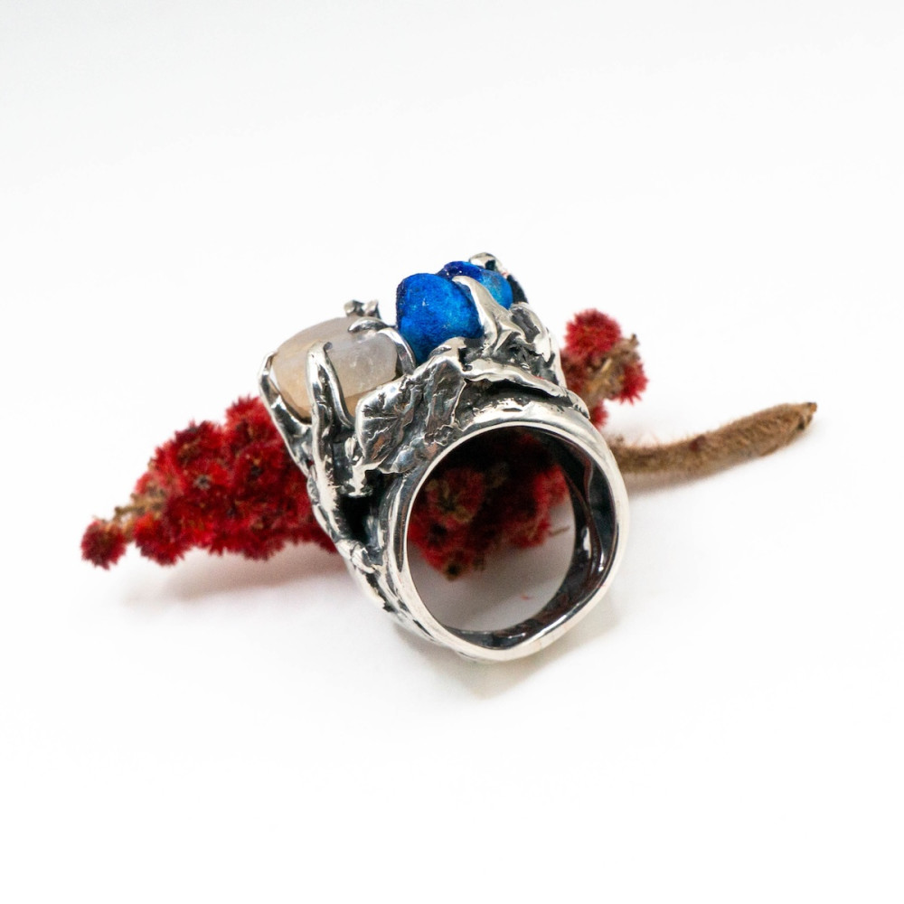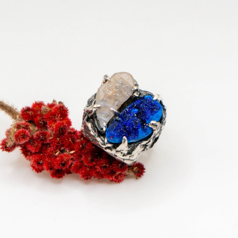 Срібна каблучка з необробленими місячним каменем та азуритом виконана у формі серця, складеного з двох природних половинок. Місячний камінь світиться ніжним перламутровим сяйвом, неначе тримає у собі спокій нічного неба. Поруч розташований насичений синій азурит — камінь із виразним характером, що нагадує про глибини земної породи.