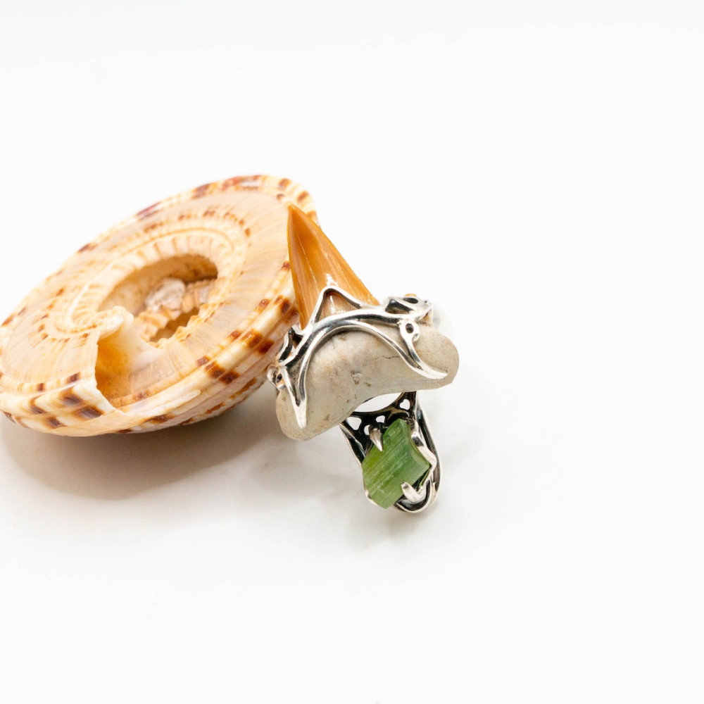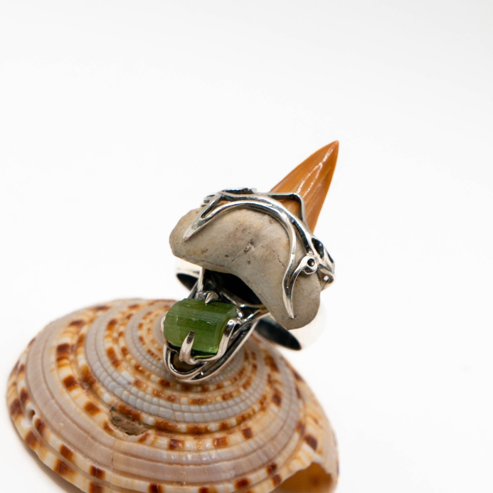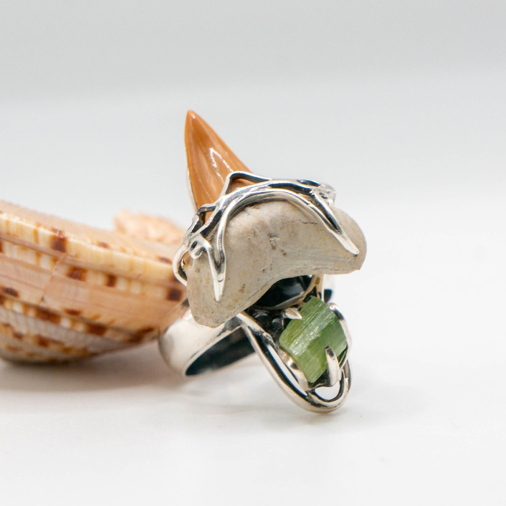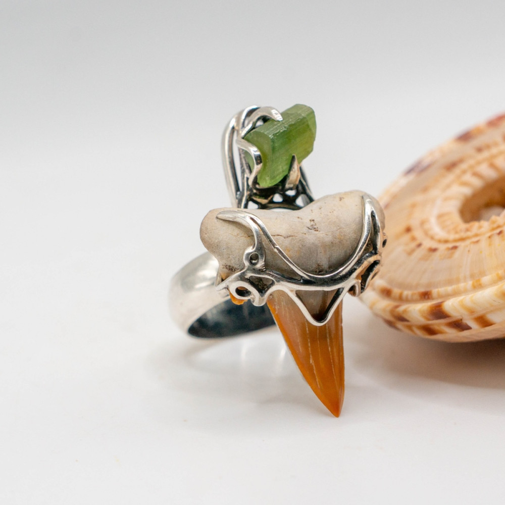 Унікальна авторська прикраса, що поєднує силу природи й мистецтво ювеліра. Масивний зуб акули, оправлений у срібло, символізує захист і мужність, а природний зелений турмалін додає енергії та гармонії.