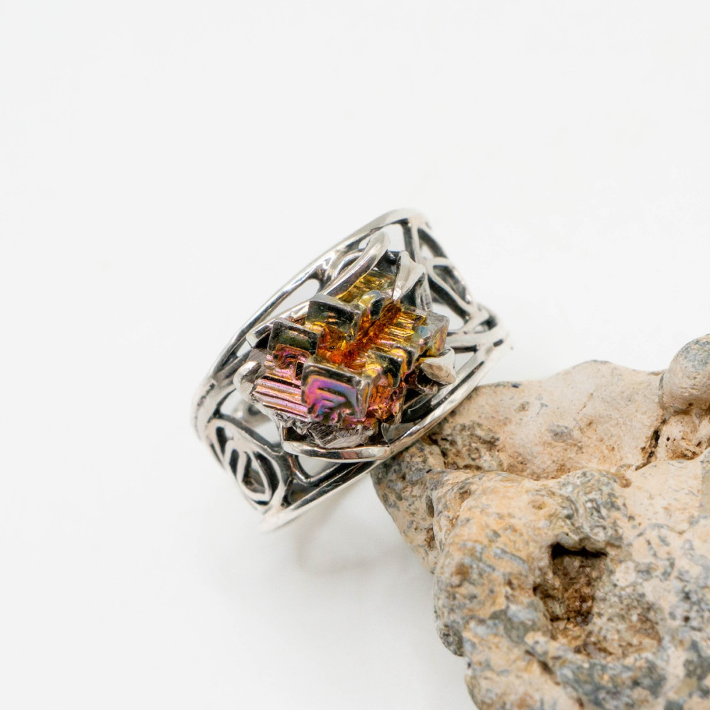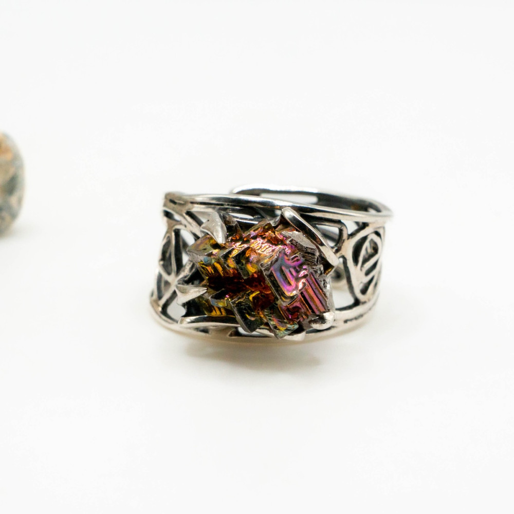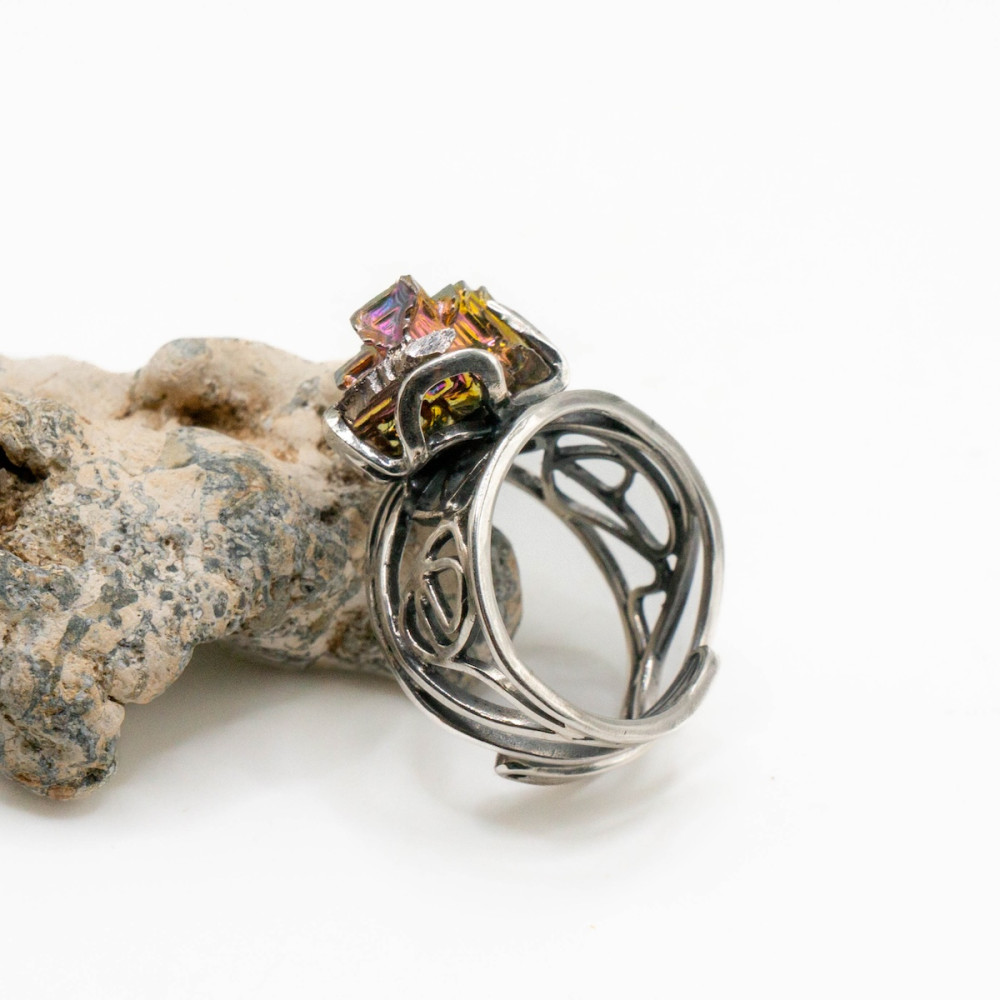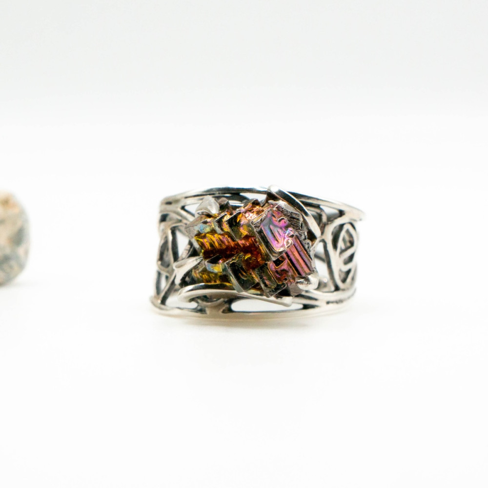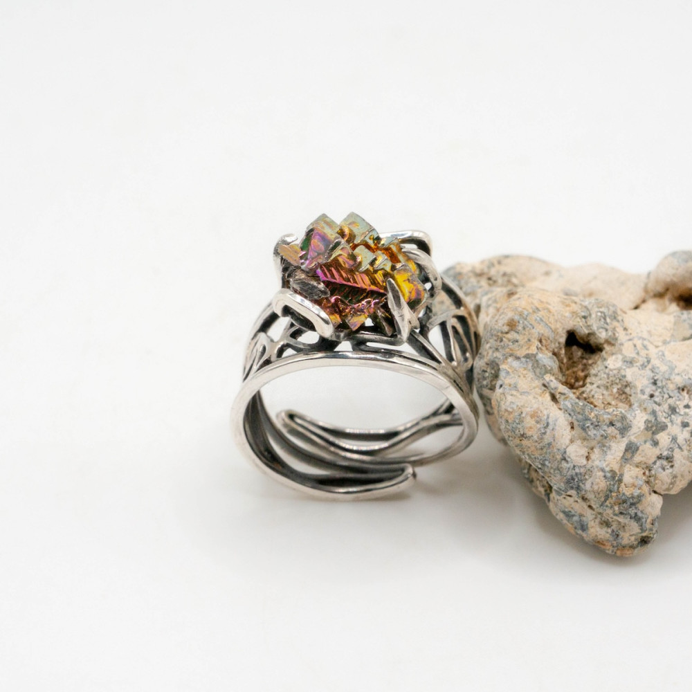 Срібна каблучка з вісмутом — прикраса, у якій природа та мистецтво поєднуються в єдине ціле. Кристал вісмуту зачаровує чіткою геометрією та райдужними переливами відтінків, що змінюються з кожним рухом руки. Його форма унікальна, мов мініатюрна архітектура, створена самою природою.